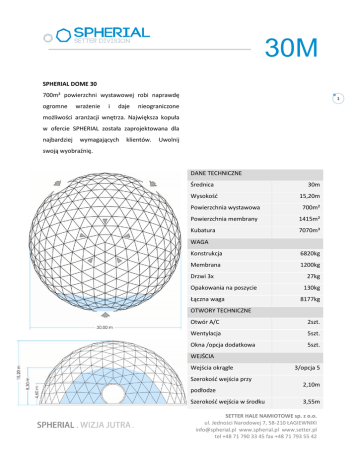 30M SPHERIAL DOME 30 700m² powierzchni wystawowej robi naprawdę ogromne wrażenie i daje 1 nieograniczone możliwości aranżacji wnętrza. Największa kopuła w ofercie SPHERIAL została zaprojektowana dla najbardziej wymagających klientów. Uwolnij swoją wyobraźnię. DANE TECHNICZNE Średnica Wysokość 30m 15,20m Powierzchnia wystawowa 700m² Powierzchnia membrany 1415m² Kubatura 7070m³ WAGA Konstrukcja 6820kg Membrana 1200kg Drzwi 3x Opakowania na poszycie Łączna waga 27kg 130kg 8177kg OTWORY TECHNICZNE Otwór A/C 2szt. Wentylacja 5szt. Okna /opcja dodatkowa 5szt. WEJŚCIA Wejścia okrągłe Szerokość wejścia przy podłodze Szerokość wejścia w środku 3/opcja 5 2,10m 3,55m SETTER HALE NAMIOTOWE sp. z o.o. ul. Jedności Narodowej 7, 58-210 ŁAGIEWNIKI [email protected] www.spherial.pl www.setter.pl tel +48 71 790 33 45 fax +48 71 793 55 42 30M Wysokość wejścia Wysokość frontu transparentnego Szerokość frontu transparentnego 3,40m OBCIĄŻENIA 8,30m Obciążenia śniegiem 25,00m Obciążenia wiatr PN-EN 1991-1-3:2005 PN-EN 1991-1-4:2008 DRZWI TWARDE opcjonalnie Drzwi przeszklone 1/5szt. Skrzydła drzwiowe 2szt. Szerokość 2m Wysokość 2m MATERIAŁ KONSTRUKCJA Rodzaje elementów konstrukcji głównej Ilość elementów konstrukcji Rodzaje elementów drzwiowych Ilość łuków wejściowych 13 678szt. 5 miejsce instalacji dodatkowego obciążenia 15szt. Najdłuższy element 2850mm DODATKOWE OBCIĄŻENIE Najkrótszy element 2,10mm Max dodatkowego obciążenia 900kg Przekrój rur 60,3mm Ilość punktów instalacji 10-25 Śruba sześciokątna M20/8.8 KOSZE TRANSPORTOWE Zabezpieczenie konstrukcji ocynk Konstrukcja 5szt. lakier Opakowania poszycie 7szt. CZAS MONTAŻU MATERIAŁ POSZYCIE Poszycie główne nie przepuszczające światła białe/białe Reakcja na ogień Część transparentna tkanina powlekany PVC 850g/m² B-s2,d0 Montaż 24-28h Demontaż 12-14h Dźwig Ilość montażystów 80t 8-10 PVC 800g/m² SETTER HALE NAMIOTOWE sp. z o.o. ul. Jedności Narodowej 7, 58-210 ŁAGIEWNIKI [email protected] www.spherial.pl www.setter.pl tel +48 71 790 33 45 fax +48 71 793 55 42 2