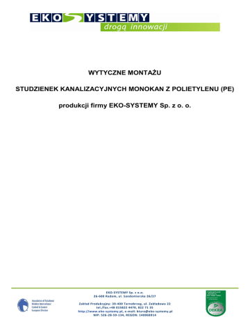 WYTYCZNE MONTAŻU STUDZIENEK KANALIZACYJNYCH MONOKAN Z POLIETYLENU (PE) produkcji firmy EKO-SYSTEMY Sp. z o. o. EKO-SYSTEMY Sp. z o.o. 26-600 Radom, ul. Sandomierska 26/27 Zakład Produkcyjny: 39-400 Tarnobrzeg, ul. Zakładowa 22 tel./fax.+48 015822 4470, 822 71 35 http://www.eko-systemy.pl, e-mail: [email protected] NIP: 526-28-59-134, REGON: 140068914 WSTĘP Przedmiotem niniejszych wytycznych montażu są studzienki kanalizacyjne przeznaczone do systemów kanalizacji grawitacyjnej (sanitarnej, przemysłowej i odwodnieniowej) oraz do montażu w systemach przewodów podziemnych zgodnie z aprobata techniczną AT/2010-02-2624 IBDiM i aprobatą techniczną AT-15-8471/2010 ITB. Studzienki kanalizacyjne z PE, podobnie jak wszystkie obiekty kubaturowe z PE przeznaczone są do posadowienia w terenie suchym pozbawionym wody gruntowej. Studzienki MONOKAN dopuszcza się do stosowania bez specjalnych ograniczeń przy występowaniu wody gruntowej do poziomu 1,0 m (0,8 m) powyżej dna kinety, przy szczególnie starannym wykonaniu podsypki i obsypki. W przypadku wyższego poziomu wody gruntowej studzienki wymagają dodatkowego dociążenia określonego w projekcie konstrukcyjnym. W trakcie montażu studzienek kanalizacyjnych należy przestrzegać obowiązujących przepisów i norm, w szczególności wynikających z: - Rozporządzenia Ministra Infrastruktury z dn. 06.02.2003r (Dz. U. nr 47) w sprawie bezpieczeństwa i higieny pracy podczas wykonywania robót budowlanych, - warunków technicznych wykonania i odbioru rurociągów z tworzyw sztucznych – COBRTI Instal, - polskiej normy PN-EN 1610 - budowa i badania przewodów kanalizacyjnych, - polskiej normy PN-EN 13598-2 – specyfikacje dla studzienek włazowych i niewłazowych obciążonych ruchem kołowym, - polskiej normy PN-EN 476 – wymagania ogólne dotyczące elementów stosowanych w systemach kanalizacji grawitacyjnej. Posadowienie studzienek obejmuje: - wykonanie wykopu, - wykonanie podsypki, - montaż studzienki i obsypkę, - montaż zwieńczenia. WYKONANIE WYKOPU i PODSYPKI Wymiary wykopu winny zapewnić wykonanie obsypki studzienki szerokości 50 cm. Po jego wykonaniu z ewentualnym równoczesnym odwadnianiem należy przygotować warstwę podsypki: - na podsypkę i obsypkę należy stosować piasek lub piasek ze żwirem o granulacji max do 32 mm; piasek nie może zawierać kamieni i innych zanieczyszczeń stałych i ostrych, które mogą spowodować uszkodzenie studzienki, - zagęszczona podsypka nie może być ani za sucha, ani za mokra; w przypadku występowania wody w wykopie należy wykop odwodnić, ponieważ nie uzyska się wymaganego stopnia zagęszczenia obsypki, - w przypadku zbyt suchej obsypki należy polewać ją wodą w celu uzyskania właściwego stopnia zagęszczenia obsypki, - stopień właściwego zagęszczenia wynosi ID = 0,93÷0,94 - minimalna wysokość zagęszczonej podsypki dolnej wynosi 15÷30 cm. POSADOWIENIE STUDZIENKI EKO-SYSTEMY Sp. z o.o. 26-600 Radom, ul. Sandomierska 26/27 Zakład Produkcyjny: 39-400 Tarnobrzeg, ul. Zakładowa 22 tel./fax.+48 015822 4470, 822 71 35 http://www.eko-systemy.pl, e-mail: [email protected] NIP: 526-28-59-134, REGON: 140068914 Przed przystąpieniem do montażu należy sprawdzić studzienkę czy nie została uszkodzona, następnie: - w warstwie podsypki należy wyprofilować ½ wysokości kinety, - ustawić i wypoziomować studzienkę w wykopie, - połączyć studzienkę z układanym kolektorem oraz przynajmniej jedną rurą za studzienką, - zasypać i zagęścić przestrzeń wokół studzienki, zagęszczenie wykonać warstwami, szczególnie starannie należy wykonać i zagęścić podsypkę pod spocznikami, - w przypadku, gdy grunt rodzimy nie odpowiada, obsypkę należy wykonać materiałami przywiezionymi, - minimalna szerokość obsypki wynosi 50 cm z każdej strony zbiornika, - zagęszczenia obsypki należy dokonywać warstwami co 30 cm, - dla studzienek umieszczonych na terenach zielonych należy uzyskać stopień zagęszczenia minimum 90%, dla studni umieszczonych w pasie drogowym należy uzyskać stopień zagęszczenia do 97%, - odwodnienia wykopu (jeśli jest wymagane) można zaprzestać dopiero po ustabilizowaniu się studni i zasypaniu jej do wysokości gwarantującej zrównoważenie sił wyporu wody gruntowej. MONTAŻ ZWIEŃCZENIA Jednym z zadań stosowanego zwieńczenia studzienek kanalizacyjnych jest zabezpieczenie ścian komory studzienki przed przenoszeniem obciążeń pionowych. Zwieńczenie studzienki stanowi pierścień odciążający, płyta pokrywowa i właz żeliwny odpowiedniej klasy A, B, C lub D zależny od klasy obciążenia nawierzchni. Średnica otworu pierścienia odciążającego winna być o 100 mm większa od zewnętrznej średnicy komory studzienki, natomiast średnica otworu płyty pokrywowej winna być dostosowana do wymiarów włazu. Montaż zwieńczenia należy prowadzić po wykonaniu obsypki i jej zagęszczeniu. Regulację wysokości studzienki należy wykonać połączeniem teleskopu, bądź np. pierścieniami betonowymi zlokalizowanymi na płycie pokrywowej. W przypadku lokalizacji studzienek w terenach zielonych (nieprzejezdnych) pokrywa studzienki winna znajdować się 15÷20 cm powyżej powierzchni przylegającego terenu, co pozwala na zastosowanie pokrywy np. z polietylenu. W przypadku stosowania włazów żeliwnych konieczne jest wykonanie pełnego zwieńczenia, tj. pierścienia i płyty. UWAGA ! 1. W przypadku występowania wody gruntowej studzienkę należy posadowić na podsypce betonowej i wykonać odciążający pierścień betonowy zgodnie z projektem konstrukcyjnym. 2. W przypadku studzienki DN600 zwieńczenie może stanowić pierścień odciążający o średnicy otworu 670 mm i średnicy zewnętrznej 1000 mm. 3. W przypadku posadawiania studni o wysokości od powyżej 3,5 m na podsypkę i obsypkę należy zastosować suchy beton. EKO-SYSTEMY Sp. z o.o. 26-600 Radom, ul. Sandomierska 26/27 Zakład Produkcyjny: 39-400 Tarnobrzeg, ul.