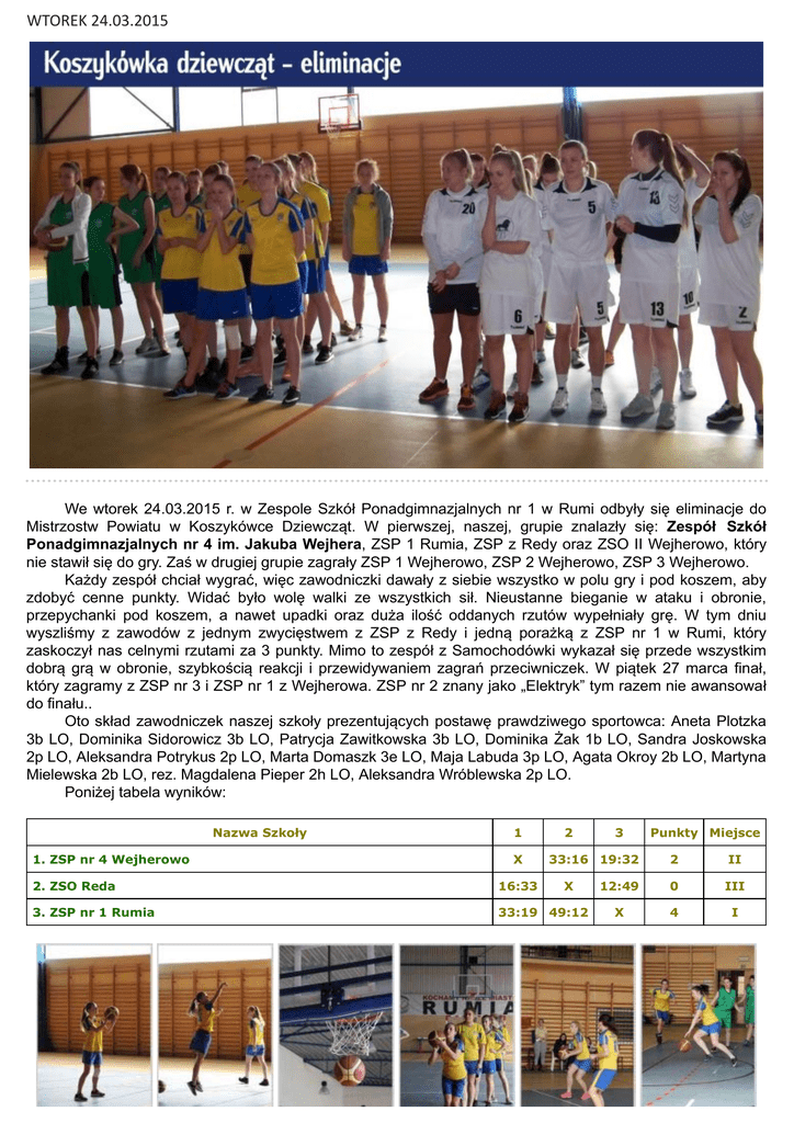 WTOREK 24.03.2015 Budowa hali warsztatowej Drukuj artykuł Lubię to! Udostępnij 2 We wtorek 24.03.2015 r. w Zespole Szkół Ponadgimnazjalnych nr 1 w Rumi odbyły się eliminacje do Mistrzostw Powiatu w Koszykówce Dziewcząt. W pierwszej, naszej, grupie znalazły się: Zespół Szkół Ponadgimnazjalnych nr 4 im. Jakuba Wejhera, ZSP 1 Rumia, ZSP z Redy oraz ZSO II Wejherowo, który nie stawił się do gry. Zaś w drugiej grupie zagrały ZSP 1 Wejherowo, ZSP 2 Wejherowo, ZSP 3 Wejherowo. Każdy zespół chciał wygrać, więc zawodniczki dawały z siebie wszystko w polu gry i pod koszem, aby zdobyć cenne punkty. Widać było wolę walki ze wszystkich sił. Nieustanne bieganie w ataku i obronie, przepychanki pod koszem, a nawet upadki oraz duża ilość oddanych rzutów wypełniały grę. W tym dniu wyszliśmy z zawodów z jednym zwycięstwem z ZSP z Redy i jedną porażką z ZSP nr 1 w Rumi, który zaskoczył nas celnymi rzutami za 3 punkty. Mimo to zespół z Samochodówki wykazał się przede wszystkim dobrą grą w obronie, szybkością reakcji i przewidywaniem zagrań przeciwniczek. W piątek 27 marca finał, który zagramy z ZSP nr 3 i ZSP nr 1 z Wejherowa. ZSP nr 2 znany jako „Elektryk” tym razem nie awansował do finału.. Oto skład zawodniczek naszej szkoły prezentujących postawę prawdziwego sportowca: Aneta Plotzka 3b LO, Dominika Sidorowicz 3b LO, Patrycja Zawitkowska 3b LO, Dominika Żak 1b LO, Sandra Joskowska 2p LO, Aleksandra Potrykus 2p LO, Marta Domaszk 3e LO, Maja Labuda 3p LO, Agata Okroy 2b LO, Martyna Mielewska 2b LO, rez. Magdalena Pieper 2h LO, Aleksandra Wróblewska 2p LO. Poniżej tabela wyników: Nazwa Szkoły 1. ZSP nr 4 Wejherowo 1 X 2 3 33:16 19:32 2. ZSO Reda 16:33 X 3. ZSP nr 1 Rumia 33:19 49:12 Punkty Miejsce 2 II 12:49 0 III X 4 I