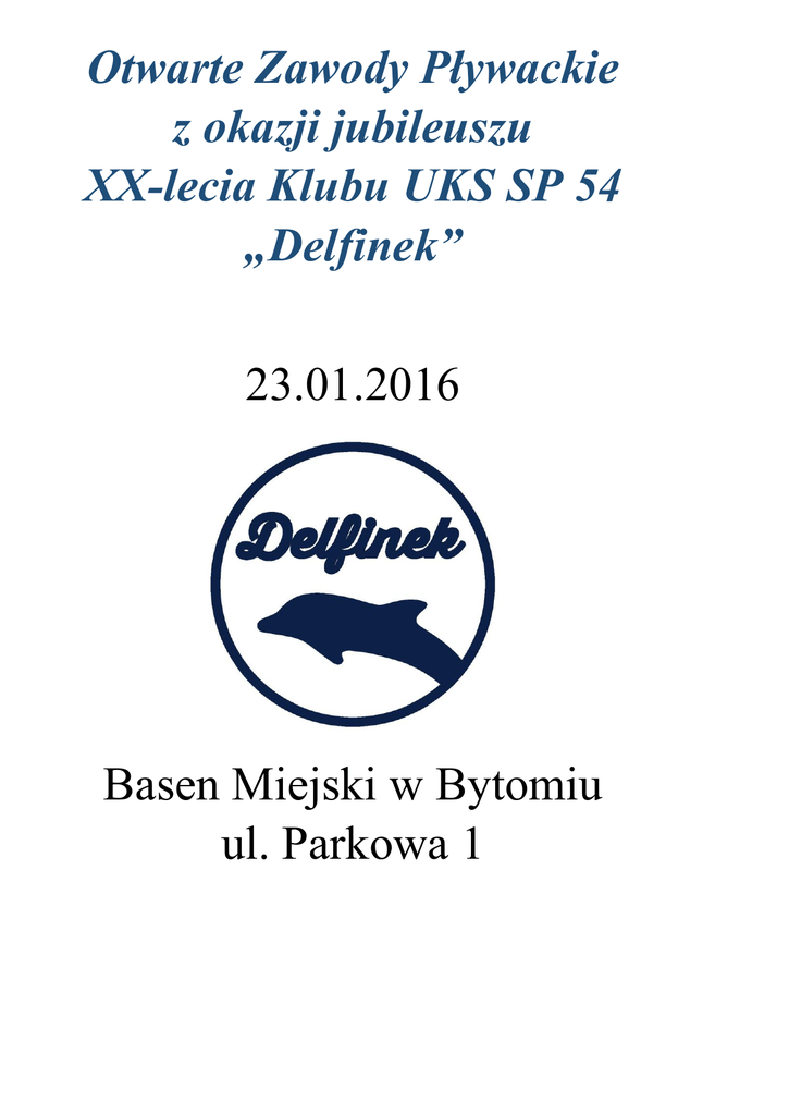 Otwarte Zawody Pływackie z okazji jubileuszu XX-lecia Klubu UKS SP 54 „Delfinek” 23.01.2016 Basen Miejski w Bytomiu ul. Parkowa 1 1.Organizatorzy UKS SP 54 „Delfinek” Bytom, ul.Reptowska 86 Ośrodek Sportu i Rekreacji w Bytomiu 2.Miejsce i termin zawodów Pływalnia Miejska w Bytomiu Ul. Parkowa 1 23.01.2016 3.Uczestnictwo W zawodach mogą uczestniczyć wszyscy zawodnicy i absolwenci klubu, uczniowie SP nr 54 im. Wacława Kuchara oraz wszyscy chętni miłośnicy pływania. 4.Nagrody Pierwsze trzy miejsca w każdej kategorii i na każdym dystansie zostaną nagrodzone medalami. Zwycięscy biegów finałowych otrzymają puchary dla najlepszych zawodników (dotyczy kategorii 5 i 6). Każdy zawodnik otrzyma certyfikat uczestnictwa oraz słodki upominek. Podział na kategorie: Kategoria Rocznik Płeć 1 2006 i młodsi K/M 2 2005 K/M 3 2004 K/M 4 2003 K/M 5 2002-1998 K/M 6 1997 i starsi K/M 5.Program zawodów 23.01.2016 Weryfikacja zawodników 8.00-8:45 Rozgrzewka 9.00-9.30 roczniki 2003 i młodsi 9.30-10.00 roczniki 2002 i starsi Uroczyste otwarcie zawodów 10.00 Start zawodów 10.15 Zakończenie zawodów 14.00 Konkurencje: Rocznik 2006 i młodsi (Kategoria 1) – 50m stylem grzbietowym, 50m stylem klasycznym i 50m stylem dowolnym K i M Rocznik 2005, 2004 i 2003 (Kategoria 2, 3 i 4) – 50m stylem motylkowym, 50m stylem grzbietowym, 50m stylem klasycznym i 50m stylem dowolnym K i M Rocznik 2002 – 1998 (Kategoria 5) - 50m stylem motylkowym, 50m stylem grzbietowym, 50m stylem klasycznym, 50m stylem dowolnym i finał 100m stylem zmiennym K i M Rocznik 1997 i starsi (Kategoria 6) - 50m stylem motylkowym, 50m stylem grzbietowym, 50m stylem klasycznym, 50m stylem dowolnym i finał 100m stylem zmiennym K i M HARMONOGRAM STARTÓW: Uwaga! Przybyli goście będą rywalizowali z zawodnikami klubu. 1. 2. 3. 4. 5. 50m stylem motylkowym K i M 50m stylem grzbietowym K i M 50m stylem klasycznym K i M 50m stylem dowolnym K i M Finały 100m stylem zmiennym K i M 6.Zgłoszenie do zawodów Zapisy będą odbywać drogą elektroniczną na adres e-mail [email protected] w nieprzekraczalnym terminie do 21.01.2016 godz. 20:00. W trakcie weryfikacji prosimy zgłosić się do biura zawodów (stolik przy w holu basenu) w celu potwierdzenia udziału i podpisania regulaminu (zawodnicy niepełnoletni z opiekunem). Lista startowa oraz wyniki zostaną opublikowane na stronie internetowej www.uks54delfinek.pl (sekcja pływacka). Po ukazaniu się na stronie listy startowej nie ma możliwości zmiany konkurencji! 7.Przepisy techniczne Zawody zostaną przeprowadzone na pływalni 25 m / 5 torów. Zawody są rozgrywane seriami na czas rozpoczynając od roczników najmłodszych do najstarszych. Zawodnicy zostaną rozstawieni losowo do serii. Każdy uczestnik ma prawo startu w dwóch konkurencjach indywidualnych. Absolwenci i przybyli goście dodatkowo będą kwalifikować się do wyścigów finałowych na podstawie liczby punków zdobytych za miejsca w dwóch konkurencjach (Kategoria 5 i 6). Punktacja: miejsce 1 – 10 pkt, miejsce 2 – 8 pkt, miejsce 3 – 7 pkt, miejsce 4 – 6 pkt itd. Jeżeli zawodnicy osiągną taką samą ilość punktów o udziale w finale decyduje lepiej punktowany wynik wg FINA. Do finałów kwalifikuje się pięć osób, które zdobyło największą ilość punktów z podziałem na kategorie rocznik 2002-1998 oraz rocznik 1997 i starsi z podziałem na kobiety i mężczyzn. Warunkiem rozegrania wyścigów finałowych jest udział co najmiej 10 osób w każdej kategorii (5 i 6) zarówno w przypadku kobiet jak i mężczyzn. 8. Zasady finansowania Udział w zawodach jest bezpłatny. 9.Postanowienia końcowe Na zawodach obowiązują przepisy PZP i FINA. W sprawach nie objętych regulaminem , komunikatem organizacyjnym decyduje naczelnik zawodów. 10.Zaświadczenie o stanie zdrowia Start w zawodach jest równoznaczny z akceptacją regulaminu zawartego w komunikacie, z brakiem przeciwwskazań zdrowotnych do udziału w zawodach oraz z deklaracją podstawowych umiejętności pływackich. 11.Kontakt z organizatorem Zgłoszenia , lista startowa , wyniki Paweł Markiefka tel. 609582226 Naczelnik zawodów Anna Kurylas tel. 603237499
