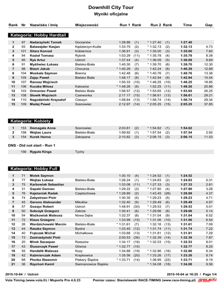 Downhill City Tour Wyniki oficjalne Rank Nr Nazwisko i Imię Miejscowość Run 1 Rank Run 2 Rank Time Gap Kategoria: Hobby Hardtail 1 2 3 4 5 6 7 8 9 10 11 12 13 14 15 97 93 101 94 95 91 98 104 105 107 106 103 108 110 109 Nadarzyński Tomek Balawejder Kasjan Sitarz Konrad Kozioł Tomasz Ryś Artur Myśliwiec Łukasz Bizoń Jakub Moskała Szymon Zając Paweł Ranosz Wojciech Kuczka Miłosz Ormaniec Paweł Słowik Wojciech Nagodziński Krzysztof Madej Paweł Gorzanów Kędzierzyn-Koźle Kobiernice Rybnik Ustroń Bielsko-Biała Chocznia Brenna Bielsko Biała Katowice Bielsko Biała Czerwonka Cieszyn Sosnowiec 1:28.86 1:33.75 1:36.91 1:53.29 1:37.44 1:45.30 * 1:40.29 1:42.48 1:48.17 1:50.33 * 1:48.26 1:56.57 2:17.17 1:58.84 2:12.97 (1) (2) (3) (11) (4) (7) (5) (6) (8) (10) (9) (12) (15) (13) (14) * 1:27.40 * 1:32.13 * 1:35.00 * 1:35.78 * 1:36.09 * 1:39.70 1:42.24 * 1:40.76 * 1:42.94 * 1:46.25 1:52.25 * 1:53.65 * 1:56.61 * 1:56.74 * 2:05.25 (1) (2) (3) (4) (5) (6) (8) (7) (9) (10) (11) (12) (13) (14) (15) 1:27.40 1:32.13 1:35.00 1:35.78 1:36.09 1:39.70 1:40.29 1:40.76 1:42.94 1:46.25 1:48.26 1:53.65 1:56.61 1:56.74 2:05.25 4.73 7.60 8.38 8.69 12.30 12.89 13.36 15.54 18.85 20.86 26.25 29.21 29.34 37.85 Sosnowiec Bielsko-Biała Zakopane 2:03.81 1:59.92 2:10.82 (2) (1) (3) * 1:54.62 * 1:57.54 * 2:06.15 (1) (2) (3) 1:54.62 1:57.54 2:06.15 2.92 11.53 1:30.10 1:26.24 1:33.08 1:29.22 * 1:28.89 1:30.35 1:32.40 1:48.91 1:30.41 1:32.37 1:33.99 * 1:31.61 1:33.45 1:33.68 2:00.53 1:34.17 * 1:32.77 1:34.88 1:35.56 * 1:33.71 (4) (1) (11) (3) (2) (5) (9) (30) (6) (8) (15) (7) (12) (13) (36) (16) (10) (19) (20) (14) * 1:24.52 * 1:24.83 * 1:27.33 * 1:27.80 1:43.45 * 1:29.23 * 1:29.49 * 1:29.53 * 1:29.66 * 1:31.04 * 1:31.06 1:32.16 * 1:31.74 * 1:31.81 * 1:32.39 * 1:32.53 (1) (2) (3) (4) (26) (5) (6) (7) (8) (9) (10) (13) (11) (12) (14) (15) * 1:32.86 * 1:33.26 1:36.95 * 1:34.08 (16) (17) (22) (18) 1:24.52 1:24.83 1:27.33 1:27.80 1:28.89 1:29.23 1:29.49 1:29.53 1:29.66 1:31.04 1:31.06 1:31.61 1:31.74 1:31.81 1:32.39 1:32.53 1:32.77 1:32.86 1:33.26 1:33.71 1:34.08 0.31 2.81 3.28 4.37 4.71 4.97 5.01 5.14 6.52 6.54 7.09 7.22 7.29 7.87 8.01 8.25 8.34 8.74 9.19 9.56 Kategoria: Kobiety 1 2 3 153 158 154 Domagała Anna Wojtas Laura Kurek Hanna DNS - Did not start - Run 1 156 Ryguła Kinga Tychy Kategoria: Hobby Full 1 2 3 4 5 6 7 8 9 10 11 12 13 14 15 16 17 18 19 20 21 71 77 75 31 76 74 45 57 50 54 72 26 44 40 73 20 43 55 42 68 36 Molek Szymon Wojtas Łukasz Karbowiak Sebastian Gapski Damian Kajetaniak Radek Zabystrzan Piotr Gerono Aleksander Goszyc Robert Sobczyk Grzegorz Maćkowiak Mateusz Klaus Grzegorz Wardzichowski Marcin Raszka Szymon Frątczak Michał Zastrzeżyński Piotr Mirek Szczepan Ślusarczyk Paweł Handzlik Mateusz Kaźmierczak Adam Płonka Sławomir Rzychoń Kamil Bielsko-Biała Bielsko-Biała Częstochowa Mikołów Ustroń Zabrze Nowa Dęba Bielsko-Biała Bystra Michałkowa Rzeszów Gliwice Kozy Krapkowice Piekary Śląskie Siemianowice Śląskie 2015-10-04 / Ustroń Vola Timing (www.vola.fr) / Msports Pro 4.0.23 2015-10-04 at 16:25 / Page 1/4 VolaSoftControlPdf Pomiar czasu: Stanisławski RACE-TIMING (www.race-timing.pl) Downhill City Tour Wyniki oficjalne Rank Nr 22 23 24 25 26 27 28 29 30 31 32 33 34 35 36 37 38 39 40 39 60 48 63 46 27 14 49 52 65 69 56 59 61 70 66 11 62 18 Nazwisko i Imię Miejscowość Kurzywilk Damian Zając Radosław Troszok Bartłomiej Kupka Jakub Zgryźniak Bartłomiej Bodzek Piotr Sorek Piotr Rapior Kamil Jarosz Krzysztof Wieciech Szymon Krzemiński Paweł Dyniec Tomasz Wac Mateusz Jakubasik Konrad Leśniok Rafał Gracjasz Michał Partyka Sebastian Marek Kamil Banasik Krzysztof Katowice Gorzanów Cieszyn Cieszyn Czerwionka-Leszczyny Kłodzko Jaworzno Zabrze Gliwice Lipnica Dolna Katowice Myślenice Tychy Tychy Katowice Chocznia Międzyrzecze Bielsko-Biała Jaworzno Run 1 Rank 1:44.43 1:45.72 * 1:34.77 * 1:34.84 * 1:35.57 * 1:37.33 * 1:39.46 * 1:43.39 * 1:44.20 * 1:45.31 * 1:47.93 1:50.84 1:53.29 1:56.42 * 1:55.39 * 1:55.92 * 2:02.25 2:36.66 * 3:39.38 (26) (28) (17) (18) (21) (22) (23) (24) (25) (27) (29) (31) (32) (35) (33) (34) (37) (38) (39) Run 2 Rank * 1:34.33 * 1:34.69 1:41.14 1:35.79 1:38.54 (19) (20) (25) (21) (23) 1:39.50 (24) 1:44.99 (27) 1:49.22 * 1:49.84 * 1:51.08 * 1:52.74 16:15.89 2:12.84 2:05.35 * 2:29.91 (28) (29) (30) (31) (35) (33) (32) (34) Time Gap 1:34.33 1:34.69 1:34.77 1:34.84 1:35.57 1:37.33 1:39.46 1:43.39 1:44.20 1:45.31 1:47.93 1:49.84 1:51.08 1:52.74 1:55.39 1:55.92 2:02.25 2:29.91 3:39.38 9.81 10.17 10.25 10.32 11.05 12.81 14.94 18.87 19.68 20.79 23.41 25.32 26.56 28.22 30.87 31.40 37.73 1:05.39 2:14.86 1:28.94 1:30.45 1:30.60 1:30.95 1:33.99 1:37.38 1:39.08 1:42.98 1:44.49 1:50.75 1.51 1.66 2.01 5.05 8.44 10.14 14.04 15.55 21.81 DNS - Did not start - Run 1 16 47 64 Klamut Grzegorz Szulc Bartosz Chałaciński Kamil Jaworzno Sosnowiec DNF - Do not finish - Run 1 36 Rzychoń Kamil Siemianowice Śląskie * 1:34.08 (18) DNS - Did not start - Run 2 18 27 43 52 65 Banasik Krzysztof Bodzek Piotr Ślusarczyk Paweł Jarosz Krzysztof Wieciech Szymon Jaworzno Kłodzko Gliwice Gliwice Lipnica Dolna * 3:39.38 * 1:37.33 * 1:32.77 * 1:44.20 * 1:45.31 (39) (22) (10) (25) (27) Gorzanów Siemianowice Sosnowiec Sosnowiec Częstochowa Częstochowa Starków Ustroń Gliwice Katowice * 1:28.94 (1) 1:31.71 (2) 1:34.51 (3) 1:35.04 (4) 1:37.95 (6) * 1:37.38 (5) 1:40.67 (7) 1:43.42 (8) 1:47.74 (9) 1:57.77 (10) Kategoria: Masters 1 2 3 4 5 6 7 8 9 10 172 167 168 166 170 162 160 174 173 175 Zalewski Rafał Sikora Jacek Magdziarz Bartosz Mołas Tomasz Durlik Jakub Pink Baldy Szczygieł Piotr Skrzypczak Łukasz Wolski Marek Ryborz Adam 1:44.51 (9) * 1:30.45 (1) * 1:30.60 (2) * 1:30.95 (3) * 1:33.99 (4) 1:40.38 (6) * 1:39.08 (5) * 1:42.98 (7) * 1:44.49 (8) * 1:50.75 (10) DNS - Did not start - Run 1 165 169 Koba Grzegorz Dziki Robert Jelenia Góra Siemianowice Śląskie 2015-10-04 / Ustroń Vola Timing (www.vola.fr) / Msports Pro 4.0.23 2015-10-04 at 16:25 / Page 2/4 VolaSoftContr