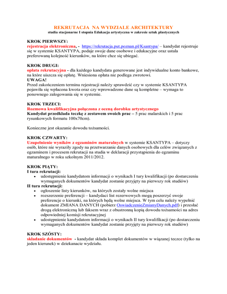REKRUTACJA NA WYDZIALE ARCHITEKTURY studia stacjonarne I stopnia Edukacja artystyczna w zakresie sztuk plastycznych KROK PIERWSZY: rejestracja elektroniczna, - https://rekrutacja.put.poznan.pl/Ksantypa/ – kandydat rejestruje się w systemie KSANTYPA, podaje swoje dane osobowe i edukacyjne oraz ustala preferowaną kolejność kierunków, na które chce się ubiegać. KROK DRUGI: opłata rekrutacyjna - dla każdego kandydata generowane jest indywidualne konto bankowe, na które uiszcza się opłatę. Wniesiona opłata nie podlega zwrotowi. UWAGA! Przed zakończeniem terminu rejestracji należy sprawdzić czy w systemie KSANTYPA pojawiła się wpłacona kwota oraz czy wprowadzone dane są kompletne – wymaga to ponownego zalogowania się w systemie. KROK TRZECI: Rozmowa kwalifikacyjna połączona z oceną dorobku artystycznego Kandydat przedkłada teczkę z zestawem swoich prac – 5 prac malarskich i 5 prac rysunkowych formatu 100x70cm). Konieczne jest okazanie dowodu tożsamości. KROK CZWARTY: Uzupełnienie wyników z egzaminów maturalnych w systemie KSANTYPA – dotyczy osób, które nie wyraziły zgody na przetwarzanie danych osobowych dla celów związanych z egzaminem i procesem rekrutacji na studia w deklaracji przystąpienia do egzaminu maturalnego w roku szkolnym 2011/2012. KROK PIĄTY: I tura rekrutacji: udostępnienie kandydatom informacji o wynikach I tury kwalifikacji (po dostarczeniu wymaganych dokumentów kandydat zostanie przyjęty na pierwszy rok studiów) II tura rekrutacji: ogłoszenie listy kierunków, na których zostały wolne miejsca rozszerzenie preferencji – kandydaci list rezerwowych mogą poszerzyć swoje preferencje o kierunki, na których będą wolne miejsca. W tym celu należy wypełnić dokument ZMIANA DANYCH (pobierz OswiadczenieZmianyDanych.pdf) i przesłać drogą elektroniczną lub faksem wraz z obustronną kopią dowodu tożsamości na adres odpowiedniej komisji rekrutacyjnej udostępnienie kandydatom informacji o wynikach II tury kwalifikacji (po dostarczeniu wymaganych dokumentów kandydat zostanie przyjęty na pierwszy rok studiów) KROK SZÓSTY: składanie dokumentów - kandydat składa komplet dokumentów w wiązanej teczce (tylko na jeden kierunek) w dziekanacie wydziału. Wymagane dokumenty: podanie (możliwość wydruku z systemu rejestracyjnego Ksantypa po ogłoszeniu list osób zakwalifikowanych do przyjęcia), kopia świadectwa dojrzałości poświadczona przez uczelnię lub notarialnie, a kandydaci z tzw. starą maturą, legitymujący się dwustronicowym świadectwem dojrzałości, składają także kopię świadectwa ukończenia szkoły średniej, zaświadczenie lekarskie od lekarza medycyny pracy. zaświadczenie lekarskie od lekarza medycyny pracy. Informujemy, że skierowanie do lekarza medycyny pracy dla Kandydatów zostanie wydane przez Wydziałową Komisję Rekrutacyjną podczas składania kompletu dokumentów. Zaświadczenie od lekarza medycyny pracy należy dostarczyć w terminie 14 dni od otrzymania skierowania. fotografia w wersji cyfrowej, 236 na 295 punktów, rozdzielczość 300pkt, na cel do wydruku w wymiarach 20 x 25 mm (format JPG, TIF, BMP lub PNG) i 2 fotografie w wersji papierowej o wymiarach 35 x 45 mm kopia dowodu osobistego, ewentualnie zaświadczenie o niepełnosprawności. Na teczce należy napisać: imię i nazwisko, adres korespondencyjny, tryb studiów (stacjonarne/niestacjonarne), wydział kierunek studiów. Jeśli procedura rekrutacyjna zakończyła się pomyślnie, to zapraszamy wspólnie z Samorządem Studentów PP do udziału w obozie integracyjno-szkoleniowym WARTO WIEDZIEĆ: o Finaliści olimpiad stopnia centralnego przyjmowani są w pierwszej kolejności, zgodnie z Uchwałą Nr 50 Senatu Akademickiego PP z dnia 27 maja 2009 r. o W Wydziale Architektury Politechniki Poznańskiej studia prowadzone są jako stacjonarne i niestacjonarne. Zajęcia na studiach niestacjonarnych odbywają się w systemie sesji wieczorowych. o Wydział Architektury prowadzi rekrutację na studia stacjonarne i niestacjonarne I stopnia rozpoczynające się semestrem zimowym (w październiku), oraz studia stacjonarne i niestacjonarne II stopnia rozpoczynające się semestrem letnim (w lutym). o Kandydat może być przyjęty tylko na jeden kierunek studiów, ale ma prawo wskazać kilka kierunków, określając preferowaną kolejność, w jakiej gotów jest podjąć na nich studia. Kandydat kwalifikowany jest na studia z zachowaniem preferencji kierunków. o Kandydat nie ma obowiązku składać dokumentów o przyjęcie na studia osobiście. Należy jednak pamiętać, że podanie powinno być przez kandydata osobiście podpisane. o Dokumenty można również przesłać pocztą, muszą one jednak zostać dostarczone przed upływam wyznaczonego terminu. Należy upewnić się, że w teczce znajduje się wymagany komplet dokumentów. o Dla osób niepełnosprawnych tworzy się dodatkowy 2% limit miejsc (ale nie mniej niż 2 miejsca) na poszczególnych kierunkach studiów. http://www.put.poznan.pl/niepelnosprawni o Z harmonogramem rekrutacji można zapoznać sie w zakładce Terminy.
