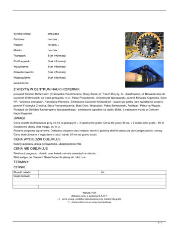 Symbol oferty: 695/2852 Państwo: no conv : Region: no conv : Miasto: no conv : Transport: Brak informacji Profil wyjazdu: Brak informacji Wyżywienie: Brak informacji Zakwaterowanie: Brak informacji Wyposażenie: Brak informacji świadczenia: Z WIZYTĄ W CENTRUM NAUKI KOPERNIK przejazd Traktem Królewskim (Krakowskie Przedmieście, Nowy Świat, pl. Trzech Krzyży, Al. Ujazdowskie, ul. Belwederska) do Łazienek Królewskich, na trasie przejazdu m.in.: Pałac Prezydencki, Uniwersytet Warszawski, pomnik Mikołaja Kopernika, Sejm RP, "dzielnica ambasad", Kancelaria Premiera. Zwiedzanie Łazienek Królewskich - spacer po parku (bez zwiedzania wnętrz): pomnik Fryderyka Chopina, Stara Pomarańczarnia, Biały Dom, Wodozbiór, Pałac Belwederski, Amfiteatr, Pałac na Wyspie. Przejazd do Biblioteki Uniwersytetu Warszawskiego - zwiedzanie ogrodów na dachu BUW, a następnie wizyta w Centrum Nauki Kopernik. UWAGI Cena została skalkulowana przy 40-45 os płacących + 3 opiekunów gratis. Cena dla grupy 30 os. + 2 opiekunów gratis - 95 zł. Dodatkowo płatny bilet wstępu ok 14 zl. Podane programy są ramowe. Dokładny program oraz miejsce, termin i godzinę zbiórki ustala się przy podpisywaniu umowy. Ceny skalkulowano z wyjazdem z Łodzi lub do 25 km od granic Łodzi. CENA WYCIECZKI OBEJMUJE Koszty autokaru, pilota-przewodnika, ubezpieczenie NW. CENA NIE OBEJMUJE Realizacji programu, obiadu oraz świadczeń nie zawartych w ofercie. Bilet wstępu do Centrum Nauki Kopernik płatny ok. 14zł / os. TERMINY: CENNIK: Długość pobytu: dni Grupa cenowa: Waluta: PLN Aktualne ceny z systemu S.A.R.T. (-) - cena usługi, podatku kalkulowana przy osobie lub gratis (*) - kwota wliczona w cenę standardową 1/1