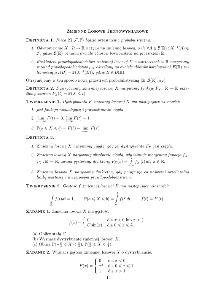 1. Odwzorowanie X : Ω → R nazywamy zmienną losową, o ile ∀A ∈ B(R) : X −1 (A) ∈