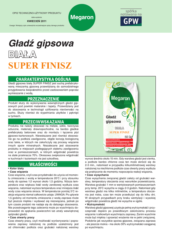 OPIS TECHNICZNO-UŻYTKOWY PRODUKTU data wydania: KWIECIEŃ 2011 Uwaga: Niniejszy opis unieważnia wcześniejsze opisy danego produktu Gładź gipsowa BIAŁA SUPER FINISZ CHARAKTERYSTYKA OGÓLNA Gładź gipsowa białą SUPER FINISZ jest suchą prefabrykowaną mieszanką gipsową przewidzianą do samodzielnego przygotowania bezpośrednio przed zastosowaniem poprzez wymieszanie z wodą. PRZEZNACZENIE Produkt służy do wykonywania wewnętrznych gładzi gipsowych pod powłoki malarskie i tapety. Przewidziany jest do stosowania w technologii szlifowania nierówności na sucho. Służy również do wypełniania ubytków i pęknięć w tynkach. PRZECIWWSKAZANIA Produktu nie należy stosować na metale, szkło, tworzywa sztuczne, materiały drewnopochodne, na bardzo gładkie prefabrykaty betonowe oraz do montażu i łączenia płyt gipsowo-kartonowych. Niewskazane jest również stosowanie go na podłoża zawilgocone, objęte korozją biologiczną oraz takie, w których nie zakończyły się procesy wiązania innych spoiw mineralnych. Niezalecane jest stosowanie produktu w miejscach podlegających stałemu zawilgoceniu oraz w pomieszczeniach, w których wilgotność powietrza na stałe przekracza 70%. Okresowa zwiększona wilgotność w kuchniach i łazienkach nie jest szkodliwa. WŁAŚCIWOŚCI • Kolor biały • Czas wiązania Czas wiązania, czyli czas przydatności do użycia od momentu zmieszania z wodą w temperaturze 20°C i przy stosunku wody do spoiwa 1:2 wynosi około 1,5 godziny. Niższa temperatura oraz większa ilość wody zarobowej wydłuża czas wiązania, natomiast wyższa temperatura oraz mniejsza ilość wody czas wiązania skraca. W temperaturze poniżej 5°C reakcja wiązania niemal całkowicie ustaje. UWAGA: Po upływie 1,5 godziny od momentu zmieszania z wodą zaprawa może być jeszcze miękka i wydawać się niezwiązana, jednak po tym czasie produkt nie nadaje się do dalszego stosowania. Nie przestrzeganie tego zalecenia może po wyschnięciu doprowadzić do spękania powierzchni lub utraty wewnętrznej spójności gładzi. • Czas otwarty pracy Czas otwarty pracy, czyli możliwość wyrównywania i poprawiania zaprawy nałożonej na podłoże uzależniony jest od chłonności podłoża oraz grubości nałożonej warstwy Gładź gipsowa BIAŁA SUPER FINISZ 20 kg Łatwoszlifowalna Metoda pracy - nałóż 3-5 mm, poczekaj aż wyschnie, zeszlifuj. wynosi średnio około 15 min. Gdy warstwa gładzi jest cienka, a podłoże bardzo chłonne czas ten może skrócić się do 2-3 min., natomiast w przypadku kilkumilimetrowej warstwy nałożonej na niechłonne podłoże czas otwarty pracy wydłuża się praktycznie do momentu rozpoczęcia reakcji wiązania. • Czas wysychania Czas wysychania związanej gładzi zależy od grubości warstwy, temperatury otoczenia oraz warunków przewietrzania. Warstwa grubości 1 mm w wentylowanych pomieszczeniach przy temp. 20°C wysycha w ciągu 2-3 godzin. Natomiast gdy warstwa gładzi ma kilka milimetrów, a temperatura otoczenia jest niska, czas ten może przedłużyć się do kilku dni. W skrajnych przypadkach przy braku wentylacji i wysokiej wilgotności powietrza gładź nie wysycha w ogóle. • Wytrzymałość Warstwa gładzi gipsowej uzyskuje pełną wytrzymałość i przyczepność dopiero po prawidłowym zakończeniu procesu wiązania i całkowitym wyschnięciu zaprawy. Zanim wyschnie może być miękka i sprawiać wrażenie nie w pełni związanej. Podobnie jak wszystkie spoiwa gipsowe, związana zaprawa - ale jeszcze mokra - ma około 30% wytrzymałości osiąganej po wyschnięciu. • Grubość warstwy Prawidłowa grubość gładzi gipsowych wynosi od 1 do 3 mm jednak w zależności od potrzeb, jednorazowo można nakładać warstwę o znacznie większej grubości, o ile pozwoli na to konsystencja zaprawy. Przy nakładaniu warstw cieńszych niż 1 mm zachodzi ryzyko odparowania wody zanim zakończy się reakcja wiązania, a co za tym idzie gładź nie uzyska właściwości nośnych pod powłoki malarskie lub tapety. • Podczas wiązania i wysychania nie kurczy się. PRZYGOTOWANIE PODŁOŻA Produkt przewidziany jest do stosowania bez gruntowania na wszelkie typowe podłoża budowlane, jak: tynki wapienne, cementowe i gipsowe, bloczki gipsowe, beton, gazobeton, płyty g-k oraz trwałe powłoki malarskie z farby emulsyjnej, ftalowej i olejnej. Wcześniejsze moczenie podłoża nie jest zalecane. Przed przystąpieniem do pracy należy usunąć pył, obsypujące się stare warstwy oraz nietrwałe powłoki malarskie, jak farba wapienna czy klejowa. Brud, tłuszcz oraz sadzę należy zmyć wodą pod ciśnieniem lub detergentami. PRZYGOTOWANIE ZAPRAWY Do zarobienia zaprawy należy używać wyłącznie czystej wody, najlepiej pitnej o temperaturze od 5 do 30°C w proporcjach 1 l wody na 2 kg spoiwa. Zaprawę można mieszać ręcznie lub mechanicznie używając mieszadeł elektrycznych. W przypadku ręcznego mieszania suchy produkt należy wsypywać do wody, tak aby porcje produktu same namakały i opadały na dno. Czynność należy kontynuować, aż do wchłonięcia całej wody. Po dokładnym wymieszaniu zaprawa jest gotowa do użycia. W przypadku mieszania mechanicznego, suchy produkt należy jednorazowo wsypać do odmierzonej ilości wody i nie czekając, aż namoknie, dokładnie wymieszać do uzyskania jednorodnej masy. Na początku mieszania zaprawa jest rzadsza, co ułatwia mieszanie. Po około 1 minucie od momentu wsypania produktu do wody zaczyn gęstnieje. Po dalszych 2-3 min. gęstość zaprawy osiąga ostateczną konsystencję. W przypadku otrzymania zbyt rzadkiej lub zbyt gęstej zaprawy należy dodać odpowiednią ilość suchego produktu lub wody i ponownie wymieszać. Czynność korygowania gęstości można przeprowadzić najwyżej w ciągu pierwszych 10 minut. Zaprawę należy przygotowywać wyłącznie w nierdzewnych naczyniach pozbawionych resztek związanego gipsu. TECHNOLOGIA PRACY Zalecaną technologią wygładzania 