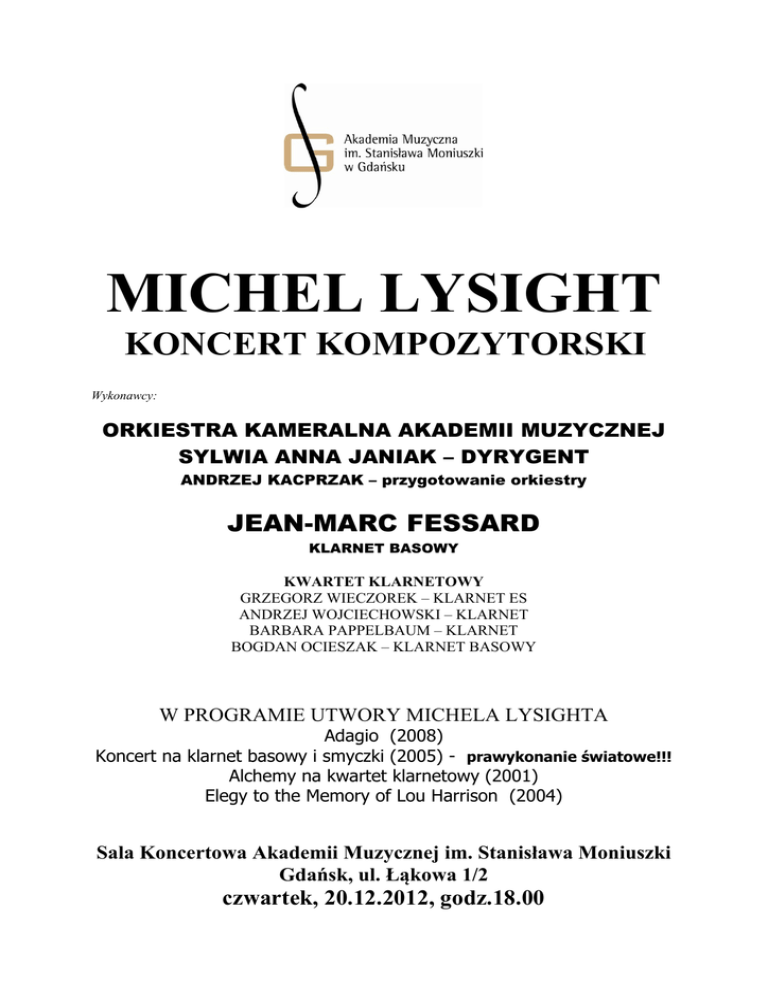 MICHEL LYSIGHT KONCERT KOMPOZYTORSKI Wykonawcy: ORKIESTRA KAMERALNA AKADEMII MUZYCZNEJ SYLWIA ANNA JANIAK – DYRYGENT ANDRZEJ KACPRZAK – przygotowanie orkiestry JEAN-MARC FESSARD KLARNET BASOWY KWARTET KLARNETOWY GRZEGORZ WIECZOREK – KLARNET ES ANDRZEJ WOJCIECHOWSKI – KLARNET BARBARA PAPPELBAUM – KLARNET BOGDAN OCIESZAK – KLARNET BASOWY W PROGRAMIE UTWORY MICHELA LYSIGHTA Adagio (2008) Koncert na klarnet basowy i smyczki (2005) - prawykonanie światowe!!! Alchemy na kwartet klarnetowy (2001) Elegy to the Memory of Lou Harrison (2004) Sala Koncertowa Akademii Muzycznej im. Stanisława Moniuszki Gdańsk, ul. Łąkowa 1/2 czwartek, 20.12.2012, godz.18.00