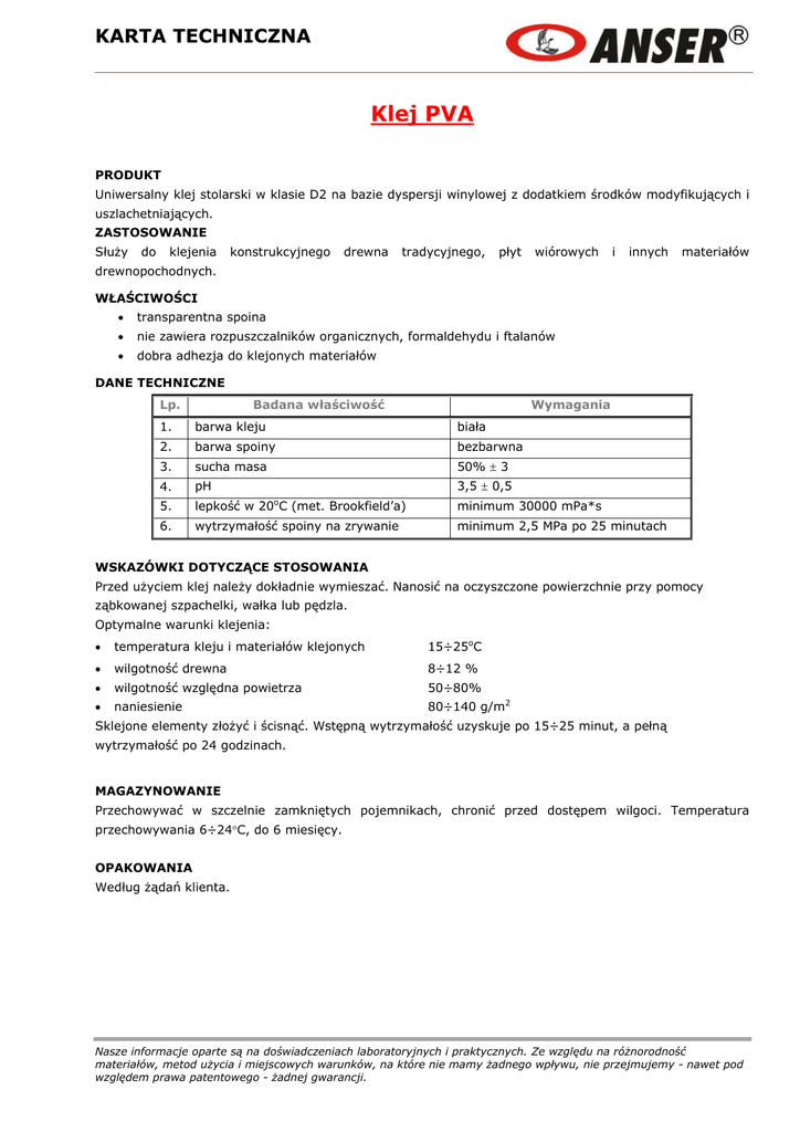 KARTA TECHNICZNA Klej PVA PRODUKT Uniwersalny klej stolarski w klasie D2 na bazie dyspersji winylowej z dodatkiem środków modyfikujących i uszlachetniających. ZASTOSOWANIE Służy do klejenia konstrukcyjnego drewna tradycyjnego, płyt wiórowych i innych materiałów drewnopochodnych. WŁAŚCIWOŚCI • transparentna spoina • nie zawiera rozpuszczalników organicznych, formaldehydu i ftalanów • dobra adhezja do klejonych materiałów DANE TECHNICZNE Lp. Badana właściwość Wymagania 1. barwa kleju biała 2. barwa spoiny bezbarwna 3. sucha masa 50% ± 3 4. pH 3,5 ± 0,5 o 5. lepkość w 20 C (met. Brookfield’a) minimum 30000 mPa*s 6. wytrzymałość spoiny na zrywanie minimum 2,5 MPa po 25 minutach WSKAZÓWKI DOTYCZĄCE STOSOWANIA Przed użyciem klej należy dokładnie wymieszać. Nanosić na oczyszczone powierzchnie przy pomocy ząbkowanej szpachelki, wałka lub pędzla. Optymalne warunki klejenia: 15÷25oC • temperatura kleju i materiałów klejonych • wilgotność drewna 8÷12 % • wilgotność względna powietrza 50÷80% • naniesienie 80÷140 g/m2 Sklejone elementy złożyć i ścisnąć. Wstępną wytrzymałość uzyskuje po 15÷25 minut, a pełną wytrzymałość po 24 godzinach. MAGAZYNOWANIE Przechowywać w szczelnie zamkniętych pojemnikach, chronić przed dostępem wilgoci. Temperatura przechowywania 6÷24°C, do 6 miesięcy. OPAKOWANIA Według żądań klienta. Nasze informacje oparte są na doświadczeniach laboratoryjnych i praktycznych. Ze względu na różnorodność materiałów, metod użycia i miejscowych warunków, na które nie mamy żadnego wpływu, nie przejmujemy - nawet pod względem prawa patentowego - żadnej gwarancji.