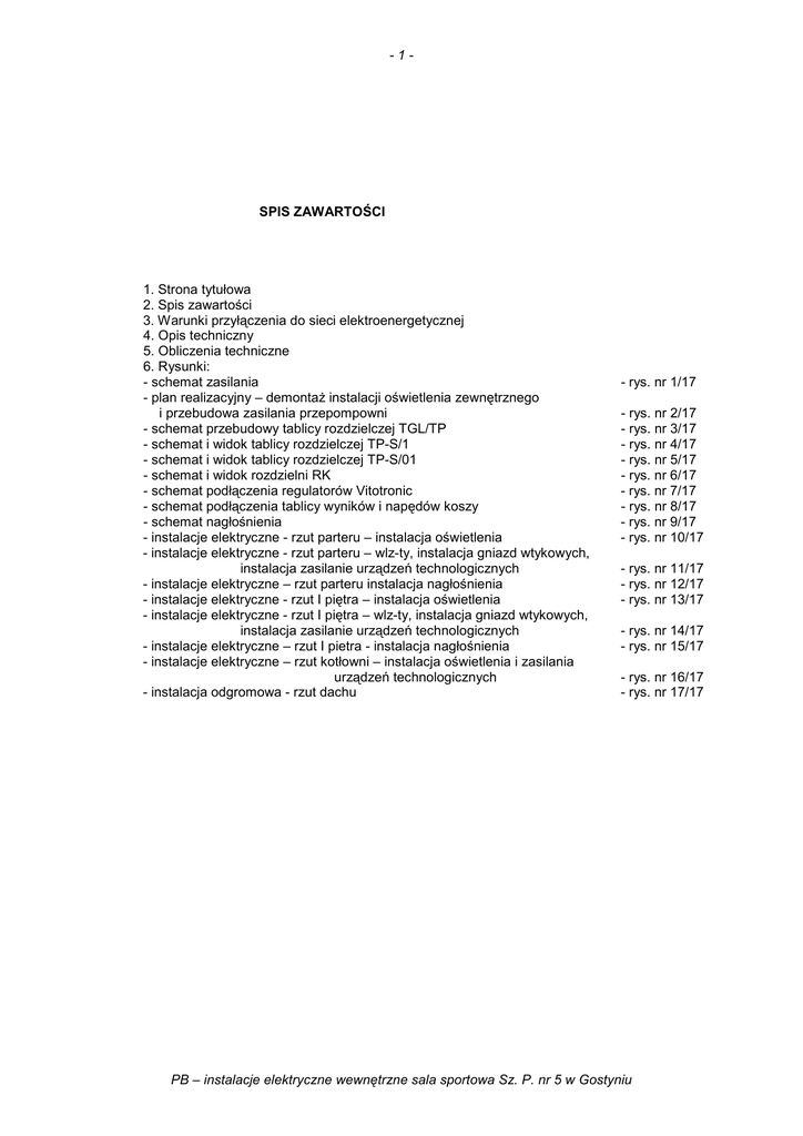 -1- SPIS ZAWARTOŚCI 1. Strona tytułowa 2. Spis zawartości 3. Warunki przyłączenia do sieci elektroenergetycznej 4. Opis techniczny 5. Obliczenia techniczne 6. Rysunki: - schemat zasilania - plan realizacyjny – demontaŜ instalacji oświetlenia zewnętrznego i przebudowa zasilania przepompowni - schemat przebudowy tablicy rozdzielczej TGL/TP - schemat i widok tablicy rozdzielczej TP-S/1 - schemat i widok tablicy rozdzielczej TP-S/01 - schemat i widok rozdzielni RK - schemat podłączenia regulatorów Vitotronic - schemat podłączenia tablicy wyników i napędów koszy - schemat nagłośnienia - instalacje elektryczne - rzut parteru – instalacja oświetlenia - instalacje elektryczne - rzut parteru – wlz-ty, instalacja gniazd wtykowych, instalacja zasilanie urządzeń technologicznych - instalacje elektryczne – rzut parteru instalacja nagłośnienia - instalacje elektryczne - rzut I piętra – instalacja oświetlenia - instalacje elektryczne - rzut I piętra – wlz-ty, instalacja gniazd wtykowych, instalacja zasilanie urządzeń technologicznych - instalacje elektryczne – rzut I pietra - instalacja nagłośnienia - instalacje elektryczne – rzut kotłowni – instalacja oświetlenia i zasilania urządzeń technologicznych - instalacja odgromowa - rzut dachu - rys. nr 1/17 - rys. nr 2/17 - rys. nr 3/17 - rys. nr 4/17 - rys. nr 5/17 - rys. nr 6/17 - rys. nr 7/17 - rys. nr 8/17 - rys. nr 9/17 - rys. nr 10/17 - rys. nr 11/17 - rys. nr 12/17 - rys. nr 13/17 - rys. nr 14/17 - rys. nr 15/17 - rys. nr 16/17 - rys. nr 17/17 PB – instalacje elektryczne wewnętrzne sala sportowa Sz. P. nr 5 w Gostyniu -2- 4. OPIS TECHNICZNY do projektu technicznego instalacji elektrycznych wewnętrznych sali sportowej Szkoły Podstawowej nr 5 przy ul. Granicznej 1 w Gostyniu 4.1. Podstawy opracowania. - zlecenie Inwestora, - podkłady budowlane w skali 1: 100, 1:200, - projekt technologiczny, - uzgodnienia branŜowe, - obowiązujące przepisy i normy. 4.2. Zakres opracowania. - dane ogólne, - sposób zasilania, - tablice rozdzielcze, - wewnętrzne linie zasilające tablice rozdzielcze, - instalacje oświetleniową i gniazd wtyczkowych 1 - fazowych, - instalacja zasilania urządzeń technologicznych, - oświetlenie zewnętrzne, - instalacja sterowania i sygnalizacji, - instalacja systemu instalacji bezpieczeństwa instalacji gazowej, - instalacja połączeń wyrównawczych, - instalacja odgromowa, - instalacje przeciwporaŜeniowe, - instalacja nagłośnieniowa, - uwagi końcowe. 4.3. Dane ogólne. Projektowany budynek wykonany będzie z elementów tradycyjnych i Ŝelbetowych. Konstrukcja dachu wykonana będzie z elementów drewnianych. Pokrycie dachu płyty stalowe z warstwą ocieplającą pokryte papą. Opracowany projekt techniczny instalacji obejmuje instalacje elektryczne wewnętrzne związane z pomieszczeniami sali sportowej oraz modernizację istniejącej kotłowni gazowej i modernizację tablicy głównej. 4.4. Dane techniczne - źródło zasilania – istniejące złącze kablowe usytuowane na zewnętrznej ścianie budynku Szkoły Podstawowej nr 5 od strony ul. Granicznej zasilane linią kablową wyprowadzoną ze stacji transformatorowej nr 05 – 639 Gostyń - napięcie zasilania 400V/230V - moc zainstalowana projektowanej sali sportowej Pi = 69,5 kW - moc zapotrzebowana projektowanej sali sportowej Pz = 31,2 kW - moc zainstalowana całej Szkoły łącznie z projektowaną salą sportową Pi = 142,2 kW - moc zapotrzebowana całej Szkoły łącznie z projektowaną salą sportową Pz = 66,5 kW - moc przyłączeniowa wg nowych warunków Pp = 70,0 kW - układ zasilania całego obiektu TN-S - ochrona od poraŜeń – szybkie wyłączenie napięcia 4.5. Sposób zasilania Zasilanie budynku sali sportowej zgodnie z uzgodnieniami z uŜytkownikiem oraz otrzymanymi warunkami przyłączenia odbywać się będzie z istniejącej tablicy głównej budynku Szkoły. W związku z przyłączeniem nowego obiektu nastąpi wzrost mocy o ok. 30,0 kW . Wzrost mocy wymusza przebudowę układu pomiarowego na układ półpośredni. Na istniejącej tablicy głównej w przeszłości był zamontowany taki układ. Głownym punktem rozdziału energii elektrycznej w Sali gimnastycznej będzie tablica rozdzielcza TP-S/1 na I pietrze do której podłączona zostanie tablica TP-S/01 na parterze oraz rozdzielnia urządzeń wentylacyjnych RW. PB – instalacje elektryczne wewnętrzne sala sportowa Sz. P. nr 5 w Gostyniu -3- W związku z rozbudową tablicy głównej o nowy układ pomiarowy projektuje się jej całkowita modernizację. Modernizacja polegać będzie na wymianie istniejącej aparatury, która zamontować naleŜy w istniejącej obudowie. 4.6. Tablice rozdzielcze Projekt przewiduje wykonanie następujących tablic rozdzielczych: na parterze w części istniejącej Szkoły modernizację tablicy głownej TGL/TP - na parterze sali gimnastycznej tablicę TP-S/01 - na I pietrze sali sportowej tablicę TP-S/1 - w kotłowni rozdzielnia RK Tablice i rozdzielnie wykonać naleŜy wg przedstawionych schematów. Jako obudowy nowych tablic zaprojektowano typowe obudowy produkowane przez firmę Legrand. Schematy tablic i rozdzielni pokazano na rys nr 3/17 – 6/17. 4.7. Wewnętrzne linie zasilające tablice rozdzielcze Do zasilania tablic i rozdzielni w projektowanej sali sportowej projektuje się wykonanie następujących wewnętrznych linii zasilających wlz-tów: - od istn. złącza kablowego z wyłącznikiem p.poŜ do tablicy TGL/TP – wymianę istn przewodu na przewody YLY 4x70 mm2 + YLY 1x35 mm2 ułoŜone pod tynkiem - od tablicy TGL/TP do tablic TP-S/01 – przewód YLY (Ŝo) 5x35 mm2 ułoŜone na korytkach i pod tynkiem - od tablicy TP-S/1 do tablic TP-S/01 - przewód YLY(Ŝo) 5x16 mm2 ułoŜone pod tynkiem - od tablicy TP-S/01 do rozdzielni RW – przywód YDY(Ŝo) 5x6 mm2 ułoŜony pod tynkiem - od rozdzielni R-1 do rozdzielni RK ( w kotłowni ) – przewód YDY(Ŝo) 5x6 mm2 w rurze na tynku 4.8. Instalacje oświetleni