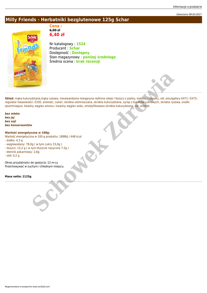Informacje o produkcie Utworzono 08-03-2017 Milly Friends - Herbatniki bezglutenowe 125g Schar Cena : 6,90 zł 6,40 zł w ia Nr katalogowy : 1524 Producent : Schar Dostępność : Dostępny Stan magazynowy : poniżej średniego Średnia ocena : brak recenzji bez bez bez bez mleka jaj soji konserwantów Sc ho Masa netto: 2125g w Okres przydatności do spożycia: 12 m-cy Przechowywać w suchym i chłodnym miejscu. ek Wartość energetyczna w 100g: Wartość energetyczna w 100 g produktu: 1888kJ / 448 kcal - białko: 4,3 g - węglowodany: 78,0g ( w tym cukry 15,0g ) - tłuszcz: 13,2 g ( w tym tłuszcze nasycone 7,5g ) - błonnik pokarmowy: 2,6g - sód: 0,2 g Wygenerowano w programie www.oscGold.com Zd ro Skład: mąka kukurydziana,mąka ryżowa, nieutwardzona margaryna roślinna (oleje i tłuszcz z palmy, kokosu i rzepaku, sól, emulgatory E471 i E475, regulator kwasowości: E330, aromat), cukier, skrobia ziemniaczana, skrobia kukurydziana, syrop z buraków cukrowych, skrobia ryżowa, srodki spulchniające: kwaśny węglan amonu i kwaśny węglan sodu, zmodyfikowana skrobia kukurydziana, sól, aromat.