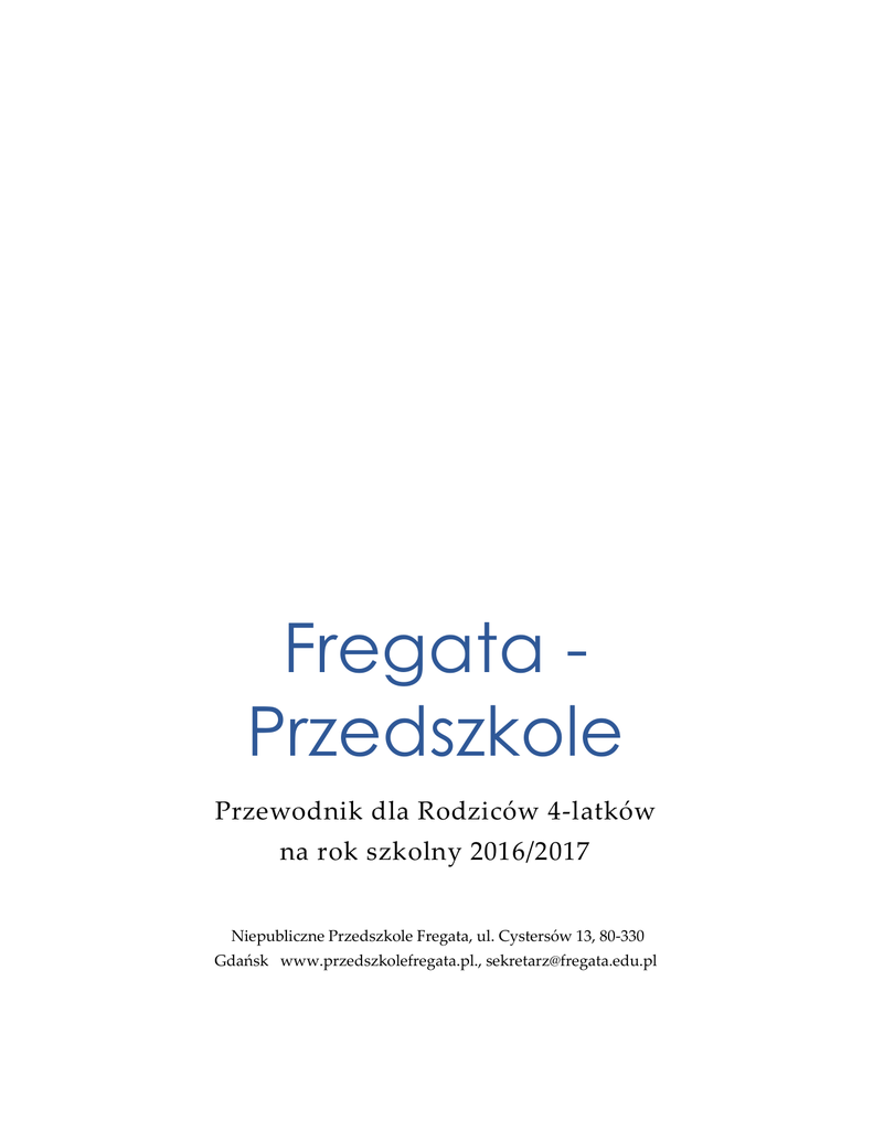 Fregata Przedszkole Przewodnik dla Rodziców 4-latków na rok szkolny 2016/2017 Niepubliczne Przedszkole Fregata, ul. Cystersów 13, 80-330 Gdańsk www.przedszkolefregata.pl., [email protected] Fregata - Przedszkole Spis treści SKWER 3 Co wyróżnia nasz projekt edukacyjny? 3 Kto zarządza w SKWERze? 5 Jak zarządzane jest nasze Przedszkole? 5 Rada Zarządzająca Przedszkola: 5 Nauczyciele pracujący z 4-latkami: 5 Co zapewniamy Rodzicom? 5 Spotkanie z opiekunem – jak działa system tutoringu rodzinnego? 6 Jak najlepiej wykorzystać spotkanie opiekunowskie? 7 Zanim umówicie się Państwo z tutorem: 7 Podczas spotkania z opiekunem: 8 Po spotkaniu opiekunowskim: 8 Rodzice odpowiedzialni za klasę ROK-owie 9 Organizacja pracy Przedszkola 9 Kalendarz roku szkolnego 9 Moja zabawka 9 Plany miesięczne 9 Harmonogram dnia 10 Wyjście na dwór 10 Odbiór dziecka z Przedszkola 11 Mundurek 11 Agenda 11 Nawyki 12 Dyżury 12 Posiłki, nietolerancja, diety 12 Nieobecności 12 Świętowanie urodzin 13 Wydarzenia 13 SKWER 1 Fregata - Przedszkole Lekarstwa 13 Wypadki i pierwsza pomoc 13 Zgłoszenia do Wydziału Edukacji 13 Dane kontaktowe rodziców lub opiekunów 13 Opłaty 14 Czesne 14 Ubezpieczenie 14 Wyprawka 4-latka 14 1/. Ubrania i artykuły higieniczne 14 2/. Na zajęcia dydaktyczne 14 Komunikacja 15 Strona internetowa 15 Trudne pytania, trudne sprawy 15 Ochrona danych 15 Spotkania z przedstawicielem Rady Zarządzającej 15 SKWER 2 Fregata - Przedszkole SKWER Przedszkole Fregata jest jedną z trzech placówek prowadzonych ręce. Programy dydaktyczne i wychowawcze w placówkach SKWER – Projekt edukacyjny Fregata Stowarzyszenia oparte są o zasadę personalizmu kształcenia. W tym przez Stowarzyszenie Kulturalne Wspierania Edukacji i Rozwoju SKWER, organizację pożytku publicznego założoną przez grupę rodziców, którzy postanowili edukację swoich dzieci wziąć w swoje miejscu warto zwrócić uwagę na istotną różnicę pomiędzy Projekt Edukacyjny personalizmem a indywidualizmem, które dość powszechnie są FREGATA to flagowe mylone bądź uważane za synonimy. „Zarówno personalizm jaki i przedsięwzięcie indywidualizm za punkt centralny swoich rozważań i działań Stowarzyszenia stawia człowieka. Odmienne jest natomiast rozumienie jego istoty…. SKWER. Perspektywa personalistyczna podkreśla, że człowiek rozwija swój Projekt wyrósł z potencjał w relacji z innymi, nierzadko – rezygnując z własnych poszukiwań rodziców upodobań na dobre wychowanie i dla indywidualizmie dobra upatrują wspólnego. szczęścia Koncepcje człowieka oparte w na realizacji rzetelną edukację dzieci, osobistych zamierzeń”1 od przedszkola do Co wyróżnia nasz projekt edukacyjny? matury, u jego podstaw 1. Przede wszystkim szanujemy fakt, że rodzice są pierwszymi i najważniejszymi wychowawcami swoich dzieci. Jako tacy mają prawo do wyboru miejsca edukacji dla swoich dzieci zgodnie ze swoimi przekonaniami. 2. Stowarzyszenie SKWER powstało, aby dodawać rodzicom odwagi, integrować i koordynować działania rodziców, nauczycieli i dzieci na drodze do osiągnięcia przez każde dziecko pełnego i zrównoważonego rozwoju intelektualnego, kulturalnego oraz duchowego. 3. Najważniejszym celem każdej placówki prowadzonej przez Stowarzyszenie jest wszechstronna edukacja każdego ucznia. System spersonalizowanego tutoringu umożliwia każdemu uczniowi rozwijanie jego talentów oraz nabywanie poczucia odrębności oraz współodpowiedzialności. leży ścisła współpraca rodziców i placówki edukacyjnej. Poza Przedszkolem, Stowarzyszenie prowadzi obecnie Niepubliczną Szkołę Podstawową dla Dziewcząt Fregata oraz Niepubliczną Szkołę Podstawową dla Chłopców Fregata. Do Przedszkola i obu szkół uczęszcza 240 dziewcząt i chłopców. Jakubowska M., Wychowanie personalistyczne a podejście indywidualne w Przygotowanie do wykonywania zawodu nauczyciela w stronę edukacji spersonalizowanej, Praca zbiorowa Kowal St. i Mądry-Kupiec M., wydawnictwo internetowe e-bookowo, Kraków 2015, str. 61 1 SKWER 3 Fregata - Przedszkole 4. Kształcenie w szkołach i przedszkolu Stowarzyszenia ma być nakierowane na doskonałość obejmującą całe spektrum różnych dyscyplin wiedzy. Zdobywaniu wiedzy przez uczniów ma służyć motywowanie do pracy zarówno w klasach i grupach, jak i w czasie pracy indywidualnej. Treści polonistyczne, matematyczne, przyrodnicze czy artystyczne nie są traktowane jako niezależnych od siebie, ale jako elementy tej samej rzeczywistości i przedstawiane dzieciom w sposób zintegrowany, tak jak ma to miejsce w otaczającym nas świecie. Każda dziedzina wiedzy ma zachęcać dziecko nie tylko do odkrywania pojedynczych zasad, ale także uniwersalnych reguł, które występują w otaczającym nas świecie. 5. Kształtowanie charakteru ma opierać się na doświadczaniu wolności i konsekwentnym ponoszeniu odpowiedzialności; w tym obszarze mamy następujące cele: a. Zachęcanie do rozwoju w cnotach takich, jak: szczerość, pracowitość, wytrwałość, samodyscyplina, hojność, powściągliwość i pogoda ducha. b. Rozwijanie odpowiedzialności za swoje emocje, aby być zdolnym do budowania dojrzałych relacji. c. Okazywanie, poprzez przykład kierujących projektem, że realizowanie swoich uprawnień zarządczych zobowiązuje do służby i dlatego zasługuje na współpracę i szacunek. d. Nauczanie, że praca dobrze wykonana jest kluczowym środkiem osobistego i społecznego postępu. 6. Kształtowanie ducha w placówkach Stowarzyszenia SKWER nie polega na narzucaniu doktryny, ale współdzieleniu przekonania o duchowym wymiarze istnienia osoby. Dla katolików kształtowanie ducha ma następujące cele: rozwijanie poczucia dziecięctwa Bożego, bycie świadomym, że każdy chrześcijanin został powołany do świętości. Nauczanie, że miłość jest najważniejszą chrześcijańską cnotą i w obcowaniu z innymi jest okazją do służenia na ludzkiej, zaw