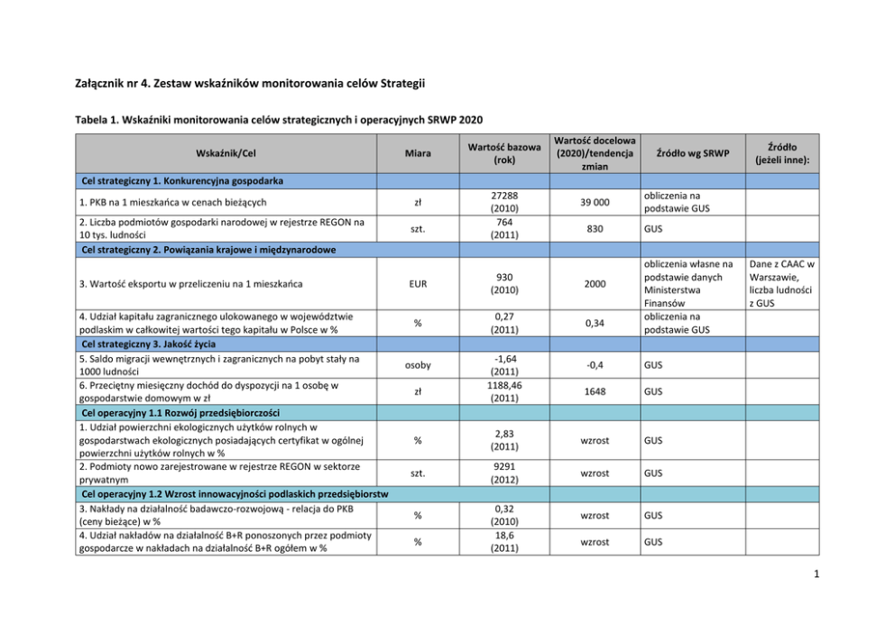Załącznik nr 4. Zestaw wskaźników monitorowania celów Strategii Tabela 1. Wskaźniki monitorowania celów strategicznych i operacyjnych SRWP 2020 Wskaźnik/Cel Miara Wartość bazowa (rok) Wartość docelowa (2020)/tendencja zmian Źródło wg SRWP Źródło (jeżeli inne): Cel strategiczny 1. Konkurencyjna gospodarka 1. PKB na 1 mieszkańca w cenach bieżących 2. Liczba podmiotów gospodarki narodowej w rejestrze REGON na 10 tys. ludności Cel strategiczny 2. Powiązania krajowe i międzynarodowe 3. Wartość eksportu w przeliczeniu na 1 mieszkańca 4. Udział kapitału zagranicznego ulokowanego w województwie podlaskim w całkowitej wartości tego kapitału w Polsce w % Cel strategiczny 3. Jakość życia 5. Saldo migracji wewnętrznych i zagranicznych na pobyt stały na 1000 ludności 6. Przeciętny miesięczny dochód do dyspozycji na 1 osobę w gospodarstwie domowym w zł Cel operacyjny 1.1 Rozwój przedsiębiorczości 1. Udział powierzchni ekologicznych użytków rolnych w gospodarstwach ekologicznych posiadających certyfikat w ogólnej powierzchni użytków rolnych w % 2. Podmioty nowo zarejestrowane w rejestrze REGON w sektorze prywatnym Cel operacyjny 1.2 Wzrost innowacyjności podlaskich przedsiębiorstw 3. Nakłady na działalność badawczo-rozwojową - relacja do PKB (ceny bieżące) w % 4. Udział nakładów na działalność B+R ponoszonych przez podmioty gospodarcze w nakładach na działalność B+R ogółem w % zł szt. 27288 (2010) 764 (2011) 39 000 830 EUR 930 (2010) 2000 % 0,27 (2011) 0,34 osoby zł -1,64 (2011) 1188,46 (2011) obliczenia na podstawie GUS GUS obliczenia własne na podstawie danych Ministerstwa Finansów obliczenia na podstawie GUS -0,4 GUS 1648 GUS % 2,83 (2011) wzrost GUS szt. 9291 (2012) wzrost GUS wzrost GUS wzrost GUS % % 0,32 (2010) 18,6 (2011) Dane z CAAC w Warszawie, liczba ludności z GUS 1 Wskaźnik/Cel Miara 5. Nakłady na działalność innowacyjną na 1 przedsiębiorstwo przemysłowe, które poniosło takie nakłady w tys. zł tys. zł 6. WDB na 1 pracującego w tys. zł tys. zł 7. Liczba uzyskanych patentów przez: szt. jednostki naukowe Wartość bazowa (rok) 3661,6 (2011) 71,6 (2010) - Wartość docelowa (2020)/tendencja zmian Źródło wg SRWP wzrost GUS wzrost GUS nie wskazano badania własne szt. nie wskazano badania własne przedsiębiorstwa szt. nie wskazano badania własne osoby fizyczne szt. nie wskazano badania własne Cel operacyjny 1.3 Rozwój kompetencji do pracy i wsparcie aktywności zawodowej mieszkańców regionu 8. Udział osób w wieku 25-64 lata uczestniczących w kształceniu i szkoleniach w ogólnej liczbie ludności w tym wieku (przeciętne w % 4,1(2012) roku)c w % 9. Wskaźnik zatrudnienia dla osób w wieku 20-64 lata wg BAEL (w 66,9% % IV kwartale) w % (2012) Cel operacyjny 1.4 Kapitał społeczny jako katalizator procesów rozwojowych 40,4 10. Liczba podmiotów trzeciego sektora na 10 tys. ludności szt. (2012) 321,5 11. Zwiedzający muzea i wystawy na 1000 ludności osoby (2012) Widzowie i słuchacze w teatrach i instytucjach muzycznych na 1000 osoby 218,4 ludności Uczestnicy imprez (w ciągu roku) organizowanych przez domy i osoby 914,8 ośrodki kultury, kluby i świetlice na 1000 ludności wzrost GUS wzrost GUS/Eurostat wzrost GUS wzrost GUS wzrost GUS wzrost GUS Źródło (jeżeli inne): Dane ogólne z publikacji GUS Nauka i Technika, szczegółowe dane z Urzędu Patentowego Urząd Patentowy RP Urząd Patentowy RP Urząd Patentowy RP 2 Wskaźnik/Cel Zwiedzający galerie sztuki na 1000 ludności Widzowie w kinach na 1000 ludności Czytelnicy bibliotek publicznych (łącznie z filiami i punktami bibliotecznymi) na 1000 ludności Cel operacyjny 1.5 Efektywne korzystanie z zasobów naturalnych 12. Udział energii odnawialnej w produkcji energii elektrycznej ogółem w % 13. Emisja metanu CH4 14. Odsetek osób korzystających z Internetu w kontaktach z administracją publiczną Cel operacyjny 1.6 Nowoczesna infrastruktura sieciowa 15. Odsetek gospodarstw domowych wyposażonych w komputer z dostępem do szerokopasmowego Internetu w % 16. Odsetek podmiotów gospodarczych posiadających dostęp do szerokopasmowego Internetu w % 17. Korzystający z instalacji gazowej w % ogółu ludności Miara Wartość bazowa (rok) osoby osoby 62 749,7 osoby - Cel operacyjny 2.2 Poprawa atrakcyjności inwestycyjnej województwa 20. Wskaźnik atrakcyjności inwestycyjnej województwa - pozycja w rankingu 21. Powierzchnia nowo udostępnionych/wspartych terenów inwestycyjnych 22. Pracujący w podmiotach z udziałem kapitału zagranicznego według lokalizacji siedziby zarządu Cel operacyjny 2.3 Rozwój partnerskiej współpracy transgranicznej wzrost GUS wzrost GUS Gg 48,8 (2011) - spadek KOBiZE % - wzrost % % % % 18. Długość nowo wybudowanych i zmodernizowanych km elektroenergetycznych sieci przesyłowych i dystrybucyjnych Cel operacyjny 2.1 Aktywność podlaskich przedsiębiorstw na rynku ponadregionalnym 19. Udział sprzedaży eksportowej w sprzedaży ogółem Wartość docelowa (2020)/tendencja Źródło wg SRWP zmian wzrost GUS wzrost GUS 48,5% (2012) 78,5 (2012) 27,0 (2011) GUS Strateg wzrost GUS wzrost GUS wzrost GUS - nie wskazano % - wzrost pozycja 16 poprawa ha - nie wskazano osoby 8782 (2011) wzrost Źródło (jeżeli inne): Badania własne Dane z PGE i PSE Obliczenia własne na podstawie danych MF i GUS Dane z CAAC, GUS (wartość sprzedaży) IBnGR badania własne GUS 3 Wskaźnik/Cel Miara Wartość bazowa (rok) 23. Liczba sieci współpracy transgranicznej (w tym euroregiony) szt. 3 24. Liczba nowych umów dotyczących współpracy w ramach EWT szt. 0 Cel operacyjny 2.4 Rozwój partnerskiej współpracy międzyregionalnej 0 25. Liczba nowych wspólnych projektów ponadregionalnych szt. 0 26. Liczba nowych umów/porozumień pomiędzy władzami szt. 0 samorządowymi Cel operacyjny 2.5 Podniesienie zewnętrznej i wewnętrznej dostępności komunikacyjnej regionu 27. Drogi o twardej nawierzchni na 100km2 km 28. 