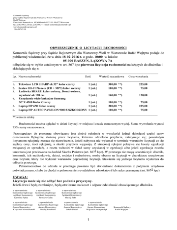 Komornik Sądowy przy Sądzie Rejonowym dla Warszawy-Woli w Warszawie Rafał Wojtyna Kancelaria Komornicza Al.Solidarności 155/11, 00-877 Warszawa tel. 22 6310833,35 fax 22 6310834 e-mail: [email protected] www.komornikwarszawa.pl Km 14743/14 OBWIESZCZENIE O LICYTACJI RUCHOMOŚCI Komornik Sądowy przy Sądzie Rejonowym dla Warszawy-Woli w Warszawie Rafał Wojtyna podaje do publicznej wiadomości, że w dniu 18-02-2016 r. o godz. 10:00 w lokalu: 05-090 RASZYN, ŁĄKOWA 7A odbędzie się w trybie ustalonym w art. 867 kpc pierwsza licytacja ruchomości należących do dłużnika i składających się z: _______________________________________________________________________________________________________________________ Lp. Nazwa ruchomości Ilość Wartość szacunkowa Cena wywołania _________________________________________________________________________________________________________________________ 1. 2. 3. 4. 5. 6. Telewizor LCD SHARP ok 32" kolor czarny Zestaw HI-FI Pioneer (CD + MP3) kolor srebrny Lodówka SHARP, kolor srebrny, Dwudrzwiowa, wysokość ok 120 cm Urządzenie wielofunkcyjne Samsung SC X 4300 Kolor Czarny Laptop HP 650 Kolor czarny Laptop HP ALTEC PAWILON 9000 USZKODZONY 1 [szt.] 1 [szt.] 300,00 **) 100,00 **) 225,00 75,00 1 [szt.] 160,00 **) 120,00 1 [szt.] 1 [szt.] 1 [szt.] 100,00 **) 300,00 **) 100,00 **) 75,00 225,00 75,00 _______________________________________________________________________________________________________________________ **) cena za sztukę Ruchomości można oglądać w dzień licytacji w miejscu i czasie oznaczonym wyżej. Suma wywołania wynosi 75% sumy oszacowania. Przystępujący do przetargu obowiązany jest złożyć rękojmię w wysokości jednej dziesiątej części sumy oszacowania. Rękojmię złożoną przez licytanta, któremu udzielono przybicia, zatrzymuje się; pozostałym licytantom rękojmię zwraca się niezwłocznie. Jeżeli nabywca nie wykonał w terminie warunków licytacji co do zapłaty ceny, traci rękojmię, a skutki przybicia wygasają. Z utraconej rękojmi pokrywa się koszty egzekucji związanej ze sprzedażą, a reszta wchodzi w skład sumy uzyskanej w egzekucji albo jeżeli egzekucja została umorzona jest przelewana na dochód Skarbu Państwa (art. 8671 kpc). W przetargu nie mogą uczestniczyć: dłużnik, komornik, ich małżonkowie, dzieci, rodzice i rodzeństwo, osoby obecne na licytacji w charakterze urzędowym oraz licytant, który nie wykonał warunków poprzedniej licytacji. Stawienie się jednego licytanta wystarcza do odbycia przetargu. Pełnomocnictwo do udziału w przetargu powinno być stwierdzone dokumentem z podpisem urzędowo poświadczonym, chyba że chodzi o pełnomocnictwo udzielone adwokatowi lub radcy prawnemu (art. 8672 kpc) UWAGA: Licytacja może się nie odbyć bez podania przyczyny. Jeżeli drzwi będą zamknięte, będą otwierane na koszt i odpowiedzialność obowiązanego dłużnika. z upowaznienia Komornika Sądowego Aplikant Komorniczy Karolina Pyrka z upoważnienia Komornika Sądowego Asesor Komorniczy Krzysztof Mazuchowski z upoważnienia Komornika Sądowego Aplikant Komorniczy Jarosław Galas z upoważnienia Komornika Sądowego Asesor Komorniczy Maciej Parafiński z upoważnienia Komornika Sądowego Aplikant Komorniczy Maciej Zaks z upoważnienia z upoważnienia Komornika Sądowego Komornika Sądowego Asesor Komorniczy Asesor Komorniczy Jakub Siadul Wojciech Andryszczyk 1 Komornik Sądowy Rafał Wojtyna