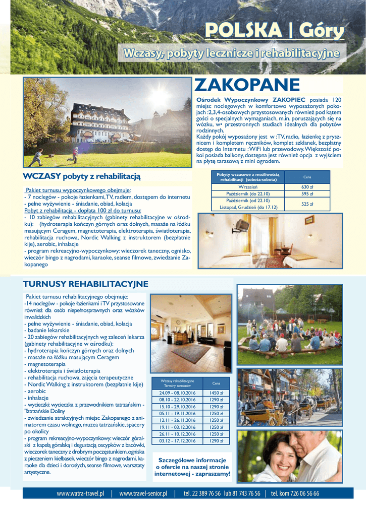 POLSKA | Góry Wczasy, pobyty lecznicze i rehabilitacyjne ZAKOPANE Ośrodek Wypoczynkowy ZAKOPIEC posiada 120 miejsc noclegowych w komfortowo wyposażonych pokojach :2,3,4-osobowych przystosowanych również pod kątem gości o specjalnych wymaganiach, m.in. poruszających się na wózku, w• przestronnych studiach idealnych dla pobytów rodzinnych. Każdy pokój wyposażony jest w :TV, radio, łazienkę z prysznicem i kompletem ręczników, komplet szklanek, bezpłatny dostęp do Internetu : WiFi lub przewodowy. Większość pokoi posiada balkony, dostępna jest również opcja z wyjściem na płytę tarasową z mini ogrodem. WCZASY pobyty z rehabilitacją Pobyty wczasowe z możliwością rehabilitacji (sobota-sobota) Pakiet turnusu wypoczynkowego obejmuje: - 7 noclegów - pokoje łazienkami, TV, radiem, dostępem do internetu - pełne wyżywienie - śniadanie, obiad, kolacja Pobyt z rehabilitacją - dopłata 100 zł do turnusu: - 10 zabiegów rehabilitacyjnych (gabinety rehabilitacyjne w ośrodku): (hydroterapia kończyn górnych oraz dolnych, masaże na łóżku masującym Ceragem, magnetoterapia, elektroterapia, światłoterapia, rehabilitacja ruchowa, Nordic Walking z instruktorem (bezpłatnie kije), aerobic, inhalacje - program rekreacyjno-wypoczynkowy: wieczorek taneczny, ognisko, wieczór bingo z nagrodami, karaoke, seanse filmowe, zwiedzanie Zakopanego Wrzesień Październik (do 22.10) Październik (od 22.10) Listopad, Grudzień (do 17.12) Cena 630 zł 595 zł 525 zł TURNUSY REHABILITACYJNE Pakiet turnusu rehabilitacyjnego obejmuje: -14 noclegów - pokoje łazienkami i TV przystosowane również dla osób niepełnosprawnych oraz wózków inwalidzkich - pełne wyżywienie - śniadanie, obiad, kolacja - badanie lekarskie - 20 zabiegów rehabilitacyjnych wg zaleceń lekarza (gabinety rehabilitacyjne w ośrodku): - hydroterapia kończyn górnych oraz dolnych - masaże na łóżku masującym Ceragem - magnetoterapia - elektroterapia i światłoterapia - rehabilitacja ruchowa, zajęcia terapeutyczne - Nordic Walking z instruktorem (bezpłatnie kije) - aerobic - inhalacje - wycieczki: wycieczka z przewodnikiem tatrzańskim Tatrzańskie Doliny - zwiedzanie atrakcyjnych miejsc Zakopanego z animatorem czasu wolnego, muzea tatrzańskie, spacery po okolicy - program rekreacyjno-wypoczynkowy: wieczór góralski z kapelą góralską i degustacją oscypków z bacówki, wieczorek taneczny z drobnym poczęstunkiem, ogniska z pieczeniem kiełbasek, wieczór bingo z nagrodami, karaoke dla dzieci i dorosłych, seanse filmowe, warsztaty artystyczne. Wczasy rehabilitacyjne Terminy turnusów Cena 24.09 - 08.10.2016 08.10 - 22.10.2016 15.10 - 29.10.2016 05.11 - 19.11.2016 12.11 - 26.11.2016 19.11 - 03.12.2016 26.11 - 10.12.2016 03.12 - 17.12.2016 1450 zł 1290 zł 1290 zł 1250 zł 1250 zł 1250 zł 1250 zł 1290 zł Szczegółowe informacje o ofercie na naszej stronie internetowej - zapraszamy! www.watra-travel.pl | www.travel-senior.pl | tel. 22 389 76 56 lub 81 743 76 56 | tel. kom 726 06 56 66