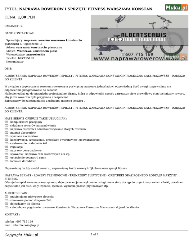 TYTUŁ: NAPRAWA ROWERÓW I SPRZĘTU FITNESS WARSZAWA KONSTAN CENA: 1,00 PLN PARAMETRY: DANE KONTAKTOWE: Sprzedający: naprawa rowerów warszawa konstancin piaseczno (.: togloszenie :.) Adres: warszawa konstancin piaseczno Miasto: Warszawa konstancin piase Województwo: mazowieckie Telefon: 607715169 Komunikator: OPIS: ALBERTSERWIS NAPRAWA ROWERÓW I SPRZĘTU FITNESS WARSZAWA KONSTANCIN PIASECZNO CAŁE MAZOWSZE - DODJAZD DO KLIENTA W związku z tegorocznym sezonem rowerowym poświęćmy naszemu jednośladowi odpowiednią ilość uwagi i zapewnijmy mu odpowiednie przygotowanie do sezonu! Najlepiej oddać go do przeglądu profesjonalnej firmie, która w odpowiedni sposób zatroszczy się o prawidłowy stan techniczny roweru, aby jazda rowerem była przyjemna i bezpieczna! Zapraszamy do zapoznania się z usługami naszego serwisu . ALBERTSERWIS NAPRAWA ROWERÓW I SPRZĘTU FITNESS WARSZAWA KONSTANCIN PIASECZNO CAŁE MAZOWSZE - DODJAZD DO KLIENTA. NASZ SERWIS OFERUJE TAKIE USŁUGI JAK : ťťť - kompleksowe przeglądy ťťť - składanie rowerów na zamówienie ťťť - naprawa rowerów i odrestaurowywanie starych rowerów ťťť - montaż akcesoriów ťťť - wymiana akcesoriów ťťť - konserwacja, czyszczenie, przeglądy gwarancyjne i pogwarancyjne ťťť - centrowanie i składanie kół ťťť - regulacje ťťť - naprawy powypadkowe ťťť - spawanie i naprawa ram rowerowych alu itp; ťťť - ustawienie geometrii ramy ťťť - fachowe doradztwo Naprawiamy każdy model roweru , naprawiamy także rowery trójkołowe oraz sprzęt fitness. NAPRAWA SERWIS - ROWERY TRENINGOWE - TRENAŻERY ELIPTYCZNE - ORBITREKI ORAZ RÓŻNEGO RODZAJU MASZYNY FITNESS. Oferuje kompleksowe naprawy sprzętu, daje gwarancje na wykonane usługi, mam stały dostęp do części, naprawiam silniki, dorabiam części takie jak osie, wały, zębatki, łączniki, wymiana pasów, płyt nośnych itp. ALBERTSERWIS : ťťť - przyjmujemy nietypowe zlecenia ťťť - rowerowa pomoc drogowa 24h ťťť - dojeżdżamy do klienta ťťť - całodobowe pogotowie rowerowe Konstancin Warszawa Piaseczno Mazwosze - dojazd do klienta KONTAKT : telefon : 607 715 169 mail : [email protected] Copyright Muku.pl 1 of 2 Konstancin - Jeziorna www.naprawarowerow.waw.pl Rejon działania naszego serwisu to całe województwo mazowieckie (w tym głównie: warszawa, konstancin, piaseczno, góra kalwaria) ewentualnie wyjazdy w Polskę do ustalenia. SERDECZNIE PAŃSTWA ZAPRASZAMY . Copyright Muku.pl 2 of 2