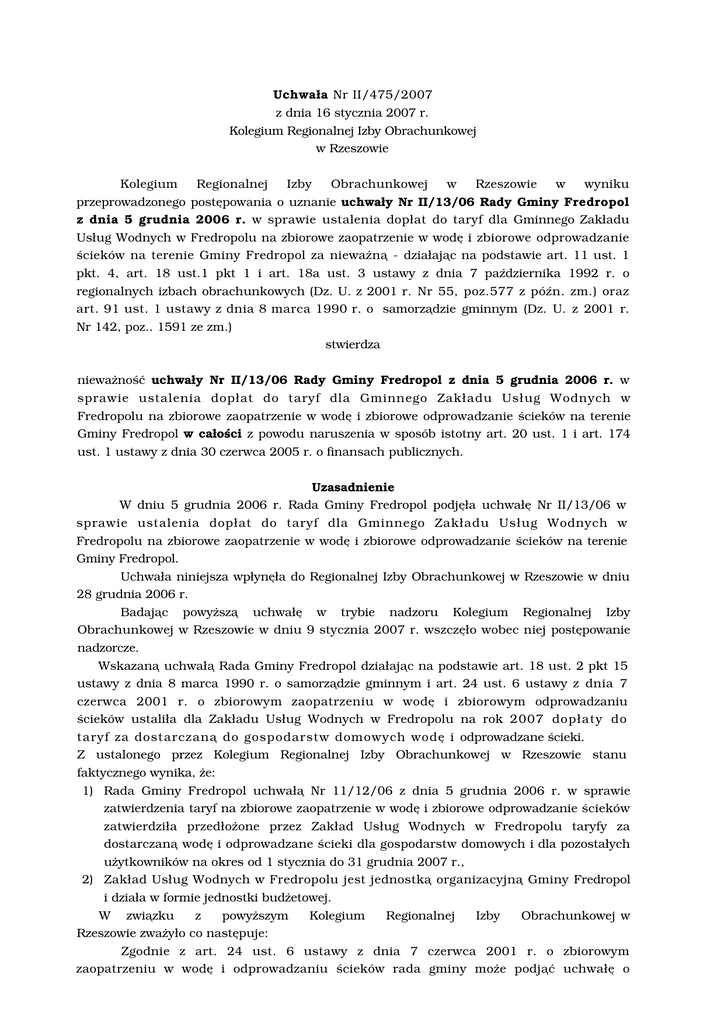 Uchwała Nr II/475/2007 z dnia 16 stycznia 2007 r. Kolegium Regionalnej Izby Obrachunkowej w Rzeszowie Kolegium Regionalnej Izby Obrachunkowej w Rzeszowie w wyniku przeprowadzonego postępowania o uznanie uchwały Nr II/13/06 Rady Gminy Fredropol z dnia 5 grudnia 2006 r. w sprawie ustalenia dopłat do taryf dla Gminnego Zakładu Usług Wodnych w Fredropolu na zbiorowe zaopatrzenie w wodę i zbiorowe odprowadzanie ścieków na terenie Gminy Fredropol za nieważną - działając na podstawie art. 11 ust. 1 pkt. 4, art. 18 ust.1 pkt 1 i art. 18a ust. 3 ustawy z dnia 7 października 1992 r. o regionalnych izbach obrachunkowych (Dz. U. z 2001 r. Nr 55, poz.577 z późn. zm.) oraz art. 91 ust. 1 ustawy z dnia 8 marca 1990 r. o samorządzie gminnym (Dz. U. z 2001 r. Nr 142, poz.. 1591 ze zm.) stwierdza nieważność uchwały Nr II/13/06 Rady Gminy Fredropol z dnia 5 grudnia 2006 r. w sprawie ustalenia dopłat do taryf dla Gminnego Zakładu Usług Wodnych w Fredropolu na zbiorowe zaopatrzenie w wodę i zbiorowe odprowadzanie ścieków na terenie Gminy Fredropol w całości z powodu naruszenia w sposób istotny art. 20 ust. 1 i art. 174 ust. 1 ustawy z dnia 30 czerwca 2005 r. o finansach publicznych. Uzasadnienie W dniu 5 grudnia 2006 r. Rada Gminy Fredropol podjęła uchwałę Nr II/13/06 w sprawie ustalenia dopłat do taryf dla Gminnego Zakładu Usług Wodnych w Fredropolu na zbiorowe zaopatrzenie w wodę i zbiorowe odprowadzanie ścieków na terenie Gminy Fredropol. Uchwała niniejsza wpłynęła do Regionalnej Izby Obrachunkowej w Rzeszowie w dniu 28 grudnia 2006 r. Badając powyższą uchwałę w trybie nadzoru Kolegium Regionalnej Izby Obrachunkowej w Rzeszowie w dniu 9 stycznia 2007 r. wszczęło wobec niej postępowanie nadzorcze. Wskazaną uchwałą Rada Gminy Fredropol działając na podstawie art. 18 ust. 2 pkt 15 ustawy z dnia 8 marca 1990 r. o samorządzie gminnym i art. 24 ust. 6 ustawy z dnia 7 czerwca 2001 r. o zbiorowym zaopatrzeniu w wodę i zbiorowym odprowadzaniu ścieków ustaliła dla Zakładu Usług Wodnych w Fredropolu na rok 2007 dopłaty do taryf za dostarczaną do gospodarstw domowych wodę i odprowadzane ścieki. Z ustalonego przez Kolegium Regionalnej Izby Obrachunkowej w Rzeszowie stanu faktycznego wynika, że: 1) Rada Gminy Fredropol uchwałą Nr 11/12/06 z dnia 5 grudnia 2006 r. w sprawie zatwierdzenia taryf na zbiorowe zaopatrzenie w wodę i zbiorowe odprowadzanie ścieków zatwierdziła przedłożone przez Zakład Usług Wodnych w Fredropolu taryfy za dostarczaną wodę i odprowadzane ścieki dla gospodarstw domowych i dla pozostałych użytkowników na okres od 1 stycznia do 31 grudnia 2007 r., 2) Zakład Usług Wodnych w Fredropolu jest jednostką organizacyjną Gminy Fredropol i działa w formie jednostki budżetowej. W związku z powyższym Kolegium Regionalnej Izby Obrachunkowej w Rzeszowie zważyło co następuje: Zgodnie z art. 24 ust. 6 ustawy z dnia 7 czerwca 2001 r. o zbiorowym zaopatrzeniu w wodę i odprowadzaniu ścieków rada gminy może podjąć uchwałę o dopłacie dla jednej, wybranych lub wszystkich taryfowych grup odbiorców usług. Dopłatę gmina przekazuje przedsiębiorstwu wodociągowo-kanalizacyjnemu. W myśl zaś art. 106 ust. 2 pkt 3 ustawy z dnia 30 czerwca 2005 r. o finansach publicznych dopłaty do określonych rodzajów usług, kalkulowane według cen jednostkowych są dotacjami przedmiotowymi, zaś z art. 174 ust. 1 i 2 tej ustawy wynika, że z budżetu jednostki samorządu terytorialnego mogą być udzielane dotacje przedmiotowe dla zakładów budżetowych i gospodarstw pomocniczych, a także innym podmiotom niż zakłady budżetowe i gospodarstwa pomocnicze o ile tak stanowią odrębne przepisy. Z kolei z art. 20 ust. 1 ustawy o finansach publicznych wynika, że jednostki budżetowe są to takie jednostki organizacyjne, które pokrywają swoje wydatki bezpośrednio z budżetu jednostki samorządu terytorialnego, a pobrane dochody odprowadzają na rachunek dochodów budżetu jednostki samorządu terytorialnego. Z przepisów powyższych wynika, że jednostka budżetowa nie może otrzymać z budżetu jednostki samorządu terytorialnego żadnych dotacji, pokrywa ona swoje wydatki bezpośrednio z budżetu jednostki samorządu terytorialnego (gminy). Dotacje z budżetu jednostki samorządu terytorialnego (gminy) mogą otrzymać jedynie zakłady budżetowe i gospodarstwa pomocnicze jednostek budżetowych oraz inne podmioty o ile tak stanowią odrębne przepisy. Ustalając uchwałą Nr II/13/06 z dnia 5 grudnia 2006 r. dotacje przedmiotowe (dopłaty do taryf za dostarczaną wodę i odprowadzane ścieki) dla Zakładu Usług Wodnych w Fredropolu, działającego w formie jednostki budżetowej Rada Gminy Fredropol naruszyła w sposób istotny art. 20 ust. 1 i art. 174 ust. 1 ustawy z dnia 30 czerwca 2005 r. o finansach publicznych. Mając powyższe na względzie Kolegium Regionalnej Izby Obrachunkowej w Rzeszowie uchwaliło jak w sentencji. Na niniejszą uchwałę Kolegium Izby przysługuje Gminie prawo wniesienia skargi do Wojewódzkiego Sądu Administracyjnego w Rzeszowie, za pośrednictwem Regionalnej Izby Obrachunkowej w Rzeszowie, w terminie 30 dni od dnia jej doręczenia.