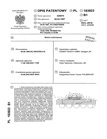 R Z E C Z P O S P O L IT A PO LSK A (12) OPIS PATENTOWY (19)PL (11)183923 (21 ) Numer zgłoszenia: (22) Data zgłoszenia: 326074 26.04.1997 (86) Data i num er zgłoszenia międzynarodowego: Urząd Patentowy Rzeczypospolitej Polskiej 26.04.1997, PCT/DE97/00856 (87) Data i numer publikacji zgłoszenia międzynarodowego: (13) B1 (51) IntCl7 H01L 25/16 H01L 23/538 19.02.1998, W098/07193, PCT Gazette nr 07/98 Moduł multichipowy (54) (30) Pierwszeństwo: (73) Uprawniony z patentu: 09.08.1996,DE,19632200.6-33 (43) Zgłoszenie ogłoszono: ROBERT BOSCH GMBH, Stuttgart, DE (72) Twórcy wynalazku: 17.08.1998 BUP 17/98 (45) O udzieleniu patentu ogłoszono: 30.08.2002 WUP 08/02 PL 183923 B1 (5 7 ) 1. M oduł m ultichipow y zaw ierający płytę nośną, n a k tórej pow ierzchni m ontażowej um ieszczony jest co najm niej jed en obw ód scalony i inne elem enty elektroniczne, połączone ze sobą za p o m o cą przew odzących elektrycznie połączeń, przy czym z pow ierzchni m ontażowej na dolną pow ierzchnię płyty nośnej są przeprow adzone styki przelotow e, połączone z um ieszczonym i na dolnej pow ierzchni stykami lutow anym i do elektrycznego połączenia m odułu m ultichipow ego z nośnikiem podzespołów , oraz z um ieszczonym na płycie nośnej, dodatkow ym elem entem nośnym , zaopatrzonym w ścieżki przew odzące i/lub elem enty, przy czym pow ierzchnia podstaw y dodatkow ego elem entu nośnego je s t w iększa niż pow ierzchnia podstaw y co najm niej jednego obw odu scalonego, zaś na nie objętej przez obw ód scalony, górnej pow ierzchni dodatkow ego elem entu nośnego znajd u ją się pierw sze i drugie pow ierzchnie przyłączeniow e, przy czym pierw sze pow ierzchnie przyłączeniow e s ą poprzez druty m ikrom ontażow e połączone elektrycznie z obw odem scalonym , natom iast drogie pow ierzchnie przyłączeniow e są poprzez inne druty m ikrom ontażow e połączone z przyłączam i na pow ierzchni m ontażow ej płyty nośnej, znam ienny tym , że na górnej pow ierzchni (25 ) dodatkow ego elem entu nośnego (20 ) znajdują się elem enty elektryczne ( 24 ) do elim inow ania elektrycznych sygnałów zakłócających, m ające postać dyskretnych elem entów oporow ych, połączonych elektrycznie z pierw szym i 1 drugim i pow ierzchniam i przyłączeniow ym i (21, 22). Dieter Napierała, Hildesheim, DE (74) Pełnomocnik: Szlagowska-Kiszko Teresa, POLSERVICE Moduł multichipowy Zastrzeżenia patentowe 1. Moduł multichipowy zawierający płytę nośną, na której powierzchni montażowej umieszczony jest co najmniej jeden obwód scalony i inne elementy elektroniczne, połączone ze sobą za pomocą przewodzących elektrycznie połączeń, przy czym z powierzchni montażowej na dolną powierzchnię płyty nośnej są przeprowadzone styki przelotowe, połączone z umieszczonymi na dolnej powierzchni stykami lutowanymi do elektrycznego połączenia modułu, multichipowego z nośnikiem podzespołów, oraz z umieszczonym na płycie nośnej, dodatkowym elementem nośnym, zaopatrzonym w ścieżki przewodzące i/lub elementy, przy czym powierzchnia podstawy dodatkowego elementu nośnego jest większa niż powierzchnia podstawy co najmniej jednego obwodu scalonego, zaś na nie objętej przez obwód scalony, górnej powierzchni dodatkowego elementu nośnego znajdują się pierwsze i drugie powierzchnie przyłączeniowe, przy czym pierwsze powierzchnie przyłączeniowe są poprzez druty mikromontażowe połączone elektrycznie z obwodem scalonym, natomiast drugie powierzchnie przyłączeniowe są poprzez inne druty mikromontażowe połączone z przyłączami na powierzchni montażowej płyty nośnej, znamienny tym, że na górnej powierzchni (25) dodatkowego elementu nośnego (20) znajdują się elementy elektryczne (24) do eliminowania elektrycznych sygnałów zakłócających, mające postać dyskretnych elementów oporowych, połączonych elektrycznie z pierwszymi i drugimi powierzchniami przyłączeniowymi (21,22). 2. Moduł według zastrz. 1, znamienny tym, że dodatkowy element nośny (20) stanowi podłoże krzemowe. 3. Moduł według zastrz. 1, znamienny tym, że dodatkowy element nośny (20) stanowi podłoże ceramiczne. 4. Moduł według zastrz. 3, znamienny tym, że dodatkowy element nośny (20) stanowi ceramiczne podłoże wielowarstwowe, w którym ścieżki przewodzące i elementy (24, 27, 28) są rozmieszczone w kilku warstwach, oddzielonych od siebie izolacyjnymi warstwami ceramicznymi i połączonych elektrycznie za pomocą styków przelotowych. 5. Moduł według zastrz. 4, znamienny tym, że elementy (24) w postaci elementów oporowych i ścieżki przewodzące są cienko- lub grubowarstwowe. 6. Moduł według zastrz. 5, znamienny tym, że na górnej powierzchni (25) lub jednej z wewnętrznych warstw dodatkowego elementu nośnego (20) w postaci ceramicznego podłoża wielowarstwowego umieszczone są elementy indukcyjne (27) i/lub elementy pojemnościowe (28). 7. Moduł według zastrz. 1 albo 2, albo 3, albo 4, albo 5, albo 6, znamienny tym, że dodatkowy element nośny (20) jest naklejony na płytę nośną (2). 8. Moduł według zastrz. 7, znamienny tym, że dodatkowy element nośny (20) jest naklejony na płytę nośną (2) za pomocą kleju (11), przewodzącego ciepło. * * * Przedmiotem wynalazku jest moduł multichipowy. Moduły multichipowe składają się z płyty nośnej, na której umieszczonych jest kilka, pozbawionych obudowy, obwodów scalonych oraz innych elementów elektronicznych, jak na przykład elementy typu SMD. W celu zabezpieczenia wrażliwych elementów przed wpływem czynników atmosferycznych na płytę nośną nakłada się pokrywę lub kołpak. Płytę nośną stanowi z reguły wielowarstwowa płyta okablowana lub wielowarstwowy element ceramiczny, w związku z czym obwody scalone i inne elementy elektroniczne można połączyć ze sobą za pomocą kilku warstw płyty nośnej. Elektryczne przyłącza modułu multichipowego są poprzez styk