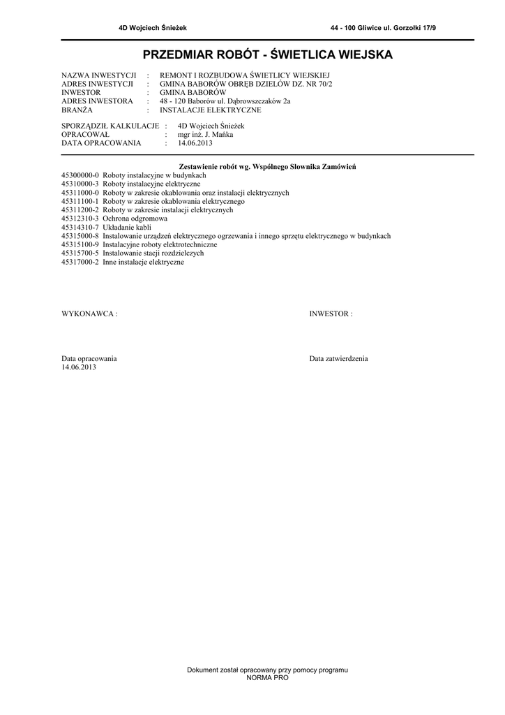 Przedmiar Elektyka świetlica Dzielów