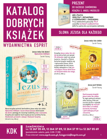 PREZENT DO KAŻDEGO ZAMÓWIENIA KSIĄŻKA S. ANGELI MUSOLESI BÓG ŻYWYCH. MODLITWY I ROZWAŻANIA O UZDROWIENIU I UWOLNIENIU. Przy zamówieniu powyżej 70 zł wysyłka na koszt wydawnictwa (oferta ważna do wyczerpania nakładu). SŁOWA JEZUSA DLA KAŻDEGO WYDAWNICTWA ESPRIT Jezus mówi do dzieci Opowieści biblijne Sarah Young oprawa twarda kolorowe ilustracje Jezus mówi do ciebie Sarah Young 29,90 zł 24,90 zł Książkę Jezus mówi do ciebie przeczytało już ponad 10 milionów ludzi na całym świecie, również w Polsce. Autorka książki modliła się i spisywała słowa, które wypowiadał do niej Jezus. Każdy odnajdzie w niej poruszające słowa skierowane bezpośrednio do niego. [12x18 cm, 400 s.] oprawa zingterowana Jezus jest blisko Sarah Young 39,90 zł 34,90 zł Kontynuacja książki Jezus mówi do ciebie. To zapis pełnych miłości słów Jezusa, którymi zwraca się On w sposób szczególny do wszystkich ludzi w trudnej życiowej stytuacji i potrzebujących pocieszenia. → s. 2 Nowa książka autorki bestsellera Jezus mówi do ciebie. Opowieści biblijne i żywe słowa Jezusa skierowane do dzieci pomogą im rozwinąć osobistą więź z Jezusem. Książka jest pięknie ilustrowana przez Carolinę Farías. Doskonały prezent z okazji I Komunii Świętej. [16,5x21,5 cm, 256 s.] oprawa [12x18 cm, 380 s.] zingterowana 29,90 zł 24,90 zł ZAMÓWIENIA tel. 12 267 05 69, 12 264 37 09, 12 264 37 19 fax 12 267 05 69 (poniedziałek–sobota, godz. 8.00–17.00) Przez internet: www.esprit.com.pl, [email protected] 1 ŻYCIE JEZUSA WIDZIANE JEGO OCZAMI 39,90 zł Oczami Jezusa Carver Alan Ames Oczami Jezusa to zbiór opowieści o życiu Chrystusa spisany na podstawie prywatnych objawień autora, przypominających wizje bł. Anny Katarzyny Emmerich czy św. Brygidy Szwedzkiej. Są to opowieści wyjątkowe, bowiem ich narratorem jest sam Jezus, a wszystkie wydarzenia obserwujemy Jego oczami. 29,90 zł 9,90 zł 34,90 zł 24,90 zł 6,90 zł Różaniec eucharystyczny Carver Alan Ames Modlitwa, która uzdrawia. Dzięki swoim wizjom Alan Ames poznał związek różańca z adoracją i Eucharystią. Ta książka pozwala na nowo odkryć piękno modlitwy różańcowej i zachęca wiernych do jej odmawiania. [10,5x14,5 cm, 112 s.] Oczami Bożej Miłości Carver Alan Ames Zbiór opowieści pokazujących, z jak wielką miłością patrzą na nas Trójca Święta, Matka Boża i święci patroni. Te historie przemieniają ludzkie serca i wzbudzają pragnienie pełnego oddania się Bogu. [14,5x20,5 cm, 256 s.] 29,90 zł 39,90 zł 24,90 zł 34,90 zł [14,5x20,5 cm, 584 s.] Carver Alan Ames – współczesny charyzmatyk. Od wielu lat głosi świadectwo swojego nawrócenia. Posługuje szczególnym darem modlitwy o uzdrowienie. Łagodny duch Carver Alan Ames Oczami Jezusa audiobook Carver Alan Ames 2 CD/mp3, Czas: 22 h, czyta: Jakub Kosiniak Alan Ames o swoim życiu i nawróceniu. Książka zawiera objawione przesłania Ducha Świętego. [14,5x20,5 cm, 270 s.] Jezus mówi do dzieci Opowieści biblijne Sarah Young 39,90 zł 34,90 zł → s. 1 oprawa twarda ilustracje 2 NAJWIĘKSZE BESTSELLERY O. JÓZEFA WITKO uzdrowienia • modlitwy • świadectwa oprawa twarda Ja jestem Bogiem Abrahama, Izaaka, Jakuba o. Józef Witko 25 zł 20 zł Ojciec Józef Witko – franciszkanin, od kilkunastu lat odprawia msze św. w intencji chorych z modlitwą o uzdrowienie i uwolnienie duchowe. Każdego roku uczestniczy w nich kilkadziesiąt tysięcy osób. Każda z jego 11 książek, opowiadających o drogach do uzdrowienia duchowego i fizycznego oraz zawierająca liczne świadectwa ludzi uzdrowionych, staje się bestsellerem. Książka ta jest zachętą, aby wzorując się na bohaterach Biblii, ostatecznie zerwać ze złem i prosić o przebaczenie dla naszych przodków. Zawiera liczne przydatne modlitwy i świadectwa uzdrowionych działaniem modlitwy. Pan jest z Tobą, dzielny wojowniku o. Józef Witko 20 zł [12,5x19,5 cm, 232 s.] 18 zł Uzdrawiająca moc Ducha Świętego o. Józef Witko O duchowej odwadze poprzez zawierzenie Bogu – dzięki niej wszystko staje się możliwe. 20 zł 18 zł [13x20 cm, 286 s.] Pierwsza książka Ojca Józefa zawiera świadectwo jego posługi. Opowiada, w jaki sposób Pan powołał go do bycia Jego narzędziem w służbie głoszenia Słowa, niesienia uzdrowienia fizycznego i duchowego. Istnieje taka modlitwa, która na pewno zostanie wysłuchana. To modlitwa do Ducha Świętego. [13x20 cm, 264 s.] oprawa zingterowana Wołaj do mnie, a odpowiem ci o. Józef Witko Skarbiec modlitw do Ducha Świętego oprac. Sylwester Szefer 25 zł 22 zł Zbiór najpiękniejszych modlitw wybranych przez Ojca Józefa Witko dla tych, którzy chcą prosić o uzdrowienie dla siebie lub bliskich. [12,5x19,5 cm, 300 s.] 34,90 29,90 zł Najpiękniejsze modlitwy do Ducha Świętego. Skarbiec niezwykłych modlitw, którymi modlili się święci, papieże i wielcy charyzmatycy. [12,5x19,5 cm, 400 s.] 3 ZDROWIE DUSZY I CIAŁA WEDŁUG ŚW. HILDEGARDY 29,90 zł 39,90 zł 24,90 zł 29,90 zł Święta Hildegarda leczy alergie dr Claus Schulte-Übbing Żywność, która leczy dr Wighard Strehlow Średniowieczna mniszka poleca niezawodne sposoby oczyszczania organizmu z toksyn i walki z alergiami. Terapia żywieniowa według św. Hildegardy – diety, przepisy na potrawy, zasady żywienia, opisy naturalnych środków leczniczych. [14,5x20,5 cm, 272 s.] [14,5x20,5 cm, 624 s.] kolorowe ilustracje 34,90 zł 34,90 zł 29,90 zł 29,90 zł Leczenie chorób duszy dr Wighard Strehlow Po prostu gotuj Brigitte Pregenzer, Brigitte Schmidle Porady św. Hildegardy z Bingen dotyczące zdrowia nie tylko ciała, ale i ducha. Odkryj skuteczne, naturalne środki, które pomogą Ci zwalczyć depresję, lęki, napięcie i stres. Książka kucharska z najlepszymi przepisami według św. Hildegardy – na potrawy, które są nie tylko zdrowe, ale także bardzo smaczne! [408 s.] [14x20 cm, 352 s.] 4 LEGENDARNA AKTORKA ZDRADZA TAJNIKI WŁOSKIEJ KUCHN