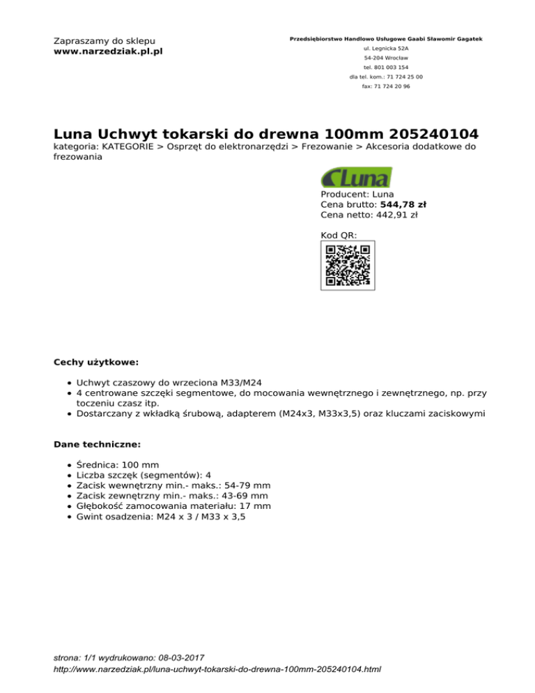 Zapraszamy do sklepu www.narzedziak.pl.pl Przedsiębiorstwo Handlowo Usługowe Gaabi Sławomir Gagatek ul. Legnicka 52A 54-204 Wrocław tel. 801 003 154 dla tel. kom.: 71 724 25 00 fax: 71 724 20 96 Luna Uchwyt tokarski do drewna 100mm 205240104 kategoria: KATEGORIE > Osprzęt do elektronarzędzi > Frezowanie > Akcesoria dodatkowe do frezowania Producent: Luna Cena brutto: 544,78 zł Cena netto: 442,91 zł Kod QR: Cechy użytkowe: Uchwyt czaszowy do wrzeciona M33/M24 4 centrowane szczęki segmentowe, do mocowania wewnętrznego i zewnętrznego, np. przy toczeniu czasz itp. Dostarczany z wkładką śrubową, adapterem (M24x3, M33x3,5) oraz kluczami zaciskowymi Dane techniczne: Średnica: 100 mm Liczba szczęk (segmentów): 4 Zacisk wewnętrzny min.- maks.: 54-79 mm Zacisk zewnętrzny min.- maks.: 43-69 mm Głębokość zamocowania materiału: 17 mm Gwint osadzenia: M24 x 3 / M33 x 3,5 strona: 1/1 wydrukowano: 08-03-2017 http://www.narzedziak.pl/luna-uchwyt-tokarski-do-drewna-100mm-205240104.html