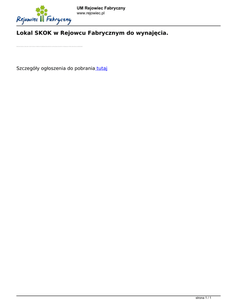 UM Rejowiec Fabryczny www.rejowiec.pl Lokal SKOK w Rejowcu Fabrycznym do wynajęcia. Spółdzielcza Kasa Oszczędnościowo – Kredytowa „WISŁA” ul. Centralna 21 24-100 Puławy - tel. (81) 888-90-43 e-mail: [email protected] zaprasza do złożenia oferty na najem lokalu użytkowego o łącznej powierzchni ok. 75 m2 zlokalizowanego przy ul. Hirszfelda 3 w Rejowcu Fabrycznym w sąsiedztwie SKOK „WISŁA”. Szczegóły ogłoszenia do pobrania tutaj strona 1 / 1 Powered by TCPDF (www.tcpdf.org)