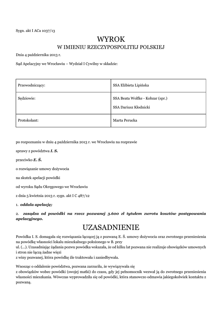 Sygn. akt I ACa 1037/13 WYROK W IMIENIU RZECZYPOSPOLITEJ POLSKIEJ Dnia 4 października 2013 r. Sąd Apelacyjny we Wrocławiu – Wydział I Cywilny w składzie: Przewodniczący: SSA Elżbieta Lipińska Sędziowie: SSA Beata Wolfke - Kobzar (spr.) SSA Dariusz Kłodnicki Protokolant: Marta Perucka po rozpoznaniu w dniu 4 października 2013 r. we Wrocławiu na rozprawie sprawy z powództwa I. S. przeciwko E. Ś. o rozwiązanie umowy dożywocia na skutek apelacji powódki od wyroku Sądu Okręgowego we Wrocławiu z dnia 5 kwietnia 2013 r. sygn. akt I C 487/12 1. oddala apelację; 2. zasądza od powódki na rzecz pozwanej 3.600 zł tytułem zwrotu kosztów postępowania apelacyjnego. UZASADNIENIE Powódka I. S. domagała się rozwiązania łączącej ją z pozwaną E. Ś. umowy dożywocia oraz zwrotnego przeniesienia na powódkę własności lokalu mieszkalnego położonego w B. przy ul. (...). Uzasadniając żądania pozwu powódka wskazała, że od kilku lat pozwana nie realizuje obowiązków umownych i stron nie łączą żadne więzi z winy pozwanej, która powódkę źle traktowała i zaniedbywała. Wnosząc o oddalenie powództwa, pozwana zarzuciła, że wywiązywała się z obowiązków wobec powódki (swojej matki) do czasu, gdy jej pełnomocnik wezwał ją do zwrotnego przeniesienia własności mieszkania. Wówczas wyprowadziła się od powódki, która stanowczo odmawia jakiegokolwiek kontaktu z pozwaną. Wyrokiem z 7.11.2011 r. Sąd Okręgowy oddalił powództwo, nie dopatrując się ustawowej przesłanki rozwiązania umowy dożywocia. W wyniku apelacji powódki Sąd Okręgowy uchylił w/w wyrok i sprawę przekazał Sądowi Okręgowemu do ponownego rozpoznania z zaleceniem przeprowadzenia oferowanych przez strony dowodów (Sąd Okręgowy dotąd jedynie przesłuchał strony). Rozpoznając sprawę powtórnie, Sąd Okręgowy ustalił: Pozwana jest córką powódki, najstarszym z ośmiorga jej dzieci. Z racji starszeństwa ciążył na niej obowiązek opieki nad młodszym rodzeństwem, które wspierała również finansowo. Taki stan trwał także po wyprowadzeniu się pozwanej z rodzinnego domu do W.. Wówczas regularnie odwiedzała rodzinę i zaopatrywała ją w żywność i inne produkty, także dokładała się do opłat mieszkaniowych, co było konieczne, ponieważ żyli w niedostatku. Pozwana i jej partner życiowy zakupili również elementy wyposażenia mieszkania (telewizor, pralkę, dywany) i wymienili okna. Wraz z pozwaną powódkę odwiedzały także córki pozwanej. Stosunki między pozwaną i jej rodziną, a powódką były wtedy serdeczne. W październiku 1999 r. strony zawarły umowę dożywocia. Powódka przeniosła na pozwaną własność mieszkania, za co pozwana zobowiązała się zapewnić matce dożywotnie utrzymanie – przyjęcie jako domownika z zagwarantowaniem światła i opału, także pomoc i pielęgnację w chorobie oraz pogrzeb stosowny do miejscowych zwyczajów. W chwili zawarcia umowy pozwana zamieszkiwała we W. wraz z konkubentem A. Ś. i córkami, lecz nadal regularnie, co najmniej raz w tygodniu, odwiedzała matkę, zaopatrując w niezbędne rzeczy. W 1999 r. powódka przeszła udar mózgu. Pozwana sprawowała nad nią opiekę w czasie pobytu w szpitalach, także na etapie rehabilitacji szpitalnej, zapewnionej przy udziale pozwanej. Po powrocie do domu powódka mogła już samodzielnie się poruszać, ale ciągle wymagała opieki, którą sprawowała wyłącznie pozwana, ponieważ pozostałe rodzeństwo nie angażowało się ani osobiście ani finansowo. Z powódką zamieszkiwała wówczas B. K., z którą pozwana pozostawała w stałym kontakcie w sprawach matki. B. K. nie udźwignęła psychicznego ciężaru opieki nad powódką i wyprowadziła się od niej i wówczas z powódką zamieszkała pozwana, opuszczając konkubenta i córki. Pozwana mieszkała z matką do 2009 r., należycie sprawując nad nią wszelką opiekę i partycypując w utrzymaniu mieszkania oraz codziennych wydatkach. Do wydatków domowych dobrowolnie dokładała się powódka, otrzymująca rentę w wysokości 600-800 zł. Pozwana i jej partner częściowo sfinansowali remont, służący m. in. dostosowaniu mieszkania do potrzeb i ograniczeń powódki, wymienili okna, zakupili nowe meble. Pozostałe dzieci powódki nie partycypowały w tych kosztach, jedynie brat pozwanej (syn powódki) A. S. pomagał w remoncie. Około 2001 r. do mieszkania przy ul. (...) w B. wprowadziła się córka powódki B. K., która wówczas nie pracowała i wraz ze swoim synem pozostawała na utrzymaniu matki i pozwanej, co wywoływało konflikty także między pozwaną a matką. Zmiany charakterologiczne u matki pozwana przypisywała przebytej chorobie. Gdy w latach 2008-2009 chorowała na białaczkę matka partnera pozwanej, ta sprawowała nad nią opiekę i dlatego nie przebywała u matki. Pozostały tam jednak córki pozwanej i B. K.. Pozwana często kontaktowała się z matką i córkami i ciągle finansowała rodzinę, mimo to między stronami nasilały się nieporozumienia i pismem z 24.08.2009 r. powódka za pośrednictwem swojego pełnomocnika wezwała pozwaną do zwrotnego przeniesienia własności mieszkania zarzucając, że nie wywiązuje się z obowiązków z umowy dożywocia, awanturuje się, grozi powódce wywiezieniem do domu starców. W piśmie powódka stwierdziła, że opiekuje się nią B. K.. Pozwana odebrała pismo jako niesprawiedliwe i krzywdzące. Nie zastosowała się do wezwania, ale wyprowadziła się z Borka. W październiku 2009 r. pozwana podarowała mieszkanie bratu A. S.. Powódka nie chce utrzymywać z pozwaną żadnych kontaktów, oświadczyła przed Sądem, że nie chce jej znać. Opiekują się nią córki B. i D.. Przy takich ustaleniach Sąd Okręgowy uznał powództwo za nieuzasadnione. Jako zasadniczy argument Sąd Okręgowy wskazał wyzbycie się przez pozwaną własności przedmiotowego mieszkania (darowizna na rzecz brata), skutkujące wstąpieniem w stosune