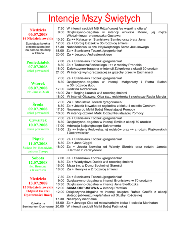 Intencje Mszy Świętych 7.30 W intencji czcicieli MB RóŜańcowej /ze wspólną ofiarą/ 9.00 Dziękczynno-błagalna w intencji wnuczki Moniki, jej Włodzimierza i prawnuczka Gustawa 14 Niedziela zwykła 10.30 Za ++ Katarzynę i Stanisława Samiec oraz brata Jana 12.00 Za + Dorotę Bączek w 35 rocznicę śmierci Dzisiejsza kolekta przeznaczona jest 17.30 NaboŜeństwo ku czci Najświętszego Serca Jezusowego na pomoc dla misji 18.00 Za + Stanisława Toczek /gregorianka/ w Chaco 20.00 Za + Jerzego Andrzejewskiego Niedziela 06.07.2008 Poniedziałek 07.07.2008 dzień powszedni Wtorek 08.07.2008 św. Jana z Dukli Środa 09.07.2008 dzień powszedni Czwartek 10.07.2008 dzień powszedni 7.00 8.30 18.00 21.00 męŜa Za + Stanisława Toczek /gregorianka/ Za + Tadeusza Ferfeckiego i ++ z rodziny Pronobis Dziękczynno-błagalna w intencji Zbigniewa z okazji 30 urodzin W intencji wynagradzającej za grzechy przeciw Eucharystii 7.00 Za + Stanisława Toczek /gregorianka/ 8.30 Dziękczynno-błagalna w intencji Małgorzaty i Piotra Białoń w 30 rocznicę ślubu 17.00 Godzina RóŜańcowa 18.00 Za + Reginę Łukasik w 3 rocznicę śmierci 18.00 W intencji Ojczyzny; Ojca św., redaktorów i słuchaczy Radia Maryja 7.00 8.30 17.30 18.00 Za + Stanisława Toczek /gregorianka/ Za + Józefa Nowaka od sąsiadów z bloku 4 osiedla Centrum Nowenna do Matki BoŜej Nieustającej Pomocy W intencji czcicieli Matki BoŜej Nieustającej Pomocy 7.00 8.30 17.00 18.00 Za + Stanisława Toczek /gregorianka/ Dziękczynno-błagalna w intencji Emila z okazji 70 urodzin Adoracja Najświętszego Sakramentu Za ++ Helenę Rodowską, jej rodziców oraz ++ z rodzin: Piątkowskich i Dobrowolskich Piątek 11.07.2008 7.00 Za + Stanisława Toczek /gregorianka/ 8.30 Za + Jana Cięgiel 18.00 Za + Józefa Nowaka od Wandy Skrobis oraz rodzin: Janota Święto św. Benedykta, i Herman z Zebrzydowic patrona Europy Sobota 12.07.2008 św. Brunona z Kwerfurtu 7.00 8.30 16.00 18.00 7.30 9.00 10.30 15 Niedziela zwykła 12.00 Odpust ku czci 12.00 Za + Stanisława Toczek /gregorianka/ Za + Władysława Dudek w 8 rocznicę śmierci Msza św. w Domu Spokojnej Starości Za + Henryka w 2 rocznicę śmierci Za + Stanisława Toczek /gregorianka/ Dziękczynno-błagalna w intencji Bronisława w 70 urodziny Dziękczynno-błagalna w intencji Jana Siedloczka SUMA ODPUSTOWA w intencji Parafian Dziękczynno-błagalna w intencji księdza Rafała Greiffa z okazji Opatrzności BoŜej złotego jubileuszu kapłaństwa od SłuŜby Kościelnej 17.30 Nieszpory niedzielne 18.00 Za + Jerzego Ciba od mieszkańców bloku 1 osiedla Manhatan Kolekta na Seminarium Duchowne 20.00 W intencji czcicieli Matki BoŜej Fatimskiej Niedziela 13.07.2008