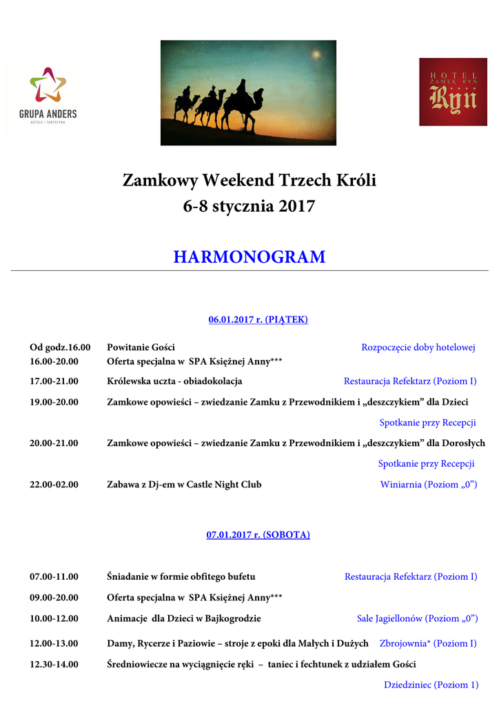Zamkowy Weekend Trzech Króli 6-8 stycznia 2017 HARMONOGRAM 06.01.2017 r. (PIĄTEK) Od godz.16.00 16.00-20.00 Powitanie Gości Oferta specjalna w SPA Księżnej Anny*** 17.00-21.00 Królewska uczta - obiadokolacja 19.00-20.00 Zamkowe opowieści – zwiedzanie Zamku z Przewodnikiem i „deszczykiem” dla Dzieci Rozpoczęcie doby hotelowej Restauracja Refektarz (Poziom I) Spotkanie przy Recepcji 20.00-21.00 Zamkowe opowieści – zwiedzanie Zamku z Przewodnikiem i „deszczykiem” dla Dorosłych Spotkanie przy Recepcji 22.00-02.00 Zabawa z Dj-em w Castle Night Club Winiarnia (Poziom „0”) 07.01.2017 r. (SOBOTA) 07.00-11.00 Śniadanie w formie obfitego bufetu 09.00-20.00 Oferta specjalna w SPA Księżnej Anny*** 10.00-12.00 Animacje dla Dzieci w Bajkogrodzie 12.00-13.00 Damy, Rycerze i Paziowie – stroje z epoki dla Małych i Dużych 12.30-14.00 Średniowiecze na wyciągnięcie ręki – taniec i fechtunek z udziałem Gości Restauracja Refektarz (Poziom I) Sale Jagiellonów (Poziom „0”) Zbrojownia* (Poziom I) Dziedziniec (Poziom 1) 14.00-15.00 Grzanie, smocze ogony i kiełbaski na kiju – rodzinne ognisko Miejsce grillowe przy Zamku 15.00-17.00 Animacje dla Dzieci w Bajkogrodzie 17.00-21.00 Królewska uczta - obiadokolacja 20.00-23.00 Przyjemny dreszczyk emocji w Castle Casino** 22.00-02.00 Zabawa z Dj-em w Castle Night Club Sale Jagiellonów (Poziom „0”) Restauracja Refektarz (Poziom I) Zbrojownia* Winiarnia (Poziom „0”) 08.01.2017 r. (NIEDZIELA) 07.00-11.00 09.00-12.00 Śniadanie w formie obfitego bufetu Oferta specjalna w SPA Księżnej Anny*** Restauracja Refektarz (Poziom I) 10.00 Złociste przysmaki – Akademia Kulinarna Sala Wielki Kapitularz (Poziom II) 12.00 Zakończenie doby hotelowej Prośba o wymeldowanie * Zbrojownia budynek naprzeciwko Zamku **Płatne dodatkowo – 10 PLN/Osoba ***Oferta płatna dodatkowo PONADTO ZAPRASZAMY DO SKORZYSTANIA Z DODATKOWYCH ATRAKCJI : Centrum Rekreacji (w cenie pobytu) basen, sauny - czynne codziennie od 08.00-22.00 Bajkogród – Klub Malucha (w cenie pobytu) - codziennie w godz. 8.00 – 22.00 Sala Fitness - /Crossfit Room , stół do tenisa (w cenie pobytu) - codziennie 7.00-23.00 (bezpłatnie) – Budynek Zbrojowni Zbrojownia (kręgielnia, bilard) - czynne w piątek w godz. 17.00-23.00, sobota-niedziela w godz. 15.00-23.00