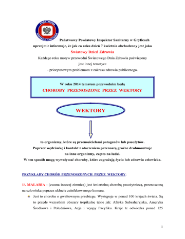 Państwowy Powiatowy Inspektor Sanitarny w Gryficach uprzejmie informuje, Ŝe jak co roku dzień 7 kwietnia obchodzony jest jako Światowy Dzień Zdrowia KaŜdego roku motyw przewodni Światowego Dnia Zdrowia poświęcony jest innej tematyce - priorytetowym problemom z zakresu zdrowia publicznego. W roku 2014 tematem przewodnim będą CHOROBY PRZENOSZONE PRZEZ WEKTORY WEKTORY to organizmy, które są przenosicielami patogenów lub pasoŜytów. Poprzez wędrówkę i kontakt z otoczeniem przenoszą groźne drobnoustroje na inne organizmy, często na ludzi. W ten sposób mogą wywoływać choroby, które zagraŜają Ŝyciu lub zdrowiu człowieka. PRZYKŁADY CHORÓB PRZENOSZONYCH PRZEZ WEKTORY: 1/. MALARIA - (zwana inaczej zimnicą) jest śmiertelną chorobą pasoŜytniczą, przenoszoną na człowieka poprzez ukłucie zainfekowanego komara. Jest to choroba o gwałtownym przebiegu. Występuje w ponad 100 krajach świata. Są to przede wszystkim obszary tropikalne takie jak: Afryka Subsaharyjska, Ameryka Środkowa i Południowa, Azja i wyspy Pacyfiku. Kraje te odwiedza ponad 125 1 milionów turystów rocznie, a około 30 tysięcy z nich wraca zaraŜonych zarodźcem malarii. Zachorowaniu na malarię moŜna zapobiegać, poprzez: o unikanie ukąszeń komarów poprzez stosowanie środków odstraszających, o przebywanie w pomieszczeniach zamkniętych po zachodzie słońca, poniewaŜ komary wykazują największą aktywność w nocy, o stosowanie odpowiednich leków przeciwmalarycznych, zwane chemioprofilaktyką lub profilaktyką farmakologiczną. polega na stosowaniu niewielkich dawek leków przeciwmalarycznych przez osobę podróŜującą w rejony występowania malarii, co powstrzymuje namnaŜanie i rozwój zarodźców w organizmie turysty w razie ukłucia przez zaraŜonego pasoŜytem komara. Wszystkie leki przeciwmalaryczne wydawane są dla podróŜnych na podstawie recepty lekarskiej. W celu ustalenia zasad profilaktyki malarii oraz wyboru właściwego leku najlepiej udać się do poradni medycyny podróŜy, a wcześniej przygotować najwaŜniejsze dane na temat wycieczki, tj. szczegółowa jej trasa, okres pobytu w tropiku i termin wyjazdu oraz , planowane na wakacjach aktywności. Szczegółowe wiadomości, co do planów wyjazdowych pozwalają lekarzowi ocenić bezpieczeństwo podróŜy oraz dokonać optymalnego wyboru metod zapobiegania malarii Początkowe objawy malarii mogą przypominać przeziębienie, dlatego jeŜeli wystąpi jeden z objawów takich jak: gorączka, osłabienie, ból głowy czy ból mięśni naleŜy natychmiast zgłosić się do lekarza. Szybkie rozpoznanie i pilne leczenie ratuje Ŝycie! 2 2/. BORELIOZA, KLESZCZOWE ZAPALENIE MÓZGU choroby przenoszone przez kleszcze Kleszcze to stawonogi, które są pasoŜytami zewnętrznymi ludzi i zwierząt. Przenoszą liczne patogeny, takie jak wirusy, bakterie czy pierwotniaki, które wywołują u człowieka bardzo groźne choroby zakaźne i pasoŜytnicze. Występują najczęściej na łonie natury, moŜna je spotkać w lesie, na łące, w okolicach jezior czy w parkach miejskich. śyją w strefie przygruntowej, w miejscach lekko wilgotnych i obfitujących w roślinność. Znajdują się na spodniej stronie liści lub na gałęziach w pobliŜu ścieŜek, po których chodzimy. Istnieje ponad 800 gatunków kleszczy, z czego w Polsce Ŝyje 21 gatunków. Aktywność kleszczy rozpoczyna się gdy temperatura przekroczy 8ºC ,czyli zazwyczaj wraz z nadejściem wiosny i trwa do jesieni. Łagodna zima i wilgotne lato sprzyjają wysokiej rozrodczości i małej umieralności kleszczy, co powoduje zwiększenie tempa ich rozprzestrzeniania się. Kleszcze w czasie ukłucia przekazują do krwi ludzi i zwierząt bakterie i wirusy, które mogą wywoływać groźne choroby zakaźne. Ukąszenie jest bezbolesne, poniewaŜ ślina kleszcza zawiera wiele substancji biochemicznych, w tym substancje łagodzące ból, które powodują, Ŝe nie czujemy ukłucia. Do zakaŜenia człowieka dochodzi w trakcie ssania krwi przez kleszcza, w sytuacji gdy pasoŜyt jest zakaŜony bakteriami i wirusami wywołującymi choroby. Najgroźniejsza jest bakteria – krętek – wywołująca boreliozę i wirusy powodujące wirusowe zapalenie mózgu. Obie choroby stwarzają niebezpieczne dla zdrowia powikłania. Aby upragnionego wypoczynku na łonie natury nie zakłócił stres związany z ukłuciem kleszcza, naleŜy pamiętać o właściwej profilaktyce, tj. odpowiednie ubranie – nosić w lesie odpowiednią odzieŜ zakrywającą jak najwięcej części ciała tj. długie spodnie i koszule z długim rękawem najlepiej zakończone ściągaczem, pełne obuwie i skarpety. NaleŜy unikać jaskrawych kolorów, bo te najbardziej przykuwają uwagę kleszczy; 3 staranne obejrzenie całego ciała po powrocie z lasu lub parku. Kleszcze zanim zakotwiczą się w skórze, poszukują odpowiedniego miejsca do wkłucia. U dzieci najczęściej / w około 70% przypadków / lokalizują się na głowie, zazwyczaj na granicy włosów i za uszami. U dorosłych w miejscach, gdzie skóra jest delikatna np. pod kolanami, w pachwinach, zgięciach stawów, na brzuchu. Właściwości skóry dziecka sprzyjają silniejszym odczynom po ukąszeniach; stosowanie środków odstraszających (repelentów), których substancje aktywne powodują, Ŝe człowiek jest niewyczuwalny dla kleszczy. Środki te dostępne są w aptekach; W przypadku zauwaŜenia kleszcza naleŜy go jak najszybciej usunąć ze skóry. Ryzyko zakaŜenia rośnie wraz z czasem zakotwiczenia na ciele ofiary. Kleszcza ze skóry naleŜy wyciągnąć pęsetą a miejsce ukłucia zdezynfekować. Nie wolno go wcześniej smarować tłuszczem, poniewaŜ dusząc się, zwiększa wydzielanie śliny, w której mogą być bakterie lub wirusy. Jeśli po ukłuciu przez kleszcza (lub pobycie w lesie) zauwaŜymy na skórze nietypowy rumień naleŜy niezwłocznie zgłosić się do lekarza. Nie moŜna lekcewaŜyć Ŝadnej zmiany. Lekarz zadecyduje czy potrzebne jes