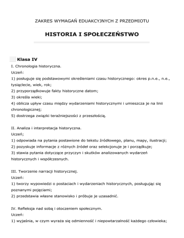 ZAKRES WYMAGAŃ EDUAKCYJNYCH Z PRZEDMIOTU HISTORIA I SPOŁECZEŃSTWO Klasa IV I. Chronologia historyczna. Uczeń: 1) posługuje się podstawowymi określeniami czasu historycznego: okres p.n.e., n.e., tysiąclecie, wiek, rok; 2) przyporządkowuje fakty historyczne datom; 3) określa wieki; 4) oblicza upływ czasu między wydarzeniami historycznymi i umieszcza je na linii chronologicznej; 5) dostrzega związki teraźniejszości z przeszłością. II. Analiza i interpretacja historyczna. Uczeń; 1) odpowiada na pytania postawione do tekstu źródłowego, planu, mapy, ilustracji; 2) pozyskuje informacje z różnych źródeł oraz selekcjonuje je i porządkuje; 3) stawia pytania dotyczące przyczyn i skutków analizowanych wydarzeń historycznych i współczesnych. III. Tworzenie narracji historycznej. Uczeń: 1) tworzy wypowiedzi o postaciach i wydarzeniach historycznych, posługując się poznanymi pojęciami; 2) przedstawia własne stanowisko i próbuje je uzasadnić. IV. Refleksja nad sobą i otoczeniem społecznym. Uczeń: 1) wyjaśnia, w czym wyraża się odmienność i niepowtarzalność każdego człowieka; 2) podaje przykłady różnorodnych potrzeb człowieka oraz sposoby ich zaspokajania; 3) wyjaśnia znaczenie rodziny w życiu oraz wskazuje przykłady praw i obowiązków przysługujących poszczególnym członkom rodziny; 4) wyraża opinię na temat kultywowania tradycji i gromadzenia pamiątek rodzinnych; 5) charakteryzuje społeczność szkolną, z uwzględnieniem swoich praw i obowiązków; 6) podaje przykłady działań samorządu uczniowskiego w swojej szkole; 7) tłumaczy, odwołując się do przykładów, na czym polega postępowanie sprawiedliwe; 8) wyjaśnia, w czym przejawia się uprzejmość i tolerancja; 9) podaje przykłady konfliktów między ludźmi i proponuje sposoby ich rozwiązywania. V. „Mała Ojczyzna”. Uczeń: 1) opisuje swoją „małą Ojczyznę”, uwzględniając tradycję historyczno-kulturową i problemy społeczno-gospodarcze; 2) zbiera informacje o rozmaitych formach upamiętniania postaci i wydarzeń z przeszłości „małej Ojczyzny”; 3) wskazuje na planie miejscowości, siedzibę władz lokalnych i na przykładach omawia zakres działań oraz sposoby powoływania władz. VI. Ojczyzna. Uczeń: 1) wymienia i tłumaczy znaczenie najważniejszych świąt narodowych, symboli państwowych i miejsc ważnych dla pamięci narodowej; 2) wskazuje na mapie i opisuje główne regiony Polski; 3) wymienia mniejszości narodowe i etniczne żyjące w Polsce i na wybranych przykładach opisuje ich kulturę i tradycje oraz wymienia miejsca największych skupisk Polaków na świecie. VII. Historia jako dzieje. Uczeń: 1) odróżnia historię rozumianą jako dzieje, przeszłość od historii rozumianej jako opis dziejów przeszłości; 2) wyjaśnia, na czym polega praca historyka; 3) podaje przykłady różnych źródeł historycznych i wyjaśnia, dlaczego należy je chronić. VIII. Pierwsze cywilizacje. Uczeń: 1) opisuje życie pierwszych ludzi 2) wymienia i wskazuje cywilizacje starożytne ; 3) charakteryzuje osiągnięcia mieszkańców starożytnego Egiptu i Mezopotamii. IX. Fundamenty Europy. Uczeń: 1) wyjaśnia znaczenie wynalazku pisma dla wspólnoty ludzkiej; 2) opisuje życie w Atenach peryklejskich, używając pojęć: teatr, filozofia, bogowie olimpijscy, mity (Herakles, Odyseusz), olimpiada; 3) charakteryzuje osiągnięcia Rzymu, używając pojęć i terminów: prawo rzymskie, drogi, wodociągi; 4) opisuje narodziny chrześcijaństwa i jego rozpowszechnianie w czasach starożytnych. Klasa V I. Epoka średniowiecze. Uczeń: 1) określa okoliczności i datę upadku Rzymu; 2) opisuje zmiany w sposobie życia na przełomie antyku i średniowiecza. II. Państwo polskie za Piastów. Uczeń: 1) wymienia plemiona słowiańskie zamieszkujące ziemie polskie i opisuje ich kulturę; 2) wskazuje na mapie Gniezno i państwo Mieszka I; 3) opisuje panowanie Mieszka I, umiejscawiając je w czasie i używając pojęć: plemię, gród, drużyna, książę; 4) charakteryzuje przyczyny i skutki chrztu Polski; 5) opowiada historię zjazdu gnieźnieńskiego, uwzględniając postacie: św. Wojciecha, Bolesława Chrobrego i Ottona III; 6) wskazuje na mapie Kraków i państwo Kazimierza Wielkiego, umiejscawiając je w czasie; 6) opowiada o panowaniu Kazimierza Wielkiego, z uwzględnieniem powstania Akademii Krakowskiej i uczty u Wierzynka. III. Mnisi. Uczeń: 1) opisuje klasztor średniowieczny i tryb życia mnichów, używając pojęć: zakon, reguła, ubóstwo; 2) charakteryzuje postać św. Franciszka z Asyżu. 3) rozpoznaje i opisuje przykłady sztuki romańskiej i gotyckiej. IV. Rycerze. Uczeń: 1) charakteryzuje zamek średniowieczny i jego mieszkańców; 2) opisuje charakterystyczne cechy wzoru osobowego średniowiecznego rycerza. 3) opisuje wyposażenie rycerza i rycerskie obyczaje; 4) opisuje okoliczności powstania i przybycia do Polski zakonu krzyżackiego; 5) charakteryzuje rozwój stosunków polsko-krzyżackich. V. Mieszczanie. Uczeń: 1) opisuje miasto średniowieczne, używając pojęć: kupiec, rzemieślnik, cech, burmistrz, samorząd miejski, rynek, mury miejskie; 2) porównuje warunki życia w mieście średniowiecznym i współczesnym. VI. Chłopi. Uczeń: 1) opisuje warunki życia na wsi średniowiecznej; 2) porównuje życie chłopa z życiem rycerza i mieszczanina. VII. Odkrycie Nowego Świata. Uczeń: 1) umieszcza najważniejsze wyprawy odkrywcze w czasie i w przestrzeni; 2) opisuje odkrycie Krzysztofa Kolumba, używając pojęć: karawela, Nowy Świat, Indianie, broń palna; 3) wymienia przyczyny i następstwa wypraw odkrywczych dla Europy i dla Ameryki. VIII. Mikołaj Kopernik i jego odkrycie. Uczeń: 1) opowiada o życiu Mikołaja Kopernika, używając pojęć: uczony, astronom, odkrycie naukowe; 2) opisuje i umieszcza w czasie odkrycie Mikołaja Kopernika, wyjaśniając, co znaczy powiedzenie: „Wstrzymał Słońce, ruszył Ziemię”. 3) ocenia