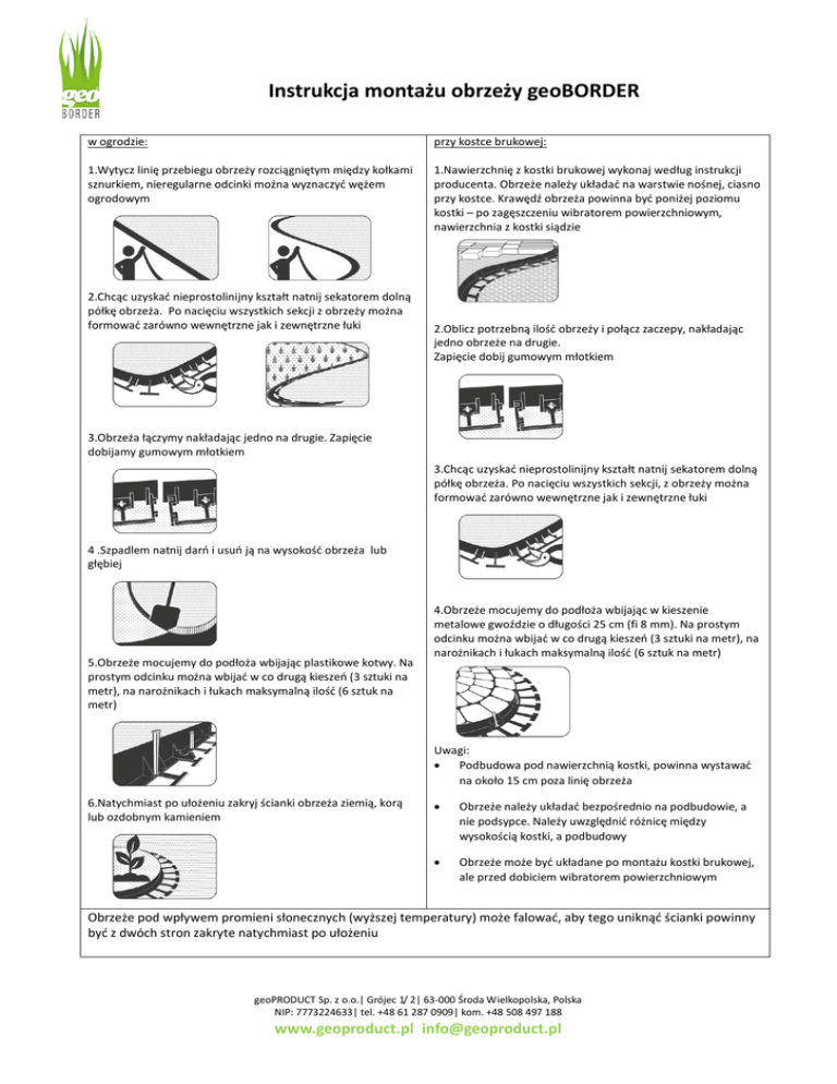 Instrukcja montażu obrzeży geoBORDER w ogrodzie: przy kostce brukowej: 1.Wytycz linię przebiegu obrzeży rozciągniętym między kołkami sznurkiem, nieregularne odcinki można wyznaczyć wężem ogrodowym 1.Nawierzchnię z kostki brukowej wykonaj według instrukcji producenta. Obrzeże należy układać na warstwie nośnej, ciasno przy kostce. Krawędź obrzeża powinna być poniżej poziomu kostki – po zagęszczeniu wibratorem powierzchniowym, nawierzchnia z kostki siądzie 2.Chcąc uzyskać nieprostolinijny kształt natnij sekatorem dolną półkę obrzeża. Po nacięciu wszystkich sekcji z obrzeży można formować zarówno wewnętrzne jak i zewnętrzne łuki 2.Oblicz potrzebną ilość obrzeży i połącz zaczepy, nakładając jedno obrzeże na drugie. Zapięcie dobij gumowym młotkiem 3.Obrzeża łączymy nakładając jedno na drugie. Zapięcie dobijamy gumowym młotkiem 3.Chcąc uzyskać nieprostolinijny kształt natnij sekatorem dolną półkę obrzeża. Po nacięciu wszystkich sekcji, z obrzeży można formować zarówno wewnętrzne jak i zewnętrzne łuki 4 .Szpadlem natnij darń i usuń ją na wysokość obrzeża lub głębiej 5.Obrzeże mocujemy do podłoża wbijając plastikowe kotwy. Na prostym odcinku można wbijać w co drugą kieszeń (3 sztuki na metr), na narożnikach i łukach maksymalną ilość (6 sztuk na metr) 4.Obrzeże mocujemy do podłoża wbijając w kieszenie metalowe gwoździe o długości 25 cm (fi 8 mm). Na prostym odcinku można wbijać w co drugą kieszeń (3 sztuki na metr), na narożnikach i łukach maksymalną ilość (6 sztuk na metr) Uwagi: Podbudowa pod nawierzchnią kostki, powinna wystawać na około 15 cm poza linię obrzeża 6.Natychmiast po ułożeniu zakryj ścianki obrzeża ziemią, korą lub ozdobnym kamieniem Obrzeże należy układać bezpośrednio na podbudowie, a nie podsypce. Należy uwzględnić różnicę między wysokością kostki, a podbudowy Obrzeże może być układane po montażu kostki brukowej, ale przed dobiciem wibratorem powierzchniowym Obrzeże pod wpływem promieni słonecznych (wyższej temperatury) może falować, aby tego uniknąć ścianki powinny być z dwóch stron zakryte natychmiast po ułożeniu geoPRODUCT Sp. z o.o.| Grójec 1/ 2| 63-000 Środa Wielkopolska, Polska NIP: 7773224633| tel. +48 61 287 0909| kom. +48 508 497 188 www.geoproduct.pl [email protected]