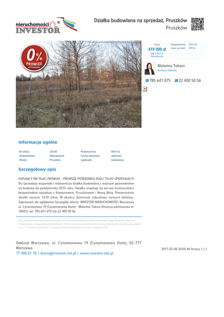 Działka budowlana na sprzedaż, Pruszków Pruszków Cena 419 000 zł Powierzchnia Cena za metr 839 m2 499 zł lub 1 821 zł miesięcznie Malwina Tokarz Dyrektor Oddziału 785 641 075 22 400 50 56 Informacje ogólne Nr oferty 20136 Powierzchnia 839 m2 Województwo Mazowieckie Forma własności własność Miasto Pruszków typdzialki budowlana Szczegółowy opis KUPUJĄCY NIE PŁACI PROWIZJI - PROWIZJĘ POŚREDNIKA PŁACI TYLKO SPRZEDAJĄCY! Do sprzedaży wspaniała i malownicza działka budowlana z ważnym pozwoleniem na budowę do października 2015 roku. Działka znajduję się we wsi Granica,która bezpośrednio sąsiaduje z Komorowem, Pruszkowem i Nową Wsią. Powierzchnia działki wynosi 1678 mkw. W okolicy dominuje zabudowa nowych domów. Zapraszam do oglądania! Szczegóły oferty: INVESTOR NIERUCHOMOŚCI Warszawa ul. Cynamonowa 19 (Cynamonowy Dom) - Malwina Tokarz (licencja państwowa nr 18501), tel. 785 641 075 lub 22 400 50 56. Nota prawna: Informacje dotyczące opisu nieruchomości podane są przez właściciela, mają charakter wyłącznie informacyjny i mogą podlegać aktualizacji. Oferta dotycząca nieruchomości stanowi zaproszenie do rokowań zgodnie z art. 71 Kodeksu Cywilnego i nie stanowi oferty określonej w art. 66 i następnych KC. Oddział Warszawa, ul. Cynamonowa 19 (Cynamonowy Dom), 02-777 Warszawa 77 400 01 76 • [email protected] • www.investor.net.pl 2017-03-08 20:05:44 Strona 1 z 1