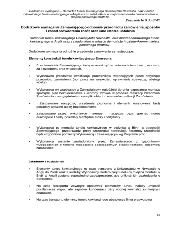 Dodatkowe wymagania – Demontaż tunelu kawitacyjnego Uniwersytetu Newcastle oraz montaż odnowionego tunelu kawitacyjnego w Anglii wraz z załadunkiem w miejscu demontażu i rozładunkiem w miejscu ponownego montażu . Załącznik Nr 5 do SIWZ Dodatkowe wymagania Zamawiającego odnośnie przedmiotu zamówienia, sposobu i zasad prowadzenia robót oraz inne istotne ustalenia Demontaż tunelu kawitacyjnego Uniwersytetu Newcastle oraz montaż odnowionego tunelu kawitacyjnego w Anglii wraz z załadunkiem w miejscu demontażu i rozładunkiem w miejscu ponownego montażu. Dodatkowe wymagania odnośnie przedmiotu zamówienia są następujące: Elementy konstrukcji tunelu kawitacyjnego Emersona: Przedstawiciele Zamawiającego będą uczestniczyć w nadzorach demontażu, montażu, za i rozładunku oraz w próbach. Wykonawca przedstawi kwalifikacje pracowników wykonujących prace dotyczące przedmiotu zamówienia (np. prace na wysokości, uprawnienia spawaczy, obsługa wózka). Wykonawca we współpracy z Zamawiającym najpóźniej do dnia rozpoczęcia montażu sporządzi plan bezpieczeństwa i ochrony zdrowia w procesie realizacji Przedmiotu Zamówienia z uwzględnieniem specyfiki obiektu i warunków realizacji Zamówienia. Zastosowane narzędzia, urządzenia podnośne i elementy rusztowania będą posiadały aktualne atesty bezpieczeństwa Zastosowane przez Wykonawcę materiały i narzędzia będą spełniać normy europejskie I będą posiadały niezbędne atesty i certyfikaty. Wykonawca po montażu tunelu kawitacyjnego w budynku w Blyth w obecności Zamawiającego przeprowadzi próby szczelności konstrukcji. Paramety szczelności będą uzgodnione pomiędzy Wykonawcą i Zamawiającym wg Programu prób. Wykonawca zostanie zawiadomiony przez Zamawiającego z tygodniowym wyprzedzeniem o terminie rozpoczęcia poszczególnych etapów realizacji przedmiotu zamówienia Załadunek i rozładunek Elementy tunelu kawitacyjnego na czas transportu z Uniwersytetu w Newcastle w Anglii do Polski oraz z siedziby Wykonawcy modernizacji tunelu do miejsca montażu w Blyth w Anglii zostaną odpowiednio zabezpieczone, aby uniknąć ich uszkodzenia w transporcie. Na czas transportu wewnątrz opakowań elementów tunelu należy umieścić pochłaniacze wilgoci aby zapobiec kondensacji pary wodnej wewnątrz zamkniętych opakowań. Na czas transportu elementy tunelu kawitacyjnego ubezpieczy firma przewozowa 1/2 Dodatkowe wymagania – Demontaż tunelu kawitacyjnego Uniwersytetu Newcastle oraz montaż odnowionego tunelu kawitacyjnego w Anglii wraz z załadunkiem w miejscu demontażu i rozładunkiem w miejscu ponownego montażu . Załącznik Nr 5 do SIWZ Montaż i próby szczelności Wykonawca własnym staraniem i na własny koszt zabezpieczy miejsce demontażu i montażu tunelu wraz ze znajdującymi się na nim obiektami i urządzeniami, zapewni warunki bezpieczeństwa, a także utrzyma w należytym porządku i stanie technicznym pomieszczenia w budynku tunelu kawitacyjnego Uniwersytetu Newcastle, udostępnione Wykonawcy na czas wykonywania prac związanych z realizacją przedmiotu zamówienia oraz drogi wykorzystywane w celach transportowych na potrzeby realizacji niniejszej Zamówienia Wykonawca będzie składować materiały i urządzenia nie stwarzając przeszkód komunikacyjnych, a także na własny koszt usunie wszystkie odpady i śmieci z terenu realizacji Zamówienia, przy przestrzeganiu przepisów obowiązujących w zakresie utylizacji odpadów. Wykonawca niezwłoczne usunie, własnym staraniem i na własny koszt, ewentualne szkody powstałe z jego winy w związku z realizacją przedmiotu zamówienia Wykonawca zabezpieczy we własnym zakresie osprzęt i narzędzia niezbędne do przeprowadzenia demontażu (Zamawiający zabezpieczy odpowiedni dźwig do usuwania elementów tunelu z budynku tunelu poprzez świetlik dachowy lub dach budynku w Newcastle), montażu tunelu kawitacyjnego w miejscu montażu w Blyth (hala dysponuje suwnicą o udźwigu 10T). Wykonawca winien brać pod uwagę utrudnienia w zakresie realizacji przedsięwzięcia z uwagi na funkcjonowanie uczelni, szczególnie w strefie dydaktycznej Zalecenia lokalnego inspektora BHP muszą być ściśle przestrzegane. Wykonawca wraz z Zamawiającym zobowiązany jest za organizację ruchu i zabezpieczenie miejsc w zakresie za i rozładunku. 2/2