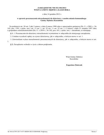 ZARZĄDZENIE NR OG/184/2012 WÓJTA GMINY DĘBNICA KASZUBSKA z dnia 14 grudnia 2012 r. w sprawie przeznaczenia nieruchomości do dzierżawy z zasobu mienia komunalnego Gminy Dębnica Kaszubska Na podstawie art. 30 ust. 2 pkt 3 ustawy z dnia 8 marca 1990 roku o samorządzie gminnym (Dz. U. z 2001 r., Nr 142, poz. 1591, z późn. zm.), art. 13 ust. 1, art. 25 ust. 1 i art. 35 ust. 1 i 2 ustawy z dnia 21 sierpnia 1997 roku o gospodarce nieruchomościami (Dz. U. z 2010 r., Nr 102, poz. 651, z późn. zm.) - zarzadzam, co nastepuje: § 1. 1. Przeznaczam do dzierżawy nieruchomości wymienione w załączniku do niniejszego zarządzenia. 2. Ustalam wysokość opłaty za czynsz dzierżawny, jak w załączniku, o którym mowa w ust. 1. 3. Zatwierdzam wykaz nieruchomości przeznaczonych do dzierżawy, jak w załączniku, o którym mowa w ust. 1. § 2. Zarządzenie wchodzi w życie z dniem podpisania. Wójt Gminy Dębnica Kaszubska Eugeniusz Dańczak ————————————————————————————————————————————————————————— Id: 84AA2785-2E37-4373-BDD4-DE231EB4446B. Podpisany Strona 1 Załącznik do Zarządzenia Nr OG/184/2012 Wójta Gminy Dębnica Kaszubska z dnia 14 grudnia 2012 r. Wykaz nieruchomości przeznaczonej do dzierżawy. lp 1 2 3 4 5 6 7 8 Oznaczenie nieruchomości Opis przedmiotu dzierżawy Powierzchnia przedmiotu dzierżawy Przeznaczenie w planie Wysokość opłat z tytułu dzierżawy Termin wnoszenia opłat Zasady aktualizacj opłat Przeznaczenie do dzierżawy 1 część działki nr 135/6 położonej w obrębie Dobra działka rolna 0,1750 ha brak aktualnego planu zagospodarowania przstrzennego a studium uwarunkowań i kierunków zagospodarowania przestrzennego gminy Dębnica Kaszubsk przewiduje obszary rolniczej przestrzeni produkcyjnej. Granice otuliny parku krajobrazowego „Dolina Słupi”. 350 zł/ha rocznie 14 dni od dnia podpisania umowy - dzierżawa na okres 1 roku na cele rolne 2 działka nr 1250/2 działka nie położona zabudowana w obrębie Dębnica Kaszubska 0,0840 ha brak aktualnego planu 400 zł/ha zagospodarowania rocznie przestrzennego a studium uwarunkowań i kierunków zagospodarowania przestrzennego gminy Dębnica Kaszubska przewiduje obszary zabudowanych wiejskich jednostek osadniczych wskazanych do przekształceń i uzupełnień zabudowy na cele funkcji mieszkaniowych oraz działalności gospodarczych. Granica głównego zbiornika wód podziemnych 117. Granice otuliny parku krajobrazowego Dolina Słupi 14 dni od dnia podpisana umowy - dzierżawa na okres 1 roku z przeznaczeniem na grunty przydomowe 3 część działki nr 628/6 położonej w obrębie Dębnica Kaszubska 0,4000 ha brak aktualnego planu zagospodarowania przestrzennego a studium uwarunkowań i kierunków zagospodarowania przestrzennego gminy Dębnica Kaszubska przewiduje obszary rolniczej przestrzeni produkcyjnej. Część działki położona jest w obszarze Natura 2000 – SOO „Dolina Rzeki Słupi”. Przez działkę przebiega linia energetyczna 110 kV ad1)płatność do 31 grudnia danego roku ad 2) płatność 2 razy w roku do 30 czerwca i 30 grudnia danego roku opłaty podlegają waloryzacj i o wskaźni k inflacji ogłaszany przez Prezesa GUS dzierżawa na okres 35 lat w drodze bezprzetargowej na realizację urządzeń infrastruktury technicznej, do czasu rozpoczęcia budowy na cele zgodnie z umową. działka nie zabudowana 1)600 zł rocznie do czasu rozpoczęcia budowy 2)od dnia rozpoczęcia budowy 0,50 zł/m² miesięcznie ————————————————————————————————————————————————————————— Id: 84AA2785-2E37-4373-BDD4-DE231EB4446B. Podpisany Strona 1