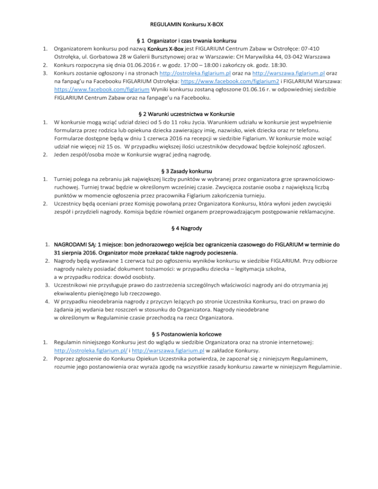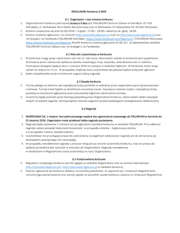 REGULAMIN Konkursu X-BOX § 1 Organizator i czas trwania konkursu 1. Organizatorem konkursu pod nazwą Konkurs X-Box jest FIGLARIUM Centrum Zabaw w Ostrołęce: 07-410 Ostrołęka, ul. Gorbatowa 28 w Galerii Bursztynowej oraz w Warszawie: CH Marywilska 44, 03-042 Warszawa 2. Konkurs rozpoczyna się dnia 01.06.2016 r. w godz. 17:00 – 18:00 i zakończy ok. godz. 18:30. 3. Konkurs zostanie ogłoszony i na stronach http://ostroleka.figlarium.pl oraz na http://warszawa.figlarium.pl oraz na fanpag’u na Facebooku FIGLARIUM Ostrołęka: https://www.facebook.com/figlarium2 i FIGLARIUM Warszawa: https://www.facebook.com/figlarium Wyniki konkursu zostaną ogłoszone 01.06.16 r. w odpowiedniej siedzibie FIGLARIUM Centrum Zabaw oraz na fanpage’u na Facebooku. § 2 Warunki uczestnictwa w Konkursie 1. W konkursie mogą wziąć udział dzieci od 5 do 11 roku życia. Warunkiem udziału w konkursie jest wypełnienie formularza przez rodzica lub opiekuna dziecka zawierający imię, nazwisko, wiek dziecka oraz nr telefonu. Formularze dostępne będą w dniu 1 czerwca 2016 na recepcji w siedzibie Figlarium. W konkursie może wziąć udział nie więcej niż 15 os. W przypadku większej ilości uczestników decydować będzie kolejność zgłoszeń. 2. Jeden zespół/osoba może w Konkursie wygrać jedną nagrodę. § 3 Zasady konkursu 1. Turniej polega na zebraniu jak największej liczby punktów w wybranej przez organizatora grze sprawnościoworuchowej. Turniej trwać będzie w określonym wcześniej czasie. Zwycięzca zostanie osoba z największą liczbą punktów w momencie ogłoszenia przez pracownika Figlarium zakończenia turnieju. 2. Uczestnicy będą oceniani przez Komisję powołaną przez Organizatora Konkursu, która wyłoni jeden zwycięski zespół i przydzieli nagrody. Komisja będzie również organem przeprowadzającym postępowanie reklamacyjne. § 4 Nagrody 1. NAGRODAMI SĄ: 1 miejsce: bon jednorazowego wejścia bez ograniczenia czasowego do FIGLARIUM w terminie do 31 sierpnia 2016. Organizator może przekazać także nagrody pocieszenia. 2. Nagrody będą wydawane 1 czerwca tuż po ogłoszeniu wyników konkursu w siedzibie FIGLARIUM. Przy odbiorze nagrody należy posiadać dokument tożsamości: w przypadku dziecka – legitymacja szkolna, a w przypadku rodzica: dowód osobisty. 3. Uczestnikowi nie przysługuje prawo do zastrzeżenia szczególnych właściwości nagrody ani do otrzymania jej ekwiwalentu pieniężnego lub rzeczowego. 4. W przypadku nieodebrania nagrody z przyczyn leżących po stronie Uczestnika Konkursu, traci on prawo do żądania jej wydania bez roszczeń w stosunku do Organizatora. Nagrody nieodebrane w określonym w Regulaminie czasie przechodzą na rzecz Organizatora. § 5 Postanowienia końcowe 1. Regulamin niniejszego Konkursu jest do wglądu w siedzibie Organizatora oraz na stronie internetowej: http://ostroleka.figlarium.pl/ i http://warszawa.figlarium.pl w zakładce Konkursy. 2. Poprzez zgłoszenie do Konkursu Opiekun Uczestnika potwierdza, że zapoznał się z niniejszym Regulaminem, rozumie jego postanowienia oraz wyraża zgodę na wszystkie zasady konkursu zawarte w niniejszym Regulaminie.