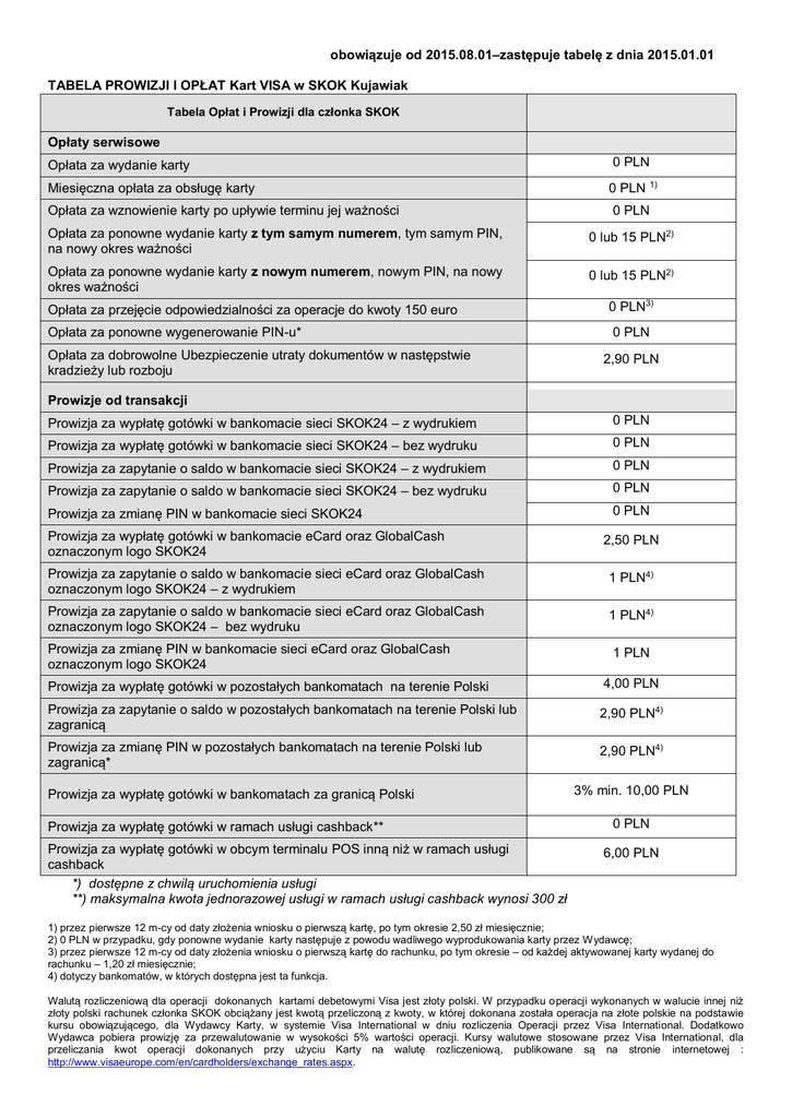 obowiązuje od 2015.08.01–zastępuje tabelę z dnia 2015.01.01 TABELA PROWIZJI I OPŁAT Kart VISA w SKOK Kujawiak Tabela Opłat i Prowizji dla członka SKOK Opłaty serwisowe Opłata za wydanie karty 0 PLN Miesięczna opłata za obsługę karty 0 PLN 1) Opłata za wznowienie karty po upływie terminu jej ważności 0 PLN Opłata za ponowne wydanie karty z tym samym numerem, tym samym PIN, na nowy okres ważności 0 lub 15 PLN2) Opłata za ponowne wydanie karty z nowym numerem, nowym PIN, na nowy okres ważności 0 lub 15 PLN2) Opłata za przejęcie odpowiedzialności za operacje do kwoty 150 euro 0 PLN3) Opłata za ponowne wygenerowanie PIN-u* 0 PLN Opłata za dobrowolne Ubezpieczenie utraty dokumentów w następstwie kradzieży lub rozboju 2,90 PLN Prowizje od transakcji Prowizja za wypłatę gotówki w bankomacie sieci SKOK24 – z wydrukiem 0 PLN Prowizja za wypłatę gotówki w bankomacie sieci SKOK24 – bez wydruku 0 PLN Prowizja za zapytanie o saldo w bankomacie sieci SKOK24 – z wydrukiem 0 PLN Prowizja za zapytanie o saldo w bankomacie sieci SKOK24 – bez wydruku 0 PLN Prowizja za zmianę PIN w bankomacie sieci SKOK24 0 PLN Prowizja za wypłatę gotówki w bankomacie eCard oraz GlobalCash oznaczonym logo SKOK24 2,50 PLN Prowizja za zapytanie o saldo w bankomacie sieci eCard oraz GlobalCash oznaczonym logo SKOK24 – z wydrukiem 1 PLN4) Prowizja za zapytanie o saldo w bankomacie sieci eCard oraz GlobalCash oznaczonym logo SKOK24 – bez wydruku 1 PLN4) Prowizja za zmianę PIN w bankomacie sieci eCard oraz GlobalCash oznaczonym logo SKOK24 1 PLN Prowizja za wypłatę gotówki w pozostałych bankomatach na terenie Polski 4,00 PLN Prowizja za zapytanie o saldo w pozostałych bankomatach na terenie Polski lub zagranicą 2,90 PLN4) Prowizja za zmianę PIN w pozostałych bankomatach na terenie Polski lub zagranicą* 2,90 PLN4) Prowizja za wypłatę gotówki w bankomatach za granicą Polski Prowizja za wypłatę gotówki w ramach usługi cashback** Prowizja za wypłatę gotówki w obcym terminalu POS inną niż w ramach usługi cashback *) dostępne z chwilą uruchomienia usługi **) maksymalna kwota jednorazowej usługi w ramach usługi cashback wynosi 300 zł 3% min. 10,00 PLN 0 PLN 6,00 PLN 1) przez pierwsze 12 m-cy od daty złożenia wniosku o pierwszą kartę, po tym okresie 2,50 zł miesięcznie; 2) 0 PLN w przypadku, gdy ponowne wydanie karty następuje z powodu wadliwego wyprodukowania karty przez Wydawcę; 3) przez pierwsze 12 m-cy od daty złożenia wniosku o pierwszą kartę do rachunku, po tym okresie – od każdej aktywowanej karty wydanej do rachunku – 1,20 zł miesięcznie; 4) dotyczy bankomatów, w których dostępna jest ta funkcja. Walutą rozliczeniową dla operacji dokonanych kartami debetowymi Visa jest złoty polski. W przypadku operacji wykonanych w walucie innej niż złoty polski rachunek członka SKOK obciążany jest kwotą przeliczoną z kwoty, w której dokonana została operacja na złote polskie na podstawie kursu obowiązującego, dla Wydawcy Karty, w systemie Visa International w dniu rozliczenia Operacji przez Visa International. Dodatkowo Wydawca pobiera prowizję za przewalutowanie w wysokości 5% wartości operacji. Kursy walutowe stosowane przez Visa International, dla przeliczania kwot operacji dokonanych przy użyciu Karty na walutę rozliczeniową, publikowane są na stronie internetowej : http://www.visaeurope.com/en/cardholders/exchange_rates.aspx.