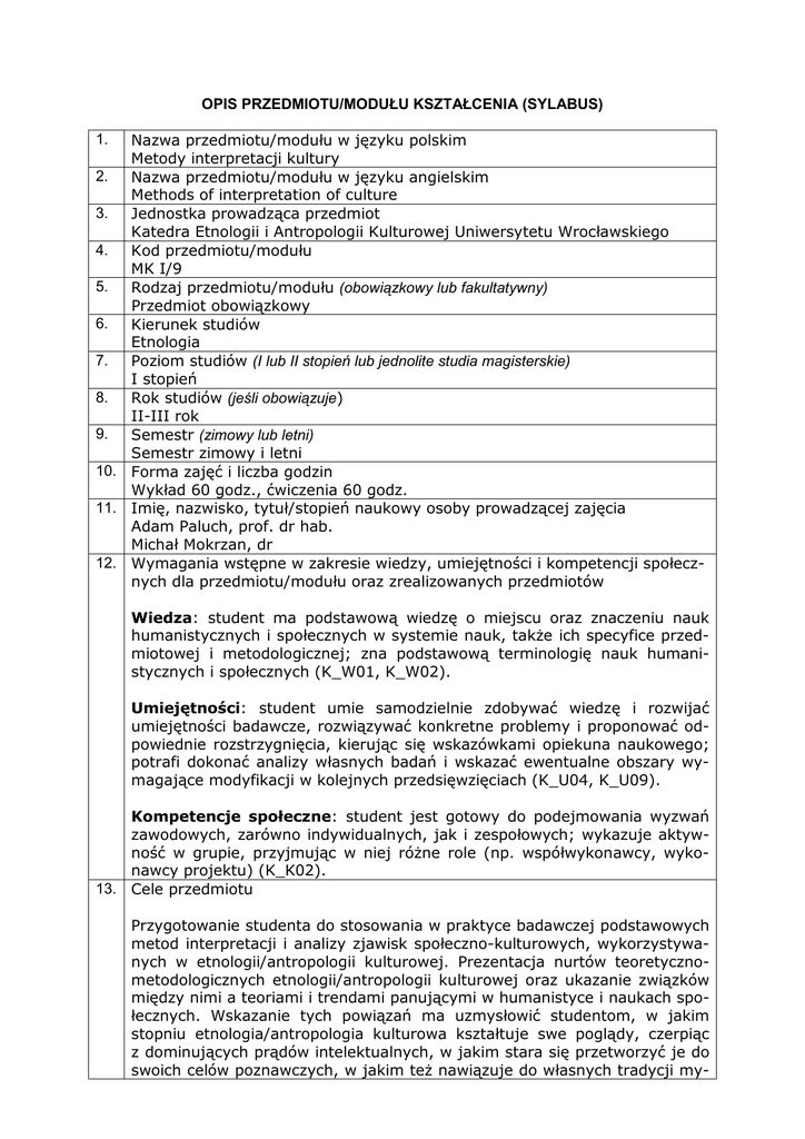 OPIS PRZEDMIOTU/MODUŁU KSZTAŁCENIA (SYLABUS) 1. Nazwa przedmiotu/modułu w języku polskim Metody interpretacji kultury 2. Nazwa przedmiotu/modułu w języku angielskim Methods of interpretation of culture 3. Jednostka prowadząca przedmiot Katedra Etnologii i Antropologii Kulturowej Uniwersytetu Wrocławskiego 4. Kod przedmiotu/modułu MK I/9 5. Rodzaj przedmiotu/modułu (obowiązkowy lub fakultatywny) Przedmiot obowiązkowy 6. Kierunek studiów Etnologia 7. Poziom studiów (I lub II stopień lub jednolite studia magisterskie) I stopień 8. Rok studiów (jeśli obowiązuje) II-III rok 9. Semestr (zimowy lub letni) Semestr zimowy i letni 10. Forma zajęć i liczba godzin Wykład 60 godz., ćwiczenia 60 godz. 11. Imię, nazwisko, tytuł/stopień naukowy osoby prowadzącej zajęcia Adam Paluch, prof. dr hab. Michał Mokrzan, dr 12. Wymagania wstępne w zakresie wiedzy, umiejętności i kompetencji społecznych dla przedmiotu/modułu oraz zrealizowanych przedmiotów Wiedza: student ma podstawową wiedzę o miejscu oraz znaczeniu nauk humanistycznych i społecznych w systemie nauk, także ich specyfice przedmiotowej i metodologicznej; zna podstawową terminologię nauk humanistycznych i społecznych (K_W01, K_W02). Umiejętności: student umie samodzielnie zdobywać wiedzę i rozwijać umiejętności badawcze, rozwiązywać konkretne problemy i proponować odpowiednie rozstrzygnięcia, kierując się wskazówkami opiekuna naukowego; potrafi dokonać analizy własnych badań i wskazać ewentualne obszary wymagające modyfikacji w kolejnych przedsięwzięciach (K_U04, K_U09). Kompetencje społeczne: student jest gotowy do podejmowania wyzwań zawodowych, zarówno indywidualnych, jak i zespołowych; wykazuje aktywność w grupie, przyjmując w niej różne role (np. współwykonawcy, wykonawcy projektu) (K_K02). 13. Cele przedmiotu Przygotowanie studenta do stosowania w praktyce badawczej podstawowych metod interpretacji i analizy zjawisk społeczno-kulturowych, wykorzystywanych w etnologii/antropologii kulturowej. Prezentacja nurtów teoretycznometodologicznych etnologii/antropologii kulturowej oraz ukazanie związków między nimi a teoriami i trendami panującymi w humanistyce i naukach społecznych. Wskazanie tych powiązań ma uzmysłowić studentom, w jakim stopniu etnologia/antropologia kulturowa kształtuje swe poglądy, czerpiąc z dominujących prądów intelektualnych, w jakim stara się przetworzyć je do swoich celów poznawczych, w jakim też nawiązuje do własnych tradycji my- ślenia. 14. Zakładane efekty kształcenia Symbole kierunkowych efektów kształcenia: Wiedza: student ma podstawową wiedzę K_W01 o miejscu oraz znaczeniu nauk humanistycznych i społecznych w systemie nauk oraz ich specyfice przedmiotowej i metodologicznej; zna podstawową terminologię stoso- K_W02 waną w naukach humanistycznych i społecznych; ma uporządkowaną wiedzę ogólną K_W03 obejmującą teorię antropologiczną oraz metodologię z zakresu nauk humanistycznych i społecznych; zna antropologiczne koncepcje kultu- K_W04 ry i społeczeństwa wypracowane w ramach kierunków metodologicznych w etnologii/antropologii kulturowej; zna najważniejsze tradycyjne oraz K_W10 współczesne nurty metodologiczne w etnologii/antropologii kulturowej (m.in. strukturalizm, semiotyka, kognitywistyka, hermeneutyka, fenomenologia, postmodernizm, poststrukturalizm); zna i rozumie podstawowe analizy i interpretacji kultury czeństwa wypracowane w orientacji metodologicznych czesnej humanistyki, w tym gii/antropologii kulturowej. metody K_W11 i społeramach współetnolo- Umiejętności: student posiada elementarne umie- K_U02 jętności z zakresu metodologii nauk humanistycznych i społecznych, obejmujące rozumienie i wyjaśnianie zjawisk społeczno-kulturowych; potrafi posługiwać się podstawowymi K_U05 narzędziami i pojęciami analitycznymi, które zostały wypracowane w ramach takich kierunków metodologicznych, jak: antropologia struktu- ralna, semiotyka kultury, antropologia kognitywna, hermeneutyka, fenomenologia, antropologia postmodernistyczna, poststrukturalizm; w oparciu o wiedzę dotyczącą teorii K_U06 antropologicznej i metodologii nauk humanistycznych potrafi projektować strategie badań antropologicznych; potrafi przeprowadzić krytyczną ana- K_U07 lizę i interpretację zjawisk społecznokulturowych z zastosowaniem metod wypracowanych przez antropologię strukturalną, tartusko-moskiewską szkołę semiotyczną, antropologię kognitywną, hermeneutykę, fenomenologię, antropologię postmodernistyczną, poststrukturalizm; posiada umiejętność merytorycznego K_U08 argumentowania z wykorzystaniem poglądów innych badaczy; potrafi porozumiewać się w języku K_U10 polskim ze specjalistami w zakresie etnologii/antropologii kulturowej; potrafi wypowiadać się w języku pol- K_U12 skim na tematy dotyczące zagadnień metodologicznych. Kompetencje społeczne: student ma świadomość poziomu K_K01 swojej wiedzy i umiejętności oraz rozumie potrzebę ciągłego dokształcania się zawodowego i indywidualnego rozwoju; potrafi odpowiednio określić prioryte- K_K03 ty (wybór metodologii i narzędzi interpretacyjnych i analitycznych) służące realizacji określonego przez siebie lub innych zadania badawczego; projektuje oraz prowadzi badania K_K04 etnologiczne i antropologiczne z wykorzystaniem metodologii i teorii antropologicznej; jest świadomy istnienia etycznego K_K05 wymiaru badań antropologicznych. 15. Treści programowe • Podstawowe modele nauki a problemy teoretyczno-metodologiczne etnologii/antropologii kulturowej. • Specyfika nauk nomotetycznych i idiograficznych. • Antropologia strukturalna: językopodobny model kultury, transformacje metaforyczno-metonimiczne, analiza strukturalna. • Semiotyka kultury: założenia szkoły tartusko-moskiewskiej, kultura jako system semiotyczny, trójaspektowa analiza semiotyczna (syntaktyka, semantyka, pragmatyka). • Antropologia kogn