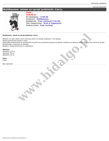 Informacje o produkcie Utworzono 08-03-2017 Waldhausen- wózek na sprzęt jeździecki -CarryCena : 519,00 zł Nr katalogowy : 1738 00 Producent : Waldhausen Dostępność : Czas realizacji 3-10 dni Stan magazynowy : brak w magazynie Średnia ocena : brak recenzji Waldhausen- wózek na sprzęt jeździecki -Carry- .p l Składany na części dzięki czemu można go zabrać na zawody wyjazdowe i inne wyjazdy. Ułatwia przenoszenie sprzętu w stajni. Górna półka przeznaczona do zamocowania skrzynki oraz powieszenia kantara lub ogłowia, środkowa do założenia siodła, dolna na inne elementy sprzęty jeździeckiego w zależności od potrzeby. Wygodny i bardzo komfortowy w użytkowaniu. al go Wymiary: Wysokość: 123 cm Szerokość: 50 cm Głębokość: 56 cm Kolor: czarny w w w .h id Bez zawartości! Wygenerowano w programie www.oscGold.com