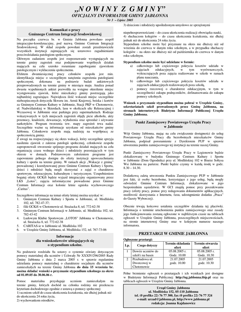 „N O W I N Y Z G M I N Y” OFICJALNY INFORMATOR GMINY JABŁONNA Nr 3 – Lipiec 2005 3) dzieciom i młodzie y upo ledzonym umysłowo ze sprz onymi Komunikat o pracy Gminnego Centrum Integracji rodowiskowej Na pocz tku czerwca br. w Gminie Jabłonna powołano zespół integracyjno-koordynacyjny, pod nazw Gminne Centrum Integracji rodowiskowej. W skład zespołu powołani zostali przedstawiciele wszystkich instytucji zajmuj cych si ustawowo zagadnieniami przeciwdziałania patologiom społecznym. Głównym zadaniem zespołu jest rozpoznawanie wyst puj cych na terenie gminy zagro e oraz podejmowanie wspólnych działa maj cych na celu szeroko rozumiane zapobieganie zjawiskom patologicznym i wykluczeniu społecznemu. Efektem dwumiesi cznej pracy członków zespołu jest min. identyfikacja miejsc o szczególnym nat eniu zagro enia patologiami społecznymi, dokonana na podstawie bada ankietowych przeprowadzonych na terenie gminy w miesi cu maju. Analiza ponad dwustu wypełnionych ankiet pozwoliła na wst pne okre lenie miejsc wyst powania zjawisk, które mieszka cy gminy postrzegaj jako najbardziej zagra aj ce. Najwi ksza ilo wskaza miejsc szczególnie niebezpiecznych dotyczyła Skweru im. Armii Krajowej, boiska i kortów za Gminnym Centrum Kultury w Jabłonnie, Stacji PKP w Chotomowie, ul. Nadwi la skiej w Skierdach, lasu w okolicach ulic Rekreacyjnej i Wczasowej w Jabłonnie oraz parkingu przy supermarketach. Rodzaje wskazywanych w tych miejscach zagro e obj ły picie alkoholu, akty przemocy, kradzie e, dewastacje, wyłudzenia oraz sprzeda i u ywanie narkotyków. Program tworzenia tzw. mapy zagro e trwa nadal. Szczególnie wa ne s informacje uzyskane od mieszka ców gminy Jabłonna. Członkowie zespołu maj nadziej na współprac ze społeczno ci gminy. Z uwagi na rozpoczynaj cy si okres wakacji, który szczególnie sprzyja nasileniu zjawisk z zakresu patologii społecznej, członkowie zespołu zaproponowali stworzenie spójnego programu działa maj cych na celu organizacj czasu wolnego dzieci i młodzie y pozostaj cych w tym okresie w domach. Podstawowym zało eniem programu jest zapewnienie pełnego dost pu do oferty instytucji upowszechniania kultury i sportu na terenie gminy. W ramach akcji „Wakacje z gmin ” prowadzonej i koordynowanej przez Gminne Centrum Kultury i Sportu, dzieci i młodzie b d mogli skorzysta z zaj o charakterze sportowym, rekreacyjnym, kulturalnym i turystycznym. Uzupełnieniem bogatej oferty GCKiS b dzie wyjazd integracyjny organizowany przez LKS „Lotos”, zaj cia informatyczne prowadzone przez Gminne Centrum Informacji oraz kolonie letnie ogniska wychowawczego „Caritas”. Szczegółowe informacje na temat oferty letniej mo na uzyska w: 1. Gminnym Centrum Kultury i Sportu w Jabłonnie, ul. Modli ska 102, tel. 782-47-37; 2. filii GCKiS w Chotomowie ul. Stra acka 8, tel. 772-62-38 3. Gminnym Centrum Informacji w Jabłonnie, ul. Modli ska 102, tel. 782-43-42 4. Ludowym Klubie Sportowym „LOTOS” Jabłonna w Chotomowie, ul. Stra acka 8, tel. 772-62-38 5. CARITAS-ie w Jabłonnie ul. Modli ska 102 6. w Urz dzie Gminy Jabłonna, ul. Modli ska 152, tel. 767-73-06 Informacje dla wnioskodawców ubiegaj cych si o stypendium szkolne. Na podstawie rozdziału 8a ustawy o systemie o wiaty dotycz cym pomocy materialnej dla uczniów i Uchwały Nr XXXIV/296/2005 Rady Gminy Jabłonna z dnia 2 marca 2005 r. w sprawie regulaminu udzielania pomocy materialnej o charakterze socjalnym dla uczniów zamieszkałych na terenie Gminy Jabłonna do dnia 15 wrze nia br. mo na składa wnioski o przyznanie stypendium szkolnego za okres od 01.09.05 do 30.06.06 r. Pomoc materialna przysługuje uczniom zamieszkałym na terenie gminy, których dochód na członka rodziny nie przekracza kryterium dochodowego zgodnie z ustaw o pomocy społecznej: 1) uczniom szkół do czasu uko czenia kształcenia, nie dłu ej jednak ni do uko czenia 24 roku ycia, 2) wychowankom o rodków, niepełnosprawno ciami – do czasu uko czenia realizacji obowi zku nauki, 4) słuchaczom kolegiów – do czasu uko czenia kształcenia, nie dłu ej jednak ni do uko czenia 24 roku ycia. Stypendium szkolne mo e by przyznane na okres nie dłu szy ni od wrze nia do czerwca w danym roku szkolnym, a w przypadku słuchaczy kolegiów – na okres nie dłu szy ni od pa dziernika do czerwca w danym roku szkolnym. Stypendium szkolne mo e by udzielane w formie: a) całkowitego lub cz ciowego pokrycia kosztów udziału w zaj ciach edukacyjnych, w tym wyrównawczych, wykraczaj cych poza zaj cia realizowane w szkole w ramach planu nauczania, b) całkowitego lub cz ciowego pokrycia kosztów udziału w zaj ciach edukacyjnych realizowanych poza szkoł , c) pomocy rzeczowej o charakterze edukacyjnym, w tym w szczególno ci zakupu podr czników, dofinansowania do zakupu pomocy szkolnych. Wniosek o przyznanie stypendium mo na pobra w Urz dzie Gminy, sekretariatach szkół prowadzonych przez Gmin Jabłonna, na stronach internetowych Biuletynu Informacji Publicznej Urz du Gminy Jabłonna. Punkt Zamiejscowy Powiatowego Urz du Pracy w Jabłonnie Wójt Gminy Jabłonna, maj c na celu zwi kszenie dost pno ci do usług Powiatowego Urz du Pracy dla bezrobotnych mieszka ców Gminy Jabłonna, podpisał porozumienie z Dyrektorem PUP w sprawie utworzenia punktu zamiejscowego tej instytucji na terenie naszej Gminy. Punkt Zamiejscowy Powiatowego Urz du Pracy w Legionowie b dzie zlokalizowany w budynku Gminnego Centrum Kultury i Sportu w Jabłonnie (Dom Ogrodnika) przy ul. Modli skiej 102 w Biurze Sołtysa Wsi Jabłonna na parterze. Punkt b dzie czynny w ka d rod w godz. 8.30 – 14.30. Dodatkow zalet utworzenia Punktu Zamiejscowego PUP w Jabłonnie jest fakt, i osoby bezrobotne, korzystaj ce z jego usług, b d mogły odwiedzi Gminne Centrum Informacji, zlokalizowane w jego bezpo rednim s siedztwie. W GCI znajd pomoc przy poszukiwaniu pracy (oferty pracy, pomoc przy redagowaniu dokumentów aplikacyjnych, mo liwo skorzystania z Internetu, faxu, udost pnienie