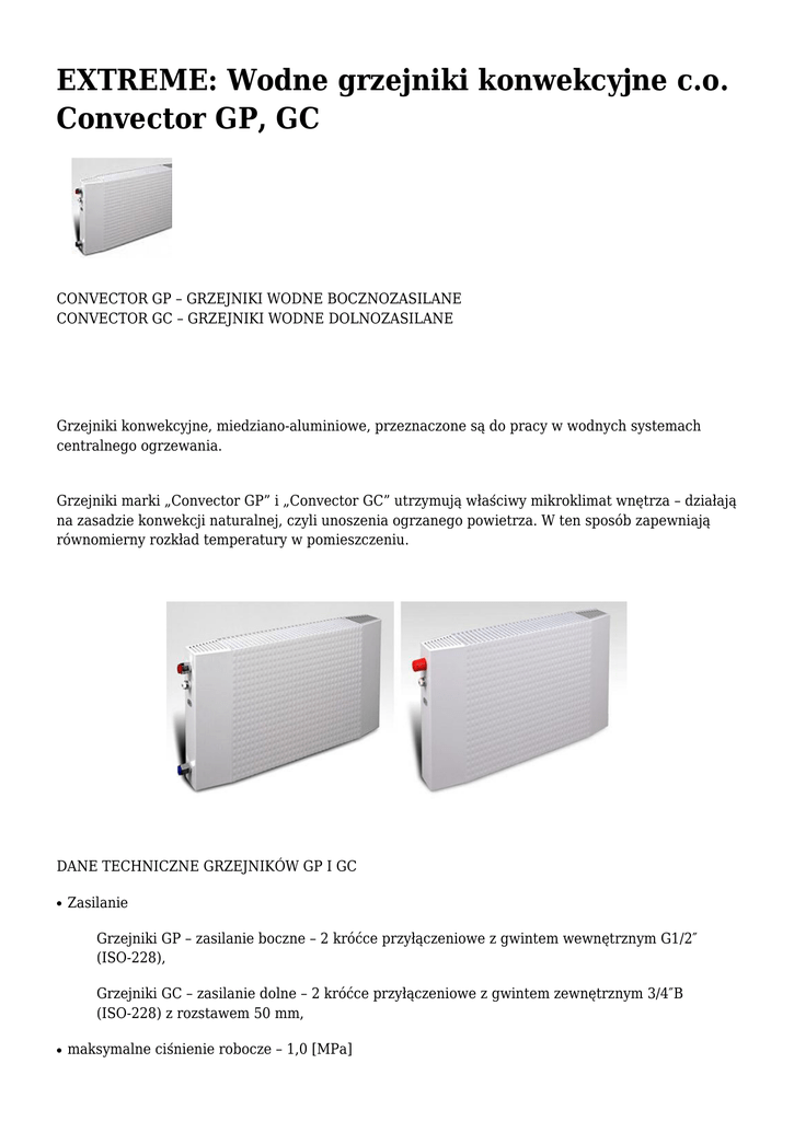 EXTREME: Wodne grzejniki konwekcyjne c.o. Convector GP, GC CONVECTOR GP – GRZEJNIKI WODNE BOCZNOZASILANE CONVECTOR GC – GRZEJNIKI WODNE DOLNOZASILANE Grzejniki konwekcyjne, miedziano-aluminiowe, przeznaczone są do pracy w wodnych systemach centralnego ogrzewania. Grzejniki marki „Convector GP” i „Convector GC” utrzymują właściwy mikroklimat wnętrza – działają na zasadzie konwekcji naturalnej, czyli unoszenia ogrzanego powietrza. W ten sposób zapewniają równomierny rozkład temperatury w pomieszczeniu. DANE TECHNICZNE GRZEJNIKÓW GP I GC ● Zasilanie Grzejniki GP – zasilanie boczne – 2 króćce przyłączeniowe z gwintem wewnętrznym G1/2″ (ISO-228), Grzejniki GC – zasilanie dolne – 2 króćce przyłączeniowe z gwintem zewnętrznym 3/4″B (ISO-228) z rozstawem 50 mm, ● maksymalne ciśnienie robocze – 1,0 [MPa] (dla grzejników GP – do 3,0 [MPa] na specjalne zamówienie) ● ● ● ● ● ● ● ● maksymalna temperatura zasilania – 100°C Grzejniki GC – posiadają wbudowany zawór termostatyczny firmy Danfoss z podłączeniem dla głowicy termostatycznej typu RTD-N (głowica termostatyczna nie wchodzi w skład wyposażenia normalnego) kolor standardowy biały (RAL 9003) – możliwość pomalowania grzejnika na dowolny kolor z palety RAL (ok.200 kolorów) mocowanie grzejnika naścienne (w zestawie komplet zawieszek do mocowana naściennego) bardzo wysoka odporność na korozję wewnętrzną i zewnętrzną ze względu na szlachetność materiałów z jakich są wykonane (miedź i aluminium) Atest Higieniczny PZH B-473/96 grzejniki spełniają warunki Europejskiej Dyrektywy Budowlanej 89/106/EWG oraz Polskich Norm zharmonizowanych (deklaracja CE) Do obliczenia mocy cieplnej grzejników dla innych parametrów zasilania niż 75/65/20°C należy zastosować współczynniki korekcyjne mocy cieplnej GP-GC SZCZEGÓŁY KONSTRUKCYJNE ● Wężownica w grzejnikach wodnych wykonana jest z miedzi, natomiast elementy ożebrowania tworzące równocześnie obudowę wykonane są z aluminium. Kontakt z wodą instalacyjną w grzejnikach Convector ma wyłącznie wężownica. Taka konstrukcja zapewnia doskonałą zgodność materiałów z instalacją wykonaną z rur miedzianych i zapewnia całkowitą odporność na korozję. ● ● Zewnętrzne powierzchnie grzejników wykonane są z aluminium i pokryte lakierami poliestrowo-epoksydowymi technologią proszkową. Zapewnia to trwałość grzejnika pracującego nawet w pomieszczeniach o podwyższonej wilgotności, np. halach basenów, łaźniach, pralniach itp. Grzejniki GP i GC o wysokości od 40 cm i długości od 70 cm są przystosowane do zainstalowania nawilżacza powietrza. Wszystkie grzejniki wodne wyposażone są w odpowietrznik. Dobór grzejników wodnych powinien być przeprowadzony na podstawie obliczenia zapotrzebowania ciepła. Wymaga to wykonania obliczeń o charakterze projektowym i powinno być przeprowadzone przez projektanta lub doświadczonego instalatora. Pobierz: Dane techniczne grzejników bocznozasilanych GP Dane techniczne grzejników dolnozasilanych GC KONTAKT EXTREME Sp. z o.o. Tel: +48 12 645 10 08 Fax: +48 12 645 10 08 Adres: ul. Kantorowicka 400 31-763 Kraków