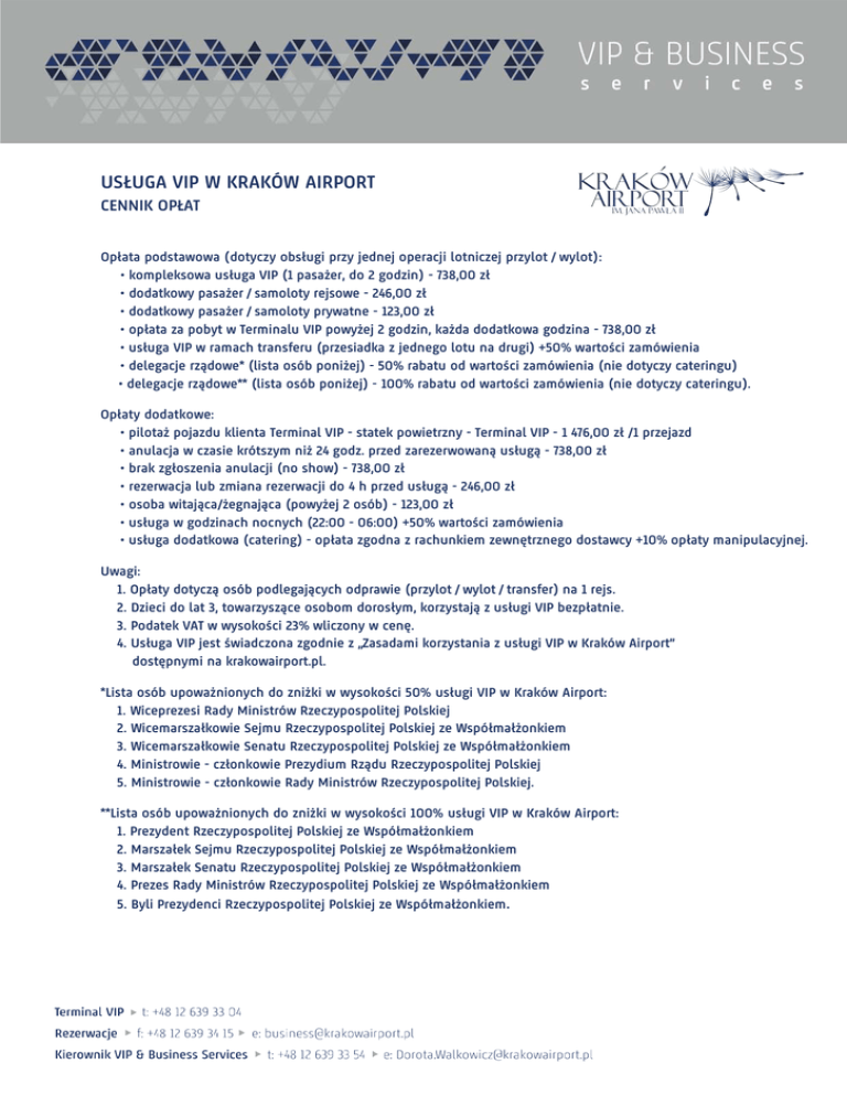 USŁUGA VIP W KRAKÓW AIRPORT CENNIK OPŁAT Opłata podstawowa (dotyczy obsługi przy jednej operacji lotniczej przylot / wylot): • kompleksowa usługa VIP (1 pasażer, do 2 godzin) - 738,00 zł • dodatkowy pasażer / samoloty rejsowe - 246,00 zł • dodatkowy pasażer / samoloty prywatne - 123,00 zł • opłata za pobyt w Terminalu VIP powyżej 2 godzin, każda dodatkowa godzina - 738,00 zł • usługa VIP w ramach transferu (przesiadka z jednego lotu na drugi) +50% wartości zamówienia • delegacje rządowe* (lista osób poniżej) - 50% rabatu od wartości zamówienia (nie dotyczy cateringu) • delegacje rządowe** (lista osób poniżej) - 100% rabatu od wartości zamówienia (nie dotyczy cateringu). Opłaty dodatkowe: • pilotaż pojazdu klienta Terminal VIP - statek powietrzny - Terminal VIP - 1 476,00 zł /1 przejazd • anulacja w czasie krótszym niż 24 godz. przed zarezerwowaną usługą - 738,00 zł • brak zgłoszenia anulacji (no show) - 738,00 zł • rezerwacja lub zmiana rezerwacji do 4 h przed usługą - 246,00 zł • osoba witająca/żegnająca (powyżej 2 osób) - 123,00 zł • usługa w godzinach nocnych (22:00 - 06:00) +50% wartości zamówienia • usługa dodatkowa (catering) - opłata zgodna z rachunkiem zewnętrznego dostawcy +10% opłaty manipulacyjnej. Uwagi: 1. Opłaty dotyczą osób podlegających odprawie (przylot / wylot / transfer) na 1 rejs. 2. Dzieci do lat 3, towarzyszące osobom dorosłym, korzystają z usługi VIP bezpłatnie. 3. Podatek VAT w wysokości 23% wliczony w cenę. 4. Usługa VIP jest świadczona zgodnie z „Zasadami korzystania z usługi VIP w Kraków Airport” dostępnymi na krakowairport.pl. *Lista osób upoważnionych do zniżki w wysokości 50% usługi VIP w Kraków Airport: 1. Wiceprezesi Rady Ministrów Rzeczypospolitej Polskiej 2. Wicemarszałkowie Sejmu Rzeczypospolitej Polskiej ze Współmałżonkiem 3. Wicemarszałkowie Senatu Rzeczypospolitej Polskiej ze Współmałżonkiem 4. Ministrowie - członkowie Prezydium Rządu Rzeczypospolitej Polskiej 5. Ministrowie - członkowie Rady Ministrów Rzeczypospolitej Polskiej. **Lista osób upoważnionych do zniżki w wysokości 100% usługi VIP w Kraków Airport: 1. Prezydent Rzeczypospolitej Polskiej ze Współmałżonkiem 2. Marszałek Sejmu Rzeczypospolitej Polskiej ze Współmałżonkiem 3. Marszałek Senatu Rzeczypospolitej Polskiej ze Współmałżonkiem 4. Prezes Rady Ministrów Rzeczypospolitej Polskiej ze Współmałżonkiem 5. Byli Prezydenci Rzeczypospolitej Polskiej ze Współmałżonkiem.