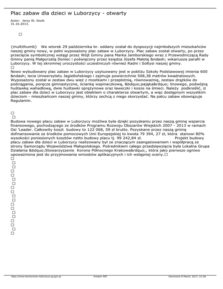 naszej gminy nowy, w pełni wyposażony plac zabaw w Luborzycy. Plac zabaw został otwarty, po przez