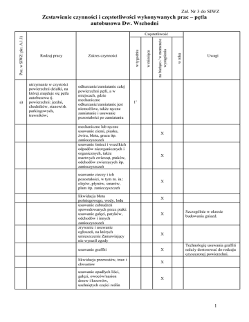 Zał. Nr 3 do SIWZ a) utrzymanie w czystości powierzchni działki, na której znajduje się pętla autobusowa tj. powierzchni: jezdni, chodników, stanowisk parkingowych, trawników; odkurzanie/zamiatanie całej powierzchni pętli, a w miejscach, gdzie mechaniczne odkurzanie/zamiatanie jest niemożliwe, także ręczne zamiatanie i usuwanie pozostałości po zamiataniu mechaniczne lub ręczne usuwanie ziemi, piasku, żwiru, błota, gruzu itp. zanieczyszczeń usuwanie śmieci i wszelkich odpadów nieorganicznych i organicznych, także martwych zwierząt, ptaków, odchodów zwierzęcych itp. zanieczyszczeń usuwanie cieczy i ich pozostałości, w tym m. in.: olejów, płynów, smarów, plam itp. zanieczyszczeń likwidacja błota pośniegowego, wody, lodu usuwanie zabrudzeń spowodowanych przez ptaki: usuwanie gałęzi, patyków, odchodów i innych zanieczyszczeń zrywanie i usuwanie ogłoszeń, na których umieszczenie Zamawiający nie wyraził zgody w roku Zakres czynności na bieżąco / w momencie wystąpienia Rodzaj pracy w miesiącu Częstotliwość w tygodniu Poz. w SIWZ: pkt. A.1.1) Zestawienie czynności i częstotliwości wykonywanych prac – pętla autobusowa Dw. Wschodni Uwagi 11 X X X X X Szczególnie w okresie budowania gniazd. X usuwanie graffiti X likwidacja przerostów, traw i chwastów X usuwanie opadłych liści, gałęzi, owoców/nasion drzew i krzewów, uschniętych części roślin X Technologię usuwania graffiti należy dostosować do rodzaju czyszczonej powierzchni. 1 b) likwidacja gołoledzi na terenie działki, na której znajduje się pętla autobusowa, w skład której wchodzą: jezdnie, chodniki, stanowiska parkingowe; posypywanie substancją zabezpieczającą przed zamarzaniem, aż do całkowitej likwidacji gołoledzi c) odśnieżanie terenu działki, na której znajduje się pętla autobusowa, w skład której wchodzą: jezdnie, chodniki, stanowiska parkingowe; odśnieżanie mechaniczne lub ręczne nawierzchni w sposób jej nie niszczący oraz składowanie odgarniętego śniegu na pryzmy, tak by nie utrudniał ruchu pojazdom i osobom korzystającym z pętli d) odśnieżanie dachu budynku ekspedycji; usunięcie pokrywy śnieżnej w sposób nie uszkadzający oczyszczanej powierzchni usunięcie sopli lodu i nawisów śnieżnych w sposób nie uszkadzający oczyszczanej powierzchni wywożenie śniegu z terenu pętli e) oczyszczanie i udrażnianie powierzchni dachu budynku ekspedycji z liści, gałęzi, nasion drzew, mułu i innych zanieczyszczeń; zebranie naniesionych zanieczyszczeń oraz ręczne lub mechaniczne udrożnienie w sposób nie powodujący uszkodzenia powierzchni. f) oczyszczanie i udrażnianie rur spustowych, kratek kanalizacyjnych z liści, gałęzi, nasion drzew, mułu i innych zanieczyszczeń; zebranie naniesionych zanieczyszczeń oraz ręczne lub mechaniczne udrożnienie w sposób nie powodujący uszkodzenia powierzchni/elementów w roku na bieżąco / w momencie wystąpienia Zakres czynności w miesiącu Rodzaj pracy w tygodniu Poz. w SIWZ: pkt. A.1.1) Częstotliwość w momencie wystąpienia opadów śniegu lub/i gołoledzi, niezależnie od wyznaczonych dni i godzin sprzątania – prace muszą zacząć się najpóźniej w 30 minut po wystąpieniu opadów śniegu lub/i gołoledzi i trwać do momentu uzyskania optymalnego stanu nawierzchni; X X Uwagi Rozstawienie do dnia 20 października na terenie pętli minimum 2 pojemników z substancją zabezpieczającą przed zamarzaniem (bezpieczną ekologicznie) zgodnie z obowiązującymi przepisami prawa. Uwaga: śnieg nie może przylegać do elewacji. W przypadku obfitych opadów śniegu i braku możliwości jego składowania – wywożenie z terenu parkingu w miejsce wskazane w stosownych aktach prawa miejscowego dla m.st. Warszawy Uwaga! Monitorowanie grubości pokrywy śnieżnej spoczywa na Wykonawcy, który zgłasza Zamawiającemu potrzebę jej usunięcia. Zrzut śniegu może odbywać się jedynie bezpośrednio do pojemnika. Wywóz śniegu bezpośrednio po skończonej pracy. Monitorowanie tworzenia się sopli lodu i nawisów śnieżnych spoczywa na Wykonawcy. Dotyczy także zadaszenia pętli autobusowej. natychmiast po wykonaniu odśnieżania dachu X Monitorowanie drożności i czystości dachu spoczywa na Wykonawcy, który zgłasza Zamawiającemu potrzebę ich oczyszczenia. X Monitorowanie drożności i czystości rynien, rur spustowych, kratek kanalizacyjnych itd. spoczywa na Wykonawcy, który zgłasza Zamawiającemu potrzebę ich oczyszczenia. 2 h) i) j) k) czyszczenie elementów wyposażenia pętli; pielęgnacja zieleni; opróżnianie oraz wymiana worków plastikowych w koszach na śmieci; mycie koszy na śmieci; sprzątanie pomieszczeń biurowych, kas odkurzenie / umycie i wypolerowanie elementów wyposażenia Koszenie trawy nie częściej niż 2 razy w miesiącu. 3 2 23 usuwanie śmieci z koszy z uwzględnieniem zasady selektywnej zbiórki śmieci 7 X każdorazowa wymiana worków plastikowych na odpady w koszach 7 X umycie i wypolerowanie zewnętrznej powierzchni koszy na śmieci 7 X umycie z użyciem środka dezynfekującego całej powierzchni koszy z zewnątrz i wewnątrz odkurzanie i mycie podłóg (wytarcie do sucha) Uwagi Uwaga: Należy zachować szczególną ostrożność na elementy wrażliwe na zalanie. Stojaki rowerowe należy czyścić w godzinach, w których nie są użytkowane. 12 pielęgnacja trawników: odchwaszczanie, uzupełnianie ubytków, rekultywacja trawnikóww miejscach przedeptów i zabezpieczanie przed ponownym uszkodzeniem, nawożenie, koszenie trawników na wysokość 3-5 cm z podkoszeniem przy elementach architektonicznych i wyposażenia, krawężnikach, drzewach, skupinach krzewów, rabatach itp. wraz z całkowitym zgrabieniem i utylizacją skoszonej trawy bezpośrednio po jej skoszeniu pielęgnacja rabat: spulchnianie gleby oraz ręczne usunięcie chwastów (również samosiewów drzew) wraz z systemem korzeniowym, odcięcie brzegów rabaty od trawnika, uzupełniani