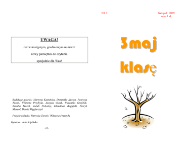 NR 2 UWAGA! Już w następnym, grudniowym numerze nowy pamiętnik do czytania specjalnie dla Was! Redakcja gazetki: Martyna Kamińska, Dominika Kustra, Patrycja Turoń, Wiktoria Przybyła, Justyna Guzik, Weronika Grzybek, Natalia Marek, Jakub Pobożny, Klaudiusz Bugajski, Patryk Marcol, Dawid Węglarczyk Projekt okładki: Patrycja Turoń i Wiktoria Przybyła Opiekun: Julia Lipińska -12- listopad 2009 cena 1 zł 3maj klasę -2- Sprostowanie! W poprzednim numerze gazetki niestety podaliśmy błędne informacje dotyczące wyczynów naszych sportowców. Serdecznie za ten błąd przepraszamy i prostujemy: 23 września odbyły się sztafetowe biegi przełajowe o Mistrzostwo Szkół Podstawowych Miasta Cieszyna. Reprezentacja dziewcząt „Trójki” zajęła I miejsce (skład: Justyna Guzik, Zofia Waliczek, Katarzyna Kula, Kornelia Sadowska, Wiktoria Mołdrzyk i Izabela Piechaczek), chłopcy uplasowali się na II miejscu (skład: Zachariasz Stawowiak, Aleksander Bujak, Przemysław Romański, Jakub Węglorz, Łukasz Widenka, Paweł Żeliński). . Następnym etapem dla dziewcząt były zawody na szczeblu powiatowym w Chybiu, na których zajęły III miejsce i awansowały do zawodów rejonowych, które miały miejsce 8 października w Łące. Tym razem dziewczyny zajęły zaszczytne IV miejsce. (skład reprezentacji dziewcząt na 2 i 3 szczeblu: Justyna Guzik, Zofia Waliczek, Wiktoria Mołdrzyk, Kornelia Sadowska, Izabela Piechaczek i Paulina Lankocz). Drużynę dziewcząt przygotowywała pani Janina Hajek, zaś chłopców pan Grzegorz Wanat. Informujemy, że zakończony i rozstrzygnięty został coroczny konkurs „Jesienne impresje”. A oto laureaci, którym serdecznie gratulujemy!: Kategoria literacka: I miejsce – Weronika Grzybek 6c II miejsce – Anna Hatalak 6d III miejsce – Natalia Wiśniewska 4b Kategoria plastyczna: I miejsce – Kacper Szczepaniec 5a II miejsce – Martyna Brzóska 6b III miejsce – Anna Szurman 5b Kategoria fotograficzna: I miejsce – Marta Chmiel 5b II miejsce – Zofia Waliczek 5b III miejsce – Aleksandra Stańko 6b Rozwiąż zagadki 1. Jedzie autobus, w którym znajduje się 10 pasażerów. Na pierwszym przystanku wsiada 7 osób, a wysiada 6. Na drugim wsiada 15, a wysiada 6. Na trzecim wsiada 7, wysiada 3. Na następnym wsiada 5, wysiada 1, a na ostatnim wsiada 3, wysiada 9 osób. Ilu pasażerów znajduje się w autobusie po odjeździe z ostatniego przystanka? 2. Tomek ma swój ogród. Ma w nim 5 jabłoni, 7 grusz, a czereśni ma 13. W ostatnim miesiącu ściął 5 drzew. Ile Tomek ma drzew? 3. Marek ma PSP. Kupił 3 gry, a 2 dostał w prezencie. Wieczorem oglądał program, w którym można było zamówić gry. Kupił ich 8, ale na drugi dzień zgubił 1. Ile Marek ma gier? Rozwiązania zagadek zapisz czytelnie na kuponie: Rozwiązanie: 1. …………………………………… 2. ……………………………………. 3. …………………………………… Imię i nazwisko ………………………………..kl………………………. Wycięty kupon wraz z hasłem prosimy zanieść do biblioteki szkolnej. Powodzenia! - Bo od dawna nie widzę kieszonkowego, które miałeś mi dawać. -11- Przygotował: Dawid Węglarczyk 12 listopada odbył się w naszej szkole pierwszy etap międzyszkolnego konkursu recytatorsko – autorskiego pt. „Bawimy się słowami” dla klas 1-3. Laureatami zostali: I miejsce – Jakub Niedziołka 3b II miejsce – Jan Waszut 2b III miejsce – Bartłomiej Podsiadły 3b Zwycięzcy wezmą udział w kolejnym, międzyszkolnym już etapie konkursu w Alternatywnej Szkole Podstawowej w Cieszynie. Trzymamy za Was kciuki!! Wyróżnienie w etapie szkolnym otrzymały następujące osoby: Natalia Bałon, Anna Jasińska, Kinga Kłoda, Szymon Legierski, Szymon Marczak i Nikola Sierant. Rozstrzygnięto również konkursy związane ze Świętem Patrona naszej szkoły, czyli konkurs na najciekawszą gazetkę o Korczaku oraz konkurs pt. „Znam Korczaka”. Oto laureaci pierwszego z nich: I miejsce – Maria Trójszczak 4b II miejsce – Klaudia Czyż 5b III miejsce – Magdalena Czempiel 4a Natomiast w drugim czołowe miejsca zajęli: I miejsce – Weronika Grzybek 6c II miejsce – Karolina Szalbot 6c III miejsce – Arkadiusz Piotrowski 6a Gratulujemy! A co nowego w bibliotece? W związku z ukazaniem się w księgarniach 5 listopada kolejnych przygód Mikołajka oraz 50 urodzinami tego lubianego przez Was bohatera, bibliotekę odwiedzili uczniowie klas 4c i 5b, którzy wysłuchali fragmentu książki, obejrzeli prezentację multimedialną i poznali ciekawostki związane z Mikołajkiem. Wszystkie poprzednie tomy tej niezwykłej serii dostępne są oczywiście w naszej bibliotece szkolnej. Dla uczniów młodszych natomiast zorganizowana została w listopadzie wystawka książeczek o Martynce, a z okazji Święta Patrona w drugiej połowie listopada organizowane były lekcje biblioteczne pod hasłem „Idee Janusza Korczaka rozumiane Zapłakany Jasio przychodzi do domu z zakończenia roku szkolnego. Mama pyta, co się stało, a Jasio na to: - Spóźniłem się do szkoły i dla mnie zostało najgorsze świadectwo ;o( *** - Mamo, a tata mnie zbił dwa razy!! - A czemu aż dwa? - Raz jak mu pokazałem świadectwo, a drugi jak zobaczył, że to jego. *** Przychodzi Jasio do Ani: - Pożyczysz mi pięć złotych? - Nie pożyczę! - Dlaczego? - Bo mi nie oddasz! - Skąd wiesz? - Bo ci nie pożyczę. *** Mama pyta Jasia: - Synku, dlaczego płaczesz? - Bo śniło mi się, że szkoła się paliła! - Nie płacz, to tylko sen… - Właśnie dlatego płaczę!! *** Jasio rozmawia z ojcem: - Tatusiu, chyba muszę iść do okulisty. - Dlaczego? -10- współcześnie”. Można też było zobaczyć wystawkę dzieł tego niezwykłego człowieka. -3- -4- Poradnik Nastolatków W tym miesiącu radzimy co zrobić, żeby zawsze ładnie wyglądać… Utrzymuj dobrą kondycję, systematycznie ćwicz, na zajęciach w-f spróbuj dać z siebie wszystk