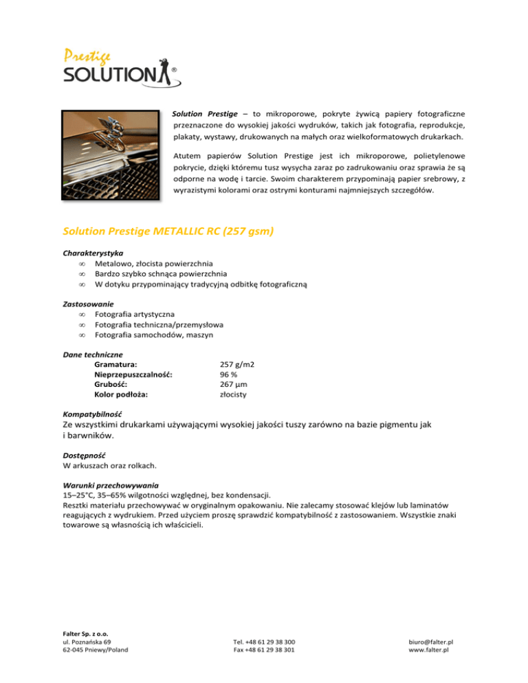 Solution Prestige – to mikroporowe, pokryte żywicą papiery fotograficzne przeznaczone do wysokiej jakości wydruków, takich jak fotografia, reprodukcje, plakaty, wystawy, drukowanych na małych oraz wielkoformatowych drukarkach. Atutem papierów Solution Prestige jest ich mikroporowe, polietylenowe pokrycie, dzięki któremu tusz wysycha zaraz po zadrukowaniu oraz sprawia że są odporne na wodę i tarcie. Swoim charakterem przypominają papier srebrowy, z wyrazistymi kolorami oraz ostrymi konturami najmniejszych szczegółów. Solution Prestige METALLIC RC (257 gsm) Charakterystyka • Metalowo, złocista powierzchnia • Bardzo szybko schnąca powierzchnia • W dotyku przypominający tradycyjną odbitkę fotograficzną Zastosowanie • Fotografia artystyczna • Fotografia techniczna/przemysłowa • Fotografia samochodów, maszyn Dane techniczne Gramatura: Nieprzepuszczalność: Grubość: Kolor podłoża: 257 g/m2 96 % 267 μm złocisty Kompatybilność Ze wszystkimi drukarkami używającymi wysokiej jakości tuszy zarówno na bazie pigmentu jak i barwników. Dostępność W arkuszach oraz rolkach. Warunki przechowywania 15–25°C, 35–65% wilgotności względnej, bez kondensacji. Resztki materiału przechowywać w oryginalnym opakowaniu. Nie zalecamy stosować klejów lub laminatów reagujących z wydrukiem. Przed użyciem proszę sprawdzić kompatybilność z zastosowaniem. Wszystkie znaki towarowe są własnością ich właścicieli. Falter Sp. z o.o. ul. Poznańska 69 62-045 Pniewy/Poland Tel. +48 61 29 38 300 Fax +48 61 29 38 301 [email protected] www.falter.pl