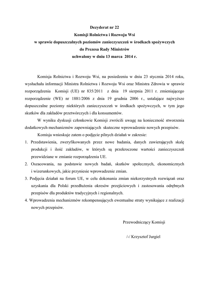 Dezyderat nr 22 Komisji Rolnictwa i Rozwoju Wsi w sprawie dopuszczalnych poziomów zanieczyszczeń w środkach spożywczych do Prezesa Rady Ministrów uchwalony w dniu 13 marca 2014 r. Komisja Rolnictwa i Rozwoju Wsi, na posiedzeniu w dniu 23 stycznia 2014 roku, wysłuchała informacji Ministra Rolnictwa i Rozwoju Wsi oraz Ministra Zdrowia w sprawie rozporządzenia Komisji (UE) nr 835/2011 z dnia 19 sierpnia 2011 r. zmieniającego rozporządzenie (WE) nr 1881/2006 z dnia 19 grudnia 2006 r., ustalające najwyższe dopuszczalne poziomy niektórych zanieczyszczeń w środkach spożywczych, w tym jego skutków dla zakładów przetwórczych i dla konsumentów. W wyniku dyskusji członkowie Komisji zwrócili uwagę na konieczność stworzenia dodatkowych mechanizmów zapewniających skuteczne wprowadzenie nowych przepisów. Komisja wnioskuje zatem o podjęcie pilnych działań w zakresie: 1. Przedstawienia, zweryfikowanych przez nowe badania, danych zawierających skalę produkcji i ilość zakładów, w których są przekroczone wartości zanieczyszczeń przewidziane w zmianie rozporządzenia UE. 2. Oszacowania, na podstawie nowych badań, skutków społecznych, ekonomicznych i wizerunkowych, jakie przyniesie wprowadzenie zmian. 3. Podjęcia działań na forum UE, w celu dokonania zmian niekorzystnych rozwiązań oraz uzyskania dla Polski przedłużenia okresów przejściowych i zastosowania odrębnych przepisów dla produktów tradycyjnych i regionalnych. 4. Wprowadzenia mechanizmów rekompensujących ewentualne straty wynikające z realizacji nowych przepisów. Przewodniczący Komisji /-/ Krzysztof Jurgiel