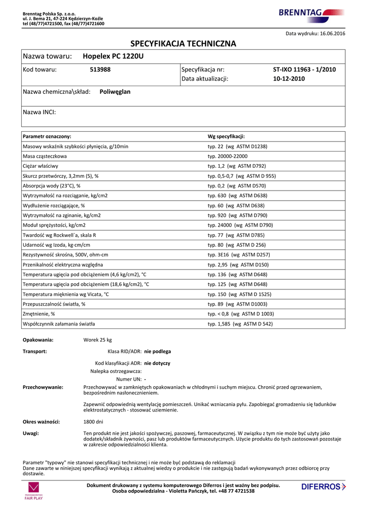 Brenntag Polska Sp. z.o.o. ul. J. Bema 21, 47-224 Kędzierzyn-Koźle tel (48/77)4721500, fax (48/77)4721600 Data wydruku: 16.06.2016 SPECYFIKACJA TECHNICZNA Nazwa towaru: Hopelex PC 1220U Kod towaru: 513988 Nazwa chemiczna\skład: Specyfikacja nr: Data aktualizacji: ST-IXO 11963 - 1/2010 10-12-2010 Poliwęglan Nazwa INCI: Parametr oznaczony: Wg specyfikacji: Masowy wskaźnik szybkości płynięcia, g/10min typ. 22 (wg ASTM D1238) Masa cząsteczkowa typ. 20000-22000 Ciężar właściwy typ. 1,2 (wg ASTM D792) Skurcz przetwórczy, 3,2mm (5), % typ. 0,5-0,7 (wg ASTM D 955) Absorpcja wody (23°C), % typ. 0,2 (wg ASTM D570) Wytrzymałość na rozciąganie, kg/cm2 typ. 630 (wg ASTM D638) Wydłużenie rozciągające, % typ. 60 (wg ASTM D638) Wytrzymałość na zginanie, kg/cm2 typ. 920 (wg ASTM D790) Moduł sprężystości, kg/cm2 typ. 24000 (wg ASTM D790) Twardość wg Rockwell`a, skala R typ. 77 (wg ASTM D785) Udarność wg Izoda, kg·cm/cm typ. 80 (wg ASTM D 256) Rezystywność skrośna, 500V, ohm-cm typ. 3E16 (wg ASTM D257) Przenikalność elektryczna względna typ. 2,95 (wg ASTM D150) Temperatura ugięcia pod obciążeniem (4,6 kg/cm2), °C typ. 136 (wg ASTM D648) Temperatura ugięcia pod obciążeniem (18,6 kg/cm2), °C typ. 125 (wg ASTM D648) Temperatura mięknienia wg Vicata, °C typ. 150 (wg ASTM D 1525) Przepuszczalność światła, % typ. 89 (wg ASTM D1003) Zmętnienie, % typ. < 0,8 (wg ASTM D 1003) Współczynnik załamania światła typ. 1,585 (wg ASTM D 542) Opakowania: Worek 25 kg Transport: Przechowywanie: Klasa RID/ADR: nie podlega Kod klasyfikacji ADR: nie dotyczy Nalepka ostrzegawcza: Numer UN: Przechowywać w zamkniętych opakowaniach w chłodnymi i suchym miejscu. Chronić przed ogrzewaniem, bezpośrednim nasłonecznieniem. Zapewnić odpowiednią wentylację pomieszczeń. Unikać wzniacania pyłu. Zapobiegać gromadzeniu się ładunków elektrostatycznych - stosować uziemienie. Okres ważności: 1800 dni Uwagi: Ten produkt nie jest jakości spożywczej, paszowej, farmaceutycznej. W związku z tym nie może być użyty jako dodatek/składnik żywności, pasz lub produktów farmaceutycznych. Użycie produktu do tych zastosowań pozostaje w zakresie odpowiedzialności klienta. Parametr "typowy" nie stanowi specyfikacji technicznej i nie może być podstawą do reklamacji Dane zawarte w niniejszej specyfikacji wynikają z aktualnej wiedzy o produkcie i nie zastępują badań wykonywanych przez odbiorcę przy dostawie. Dokument drukowany z systemu komputerowego Diferros i jest ważny bez podpisu. Osoba odpowiedzialna - Violetta Pańczyk, tel. +48 77 4721538