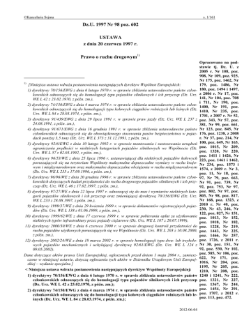 ©Kancelaria Sejmu s. 1/161 Dz.U. 1997 Nr 98 poz. 602 USTAWA z dnia 20 czerwca 1997 r. Prawo o ruchu drogowym1) 1) [Niniejsza ustawa wdraża postanowienia następujących dyrektyw Wspólnot Europejskich: 1) dyrektywy 70/156/EWG z dnia 6 lutego 1970 r. w sprawie zbliżenia ustawodawstw państw członkowskich odnoszących się do homologacji typu pojazdów silnikowych i ich przyczep (Dz. Urz. WE L 42 z 23.02.1970, z późn. zm.), 2) dyrektywy 74/150/EWG z dnia 4 marca 1974 r. w sprawie zbliżenia ustawodawstw państw członkowskich odnoszących się do homologacji typu kołowych ciągników rolniczych lub leśnych (Dz. Urz. WE L 84 z 28.03.1974, z późn. zm.), 3) dyrektywy 91/439/EWG z dnia 29 lipca 1991 r. w sprawie praw jazdy (Dz. Urz. WE L 237 z 24.08.1991, z późn. zm.), 4) dyrektywy 91/671/EWG z dnia 16 grudnia 1991 r. w sprawie zbliżenia ustawodawstw państw członkowskich odnoszących się do obowiązkowego stosowania pasów bezpieczeństwa w pojazdach poniżej 3,5 tony (Dz. Urz. WE L 373 z 31.12.1991, z późn. zm.), 5) dyrektywy 92/6/EWG z dnia 10 lutego 1992 r. w sprawie montowania i zastosowania urządzeń ograniczenia prędkości w niektórych kategoriach pojazdów silnikowych we Wspólnocie (Dz. Urz. WE L 57 z 02.03.1992, z późn. zm.), 6) dyrektywy 96/53/WE z dnia 25 lipca 1996 r. ustanawiającej dla niektórych pojazdów kołowych poruszających się na terytorium Wspólnoty maksymalne dopuszczalne wymiary w ruchu krajowym i międzynarodowym oraz maksymalne dopuszczalne obciążenia w ruchu międzynarodowym (Dz. Urz. WE L 235 z 17.09.1996, z późn. zm.), 7) dyrektywy 96/96/WE z dnia 20 grudnia 1996 r. w sprawie zbliżenia ustawodawstw państw członkowskich dotyczących badań przydatności do ruchu drogowego pojazdów silnikowych i ich przyczep (Dz. Urz. WE L 46 z 17.02.1997, z późn. zm.), 8) dyrektywy 97/27/WE z dnia 22 lipca 1997 r. odnoszącej się do mas i wymiarów niektórych kategorii pojazdów silnikowych i ich przyczep oraz zmieniającej dyrektywę 70/156/EWG (Dz. Urz. WE L 233 z 28.08.1997, z późn. zm.), 9) dyrektywy 1999/37/WE z dnia 29 kwietnia 1999 r. w sprawie dokumentów rejestracyjnych pojazdów (Dz. Urz. WE L 138 z 01.06.1999, z późn. zm.), 10) dyrektywy 1999/62/WE z dnia 17 czerwca 1999 r. w sprawie pobierania opłat za użytkowanie niektórych typów infrastruktury przez pojazdy ciężarowe (Dz. Urz. WE L 187 z 20.07.1999), 11) dyrektywy 2000/30/WE z dnia 6 czerwca 2000 r. w sprawie drogowej kontroli przydatności do ruchu pojazdów użytkowych poruszających się we Wspólnocie (Dz. Urz. WE L 203 z 10.08.2000, z późn. zm.), 12) dyrektywy 2002/24/WE z dnia 18 marca 2002 r. w sprawie homologacji typu dwu- lub trzykołowych pojazdów mechanicznych i uchylającej dyrektywę 92/61/EWG (Dz. Urz. WE L 124 z 09.05.2002). Dane dotyczące aktów prawa Unii Europejskiej, ogłoszonych przed dniem 1 maja 2004 r., zamieszczone w niniejszej ustawie, dotyczą ogłoszenia tych aktów w Dzienniku Urzędowym Unii Europejskiej – wydanie specjalne.] < Niniejsza ustawa wdraża postanowienia następujących dyrektyw Wspólnoty Europejskiej: 1) dyrektywy 70/156/EWG z dnia 6 lutego 1970 r. w sprawie zbliżenia ustawodawstw państw członkowskich odnoszących się do homologacji typu pojazdów silnikowych i ich przyczep (Dz. Urz. WE L 42 z 23.02.1970, z późn. zm.); 2) dyrektywy 74/150/EWG z dnia 4 marca 1974 r. w sprawie zbliżenia ustawodawstw państw członkowskich odnoszących się do homologacji typu kołowych ciągników rolniczych lub leśnych (Dz. Urz. WE L 84 z 28.03.1974, z późn. zm.); 2012-06-04 Opracowano na podstawie tj. Dz. U. z 2005 r. Nr 108, poz. 908, Nr 109, poz. 925, Nr 175, poz. 1462, Nr 179, poz. 1486, Nr 180, poz. 1494 i 1497, z 2006 r. Nr 17, poz. 141, Nr 104, poz. 708 i 711, Nr 190, poz. 1400, Nr 191, poz. 1410, Nr 235, poz. 1701, z 2007 r. Nr 52, poz. 343, Nr 57, poz. 381, Nr 99, poz. 661, Nr 123, poz. 845, Nr 176, poz. 1238, z 2008 r. Nr 37, poz. 214, Nr 100, poz. 649, Nr 163, poz. 1015, Nr 209, poz. 1320, Nr 220, poz. 1411 i 1426, Nr 223, poz. 1461 i 1462, Nr 234, poz. 1573 i 1574, z 2009 r. Nr 3, poz. 11, Nr 18, poz. 97, Nr 79, poz. 663, Nr 91, poz. 739, Nr 92, poz. 753, Nr 97, poz. 802, Nr 97, poz. 803, Nr 98, poz. 817, Nr 168, poz. 1323, z 2010 r. Nr 40, poz. 230, Nr 43, 246, Nr 122, poz. 827, Nr 151, poz. 1013, Nr 152, poz. 1018, Nr 182, poz. 1228, Nr 219, poz. 1443, Nr 225, poz. 1466, Nr 257, poz. 1726, z 2011 r. Nr 30, poz. 151, Nr 92, poz. 530, Nr 102, poz. 585, Nr 106, poz. 622, Nr 171, poz. 1016, Nr 204, poz. 1195, Nr 205, poz. 1210, Nr 208, poz. 1240 i 1241, Nr 222, poz. 1321, Nr 227, poz. 1367, Nr 244, poz. 1454, Nr 291, poz. 1707, z 2012 r. poz. 113, poz. 472. ©Kancelaria Sejmu s. 2/161 Dział I Przepisy ogólne Art. 1. 1. Ustawa określa: 1) zasady ruchu na drogach publicznych, w strefach zamieszkania oraz w strefach ruchu; 2) zasady i warunki dopuszczenia pojazdów do tego ruchu; [3) wymagania w stosunku do osób kierujących pojazdami i innych uczestników tego ruchu;] <3) wymagania w stosunku do innych uczestników ruchu niż kierujący pojazdami;> 4) zasady i warunki kontroli ruchu drogowego. 2. Przepisy ustawy stosuje się również do ruchu odbywającego się poza miejscami wymienionymi w ust. 1 pkt 1, w zakresie: 1) koniecznym dla uniknięcia zagrożenia bezpieczeństwa osób; 2) wynikającym ze znaków i sygnałów drogowych. 3) dyrektywy 91/671/EWG z dnia 16 grudnia 1991 r. w sprawie zbliżenia ustawodawstw państw członkowskich odnoszących się do obowiązkowego stosowania pasów bezpieczeństwa w pojazdach poniżej 3,5 tony (Dz. Urz. WE L 373 z 31.12.1991, z późn. zm.), 4) dyrektywy 92/6/EWG z dnia 10 lutego 1992 r. w sprawie montowania i zastosowania urządzeń ograniczenia prędkości w niektórych kategoriach pojazdów mechanicznych we Wspólnocie (Dz. Urz. WE L 57 z 02.03.1992, z późn. zm.); 5) dyrektywy 96/53/WE z dnia 25 lipca 1996 r. ustanawiającej dla niektórych pojazdów drogowych poruszającyc