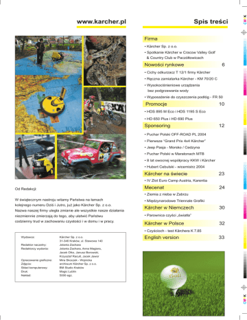 Spis treści www.karcher.pl Firma • Kärcher Sp. z o.o. • Spotkanie Kärcher w Cracow Valley Golf & Country Club w Paczółtowicach Nowości rynkowe 6 • Cichy odkurzacz T 12/1 firmy Kärcher • Ręczna zamiatarka Kärcher - KM 70/20 C • Wysokociśnieniowe urządzenia bez podgrzewania wody • Wyposażenie do czyszczenia podłóg - FR 50 Promocje 10 • HDS 895 M Eco i HDS 1195 S Eco • HD 650 Plus i HD 690 Plus Sponsoring 12 • Puchar Polski OFF-ROAD PL 2004 • Pierwsze “Grand Prix 4x4 Kärcher” • Jeep Pasja - Morsko / Cedzyna • Puchar Polski w Maratonach MTB • 8 lat owocnej współpracy KKW i Kärcher • Hubert Cebulski - wicemistrz 2004 Kärcher na świecie 23 • IV Zlot Euro Camp Austria, Karentia Mecenat Od Redakcji: 24 • Ziemia z nieba w Zabrzu W świątecznym nastroju witamy Państwa na łamach kolejnego numeru Dziś i Jutro, już jako Kärcher Sp. z o.o. Nazwa naszej firmy uległa zmianie ale wszystkie nasze działania • Międzynarodowe Triennale Grafiki Kärcher w Niemczech niezmiennie zmierzają do tego, aby ułatwić Państwu • Parownica czyści „światła” codzienny trud w zachowaniu czystości i w domu i w pracy. Kärcher w Polsce 30 32 • Czyścioch - test Kärchera K 7.85 Wydawca: Redaktor naczelny: Redaktorzy wydania: Opracowanie graficzne: Zdjęcia: Skład komputerowy: Druk: Nakład: Kärcher Sp. z o.o. 31-346 Kraków, ul. Stawowa 140 Jolanta Zachara Jolanta Zachara, Anna Magiera, Jacek Olko, Janusz Borowski, Krzysztof Racułt, Jacek Jawor Mira Skoczek - Wojnicka archiwum Kärcher Sp. z o.o. BM Studio Kraków Magic Lublin 5000 egz. English version 33