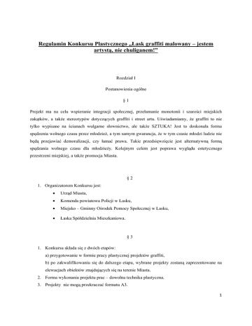 Regulamin Konkursu Plastycznego „Łask graffiti malowany – jestem artystą, nie chuliganem!” Rozdział I Postanowienia ogólne §1 Projekt ma na celu wspieranie integracji społecznej, przełamanie monotonii i szarości miejskich zakątków, a także stereotypów dotyczących graffiti i street artu. Uświadamiamy, że graffiti to nie tylko wypisane na ścianach wulgarne słownictwo, ale także SZTUKA! Jest to doskonała forma spędzenia wolnego czasu przez młodzież, a tym samym gwarancja, że w tym czasie młodzi ludzie nie będą przejawiać demoralizacji, czy łamać prawa. Takie przedsięwzięcie jest alternatywną formą spędzania wolnego czasu dla młodzieży. Kolejnym celem jest poprawa wyglądu estetycznego przestrzeni miejskiej, a także promocja Miasta. §2 1. Organizatorem Konkursu jest: • Urząd Miasta, • Komenda powiatowa Policji w Łasku, • Miejsko – Gminny Ośrodek Pomocy Społecznej w Łasku, • Łaska Spółdzielnia Mieszkaniowa. §3 1. Konkursu składa się z dwóch etapów: a) przygotowanie w formie pracy plastycznej projektów graffiti, b) po zakwalifikowaniu się do dalszego etapu, wybrane projekty zostaną zaprezentowane na elewacjach obiektów znajdujących się na terenie Miasta. 2. Forma wykonania projektu prac – dowolna technika plastyczna. 3. Projekty nie mogą przekraczać formatu A3. 1 4. Uczestnicy przygotowują i dostarczają projekty na do siedziby KPP w Łasku przy ul. 9 maja 32/36 do dnia 4 maja 2012 r. Projekt należy odpowiednio podpisać - każda praca musi mieć dołączoną (doklejoną z tyłu pracy) metrykę. 5. Prace w swojej tematyce powinny nawiązywać do kultury, tradycji Łasku oraz otoczenia, w którym miałyby powstać. 6. Z uwagi na wielkość i kształt powierzchni, przewidzianych przez organizatorów do aranżacji wybranych prac (ogrodzenia posesji, zewnętrzne ściany budynków), ostateczny format prac przyjętych do realizacji, zostanie dostosowany do lokalnych warunków. Miejsca zostaną wyznaczone przez Organizatorów w późniejszym terminie. § 4 1. Konkurs przeprowadza Komisja Konkursu powołana przez Organizatora. 2. W skład Komisji wchodzą: przedstawiciele KPP Łask, Urzędu Miasta, MGOPS w Łasku i Łaskiej Spółdzielni Mieszkaniowej. 3. Powyższy skład może być uzupełniony o przedstawicieli sponsorów oraz właścicieli obiektów. 4. We wszystkich kwestiach spornych decyduje Komisja Konkursowa. 5. Decyzje Komisji są ostateczne. 6. Materiały konkursowe opracowuje Kapituła Konkursu. 7. Dokumentację Konkursu prowadzi Kapituła Konkursu. §5 Konkurs jest skierowany do dzieci i młodzieży uczącej się na terenie Miasta i Gminy Łask. Rozdział II Przebieg Konkursu §6 1. Do Konkursu można zgłosić się indywidualnie lub w zespołach. Każdy indywidualny bądź grupowy uczestnik Konkursu może nadesłać maksymalnie dwie oryginalne prace. 2. Na Konkurs nie można przesyłać prac adaptowanych (kopiowanych), do których zgłaszający nie ma odpowiednich praw autorskich. 2 3. Każda praca musi mieć dołączoną (doklejoną z tyłu pracy) metrykę zawierającą następujące dane: • imię i nazwisko autora (autorów grupowych) pracy • wiek • klasa i szkoła, do której uczęszcza autor pracy • adres • numery telefonów kontaktowych, e-mail • podpisane oświadczenie o zgodzie opiekuna na uczestnictwo w konkursie osoby niepełnoletniej • podpisane oświadczenie o zapoznaniu się uczestnika z regulaminem konkursu i przystaniem na zawarte w nim warunki. §7 1. Termin składania i nadsyłania prac do 4 maja 2012 r. na adres Komendy Powiatowej Policji w Łasku, 98-100 Łask ul. 9 maja 32/36 do Zespołu ds. Nieletnich z dopiskiem: Konkurs plastyczny „Łask graffiti malowany – jestem artystą, nie chuliganem!” 2. Do dnia 12 maja br. Komisja Konkursu dokona wyboru projektów, które zostaną umieszczone w technice graffiti na terenie Miasta i zaprezentowane w lokalnej prasie. 3. Wyboru zwycięzców konkursu dokona Komisja Konkursu. 4. Informacje o wynikach i przebiegu konkursu zostaną opublikowane na stronach www organizatorów oraz w lokalnej prasie do dnia 12 maja 2012 r. 5. O terminach przekazania nagrody głównej oraz upominków dla uczestników Konkursu Organizator poinformuje w terminie późniejszym. Rozdział III Postanowienia końcowe §8 1. Organizator przewiduje: a. Jedną nagrodę główną, którą będzie wykonanie projektu w formie graffiti na wskazanej przez Organizatora ścianie Miasta – dla autora zwycięskiej pracy, wybranej przez Komisję spośród wszystkich zgłoszonych projektów /orientacyjny koszt związany z namalowaniem jednego zwycięskiego projektu w formie graffiti (farby, niezbędne akcesoria-maski ochronne, rękawiczki, nagrody-puchar, dyplom) to około 500 zł / ściana, mur o wymiarach 7 x 2,5 metra – ściana na budynku przy ul. 3 Narutowicza w pobliżu Publicznego Gimnazjum Nr 1 w Łasku, w centrum miasta usytuowana przy drodze wojewódzkiej nr 483 lub miejsce wskazane przez ŁSM albo władze Miasta/. b. Nagrody rzeczowe dla uczestników konkursu. 6. Nagrodę główną i nagrody rzeczowe w Konkursie określa i zapewnia Organizator i wręczy je zwycięzcom konkursu podczas spotkania – termin zostanie ustalony i podany do informacji uczestników. 8. Organizator konkursu uzyskuje do nadesłanych dzieł prawo własności i prawa autorskie. 9. Organizator zastrzega sobie możliwość zmiany niniejszego regulaminu. 10. Uczestnicy Konkursu wyrażają zgodę na opublikowanie imienia i nazwiska oraz miejscowości zamieszkania. 11. Uczestnicy Konkursu przejmują od Organizatora Konkursu pełną odpowiedzialność z tytułu roszczeń osób trzecich, jakie mogą powstać w związku z ewentualnym naruszeniem jakichkolwiek praw tych osób do zgłoszonych prac. 12. Dane osobowe uczestników Konkursu są zbierane i przetwarzane w celu wywiązania się Organizatora z jego zobowiązań jako Organizatora Konkursu. 13. Organizator zastrzega sobie prawo rejestracji kon