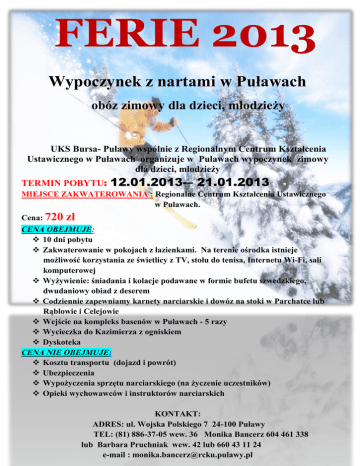 FERIE 2013 Wypoczynek z nartami w Puławach obóz zimowy dla dzieci, młodzieży UKS Bursa- Puławy wspólnie z Regionalnym Centrum Kształcenia Ustawicznego w Puławach organizuje w Puławach wypoczynek zimowy dla dzieci, młodzieży TERMIN POBYTU: 12.01.2013-– 21.01.2013 MIEJSCE ZAKWATEROWANIA : Regionalne Centrum Kształcenia Ustawicznego w Puławach. Cena: 720 zł CENA OBEJMUJE: 10 dni pobytu Zakwaterowanie w pokojach z łazienkami. Na terenie ośrodka istnieje możliwość korzystania ze świetlicy z TV, stołu do tenisa, Internetu Wi-Fi, sali komputerowej Wyżywienie: śniadania i kolacje podawane w formie bufetu szwedzkiego, dwudaniowy obiad z deserem Codziennie zapewniamy karnety narciarskie i dowóz na stoki w Parchatce lub Rąblowie i Celejowie Wejście na kompleks basenów w Puławach - 5 razy Wycieczka do Kazimierza z ogniskiem Dyskoteka CENA NIE OBEJMUJE: Kosztu transportu (dojazd i powrót) Ubezpieczenia Wypożyczenia sprzętu narciarskiego (na życzenie uczestników) Opieki wychowawców i instruktorów narciarskich KONTAKT: ADRES: ul. Wojska Polskiego 7 24-100 Puławy TEL: (81) 886-37-05 wew. 36 Monika Bancerz 604 461 338 lub Barbara Pruchniak wew. 42 lub 660 43 11 24 e-mail : [email protected]